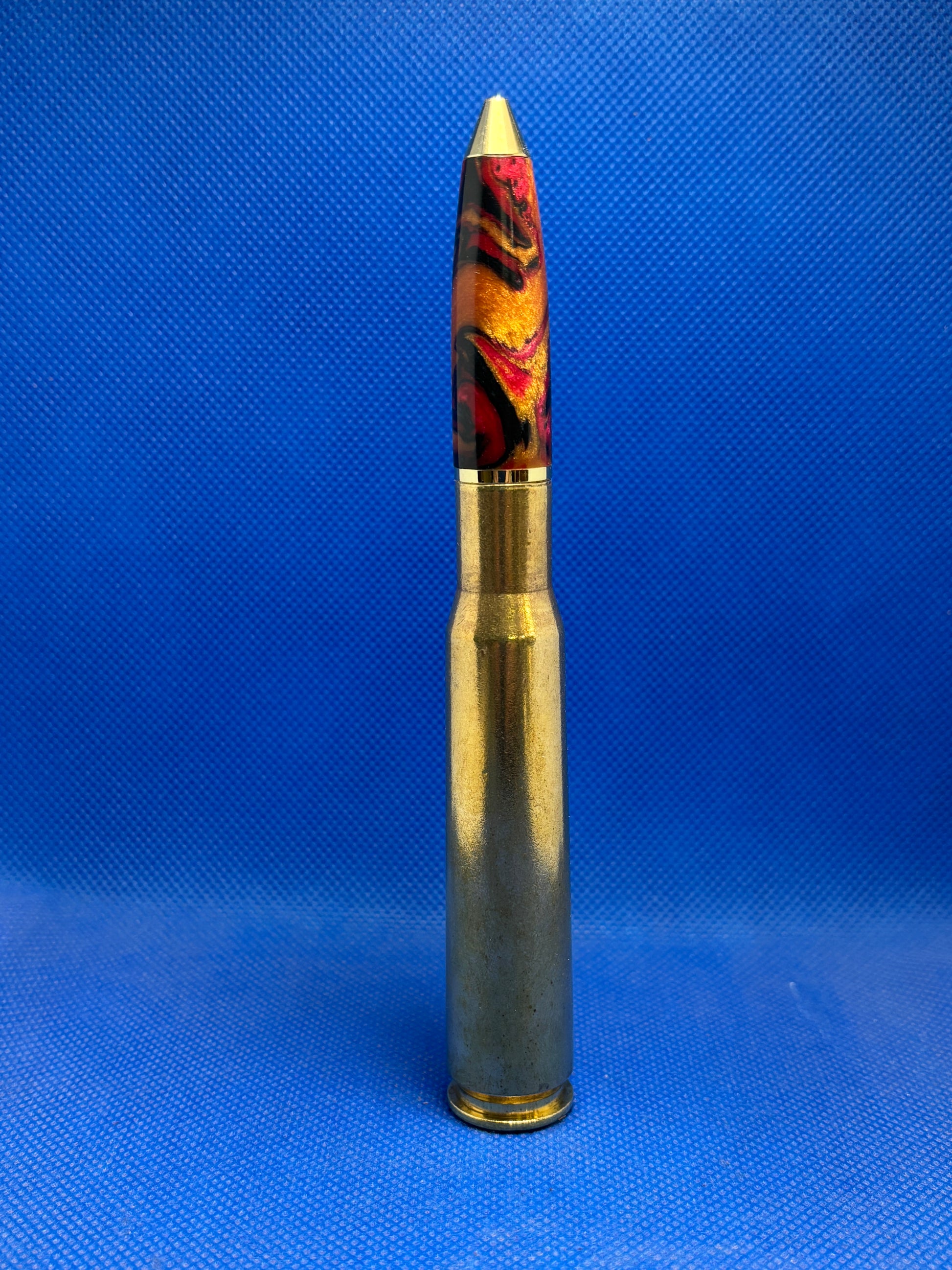 This pen is made from a real, once-fired .50 caliber shell with a Pearlux "Banshee" nib section. First developed for the Browning heavy machine gun in the late 1910's, it first entered military service as an anti-aircraft round in WW1. This pen uses a standard Cross style refill and comes with a case the resembles a tactical rifle case.