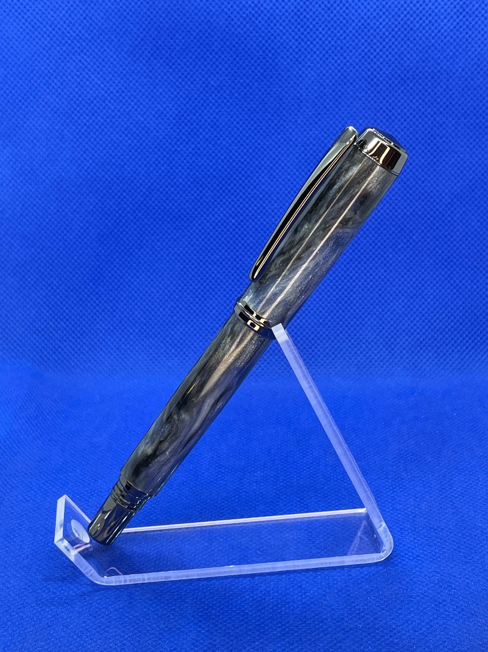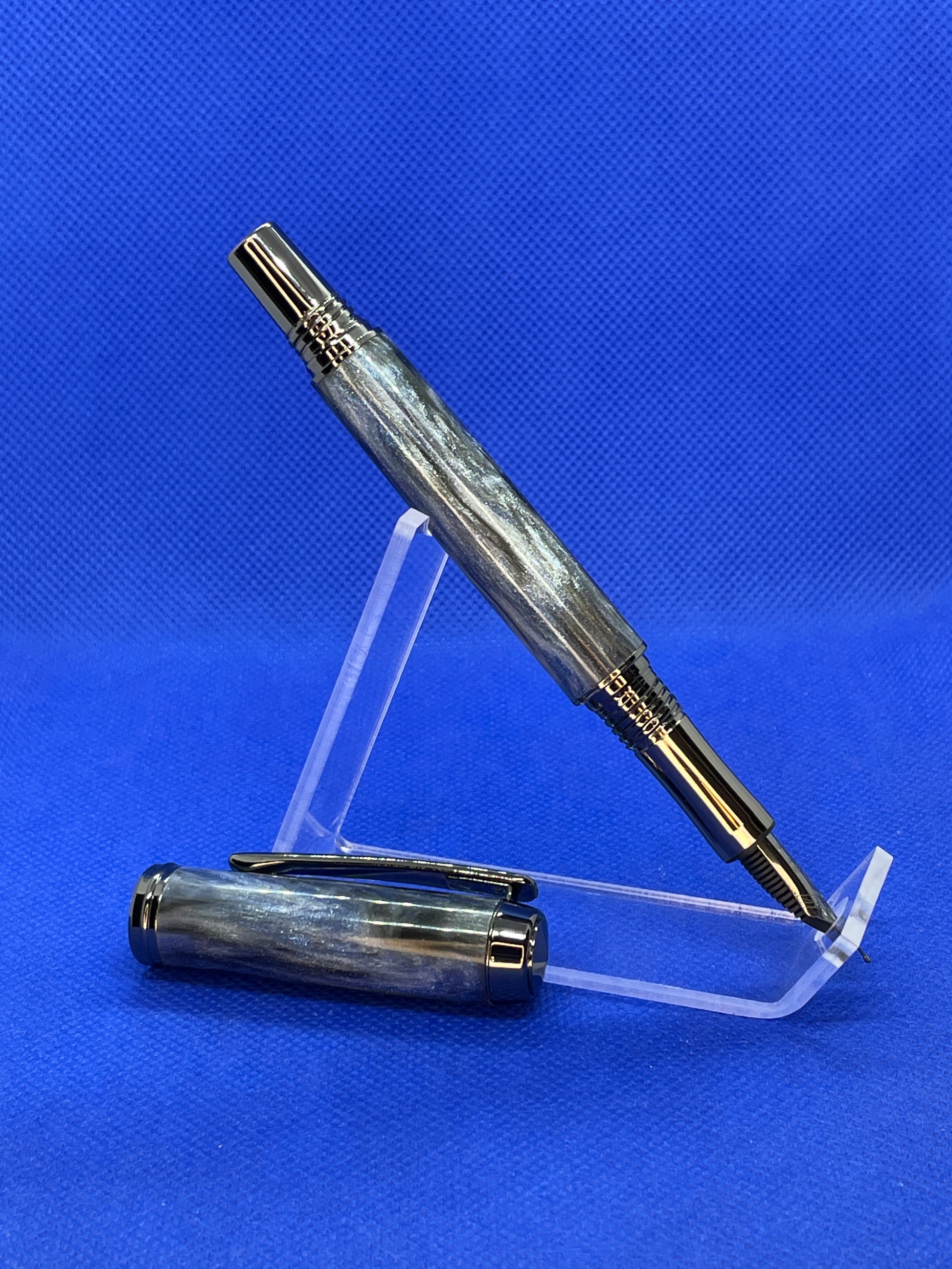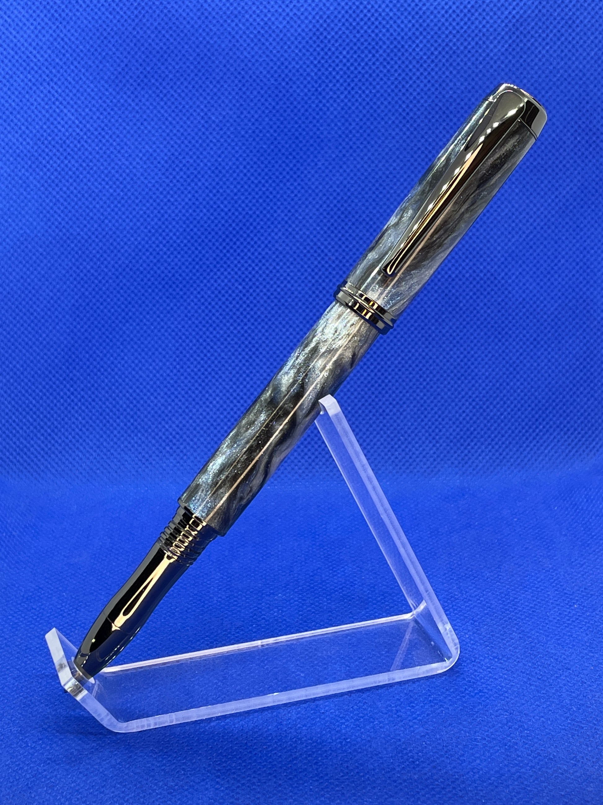 This unique pen easily converts from a Rollerball to a Fountain pen simply by switching the rollerball nib and cartridge for the included fountain pen nib and cartridge. It features a "Diamondcast- 30 Below" body and Black Titanium trim. "Diamondcast" is an resin material with suspended diamond particles throughout. Combined with the swirled colours, the diamonds give amazing sparkle and brilliance to the pen. This is stunning pen that offers flexibility in writing styles. It uses either standard "Schmidt" style rollerball refills, universal fountain pen cartridges, or an included ink pump for filling from an ink bottle.