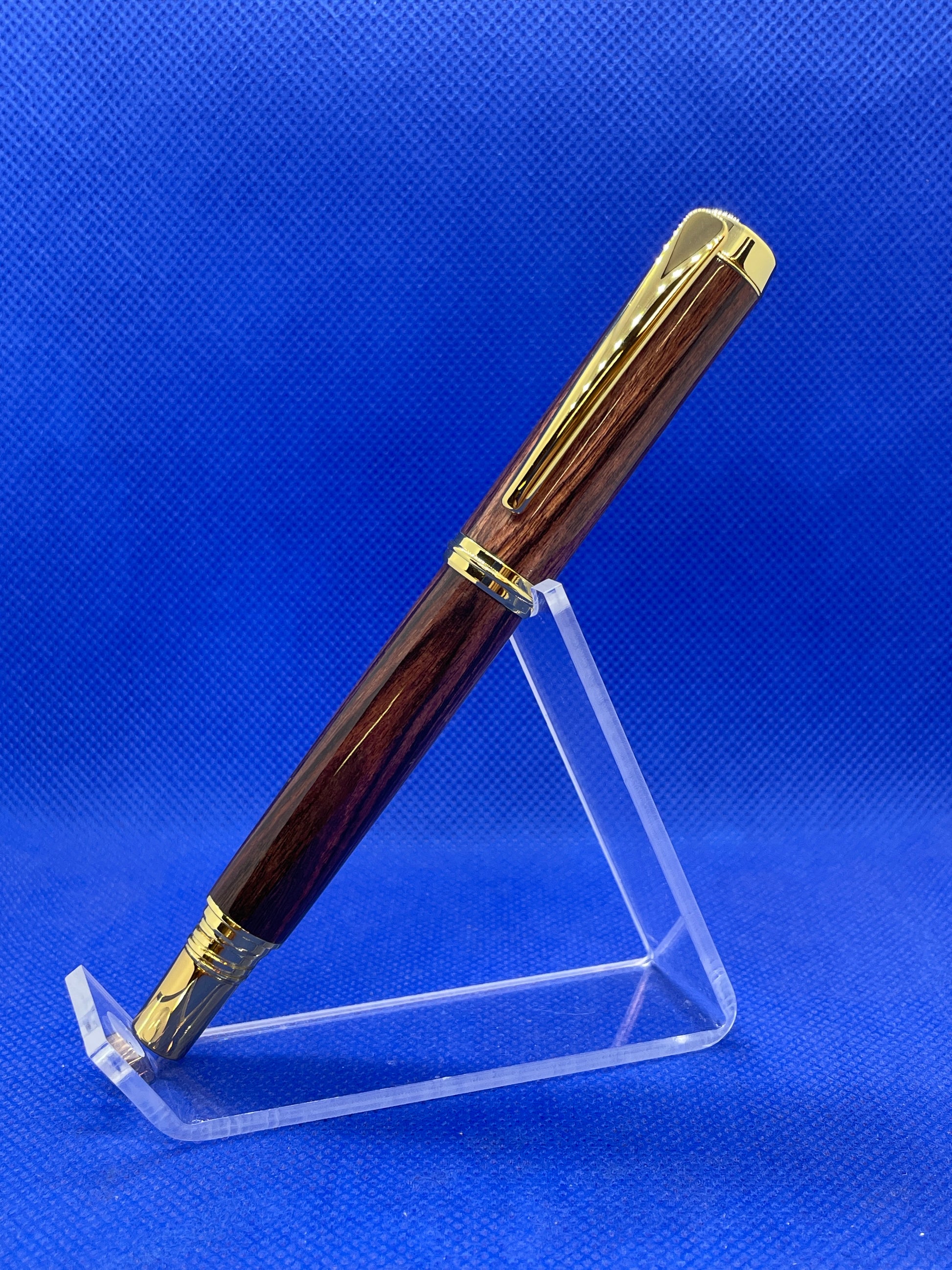 This Algonquin fountain pen features a dramatic Kingwood body and gold trim. This is a stunning pen that uses either universal fountain pen cartridges, or an included ink pump for filling from an ink bottle.