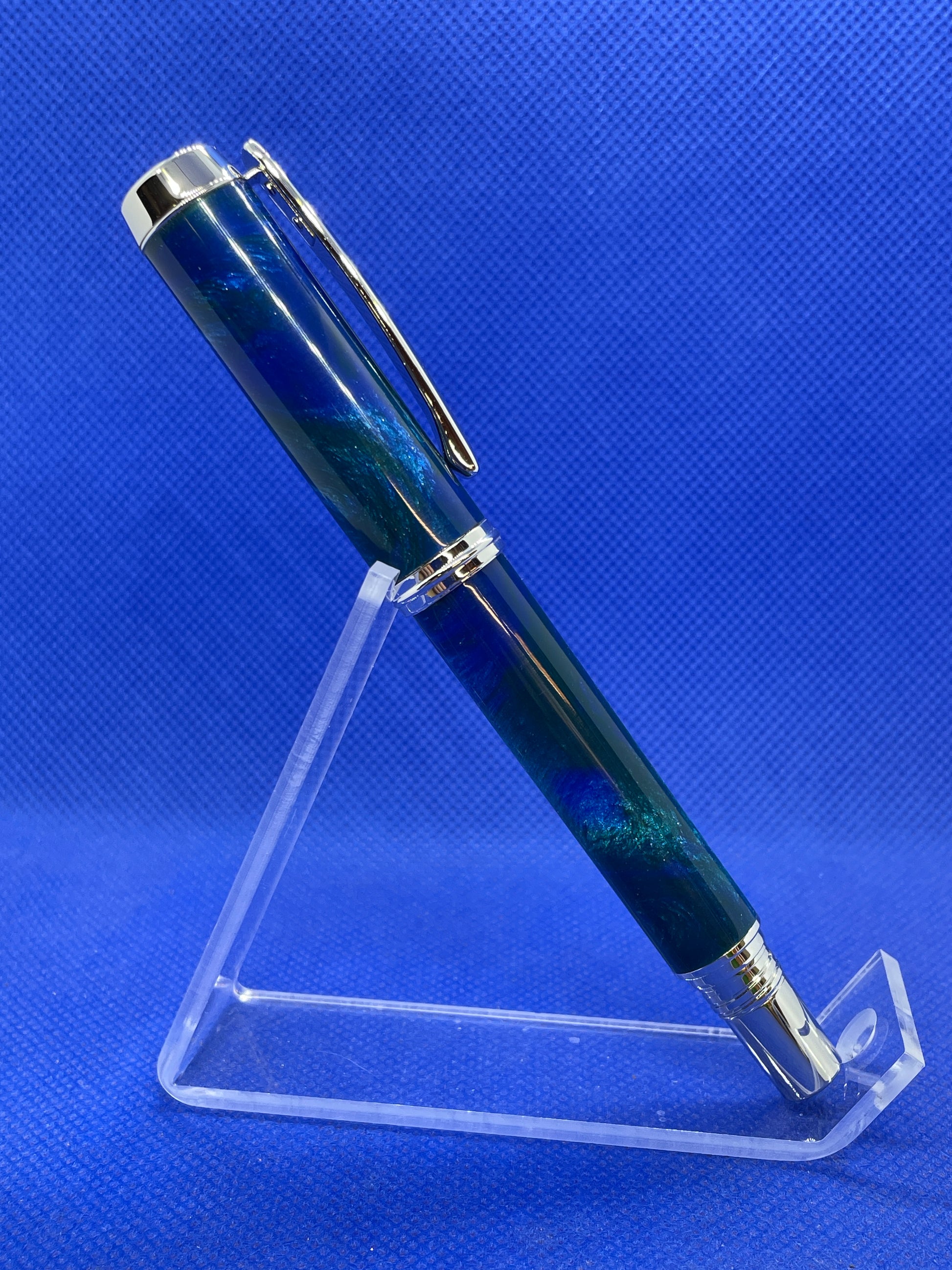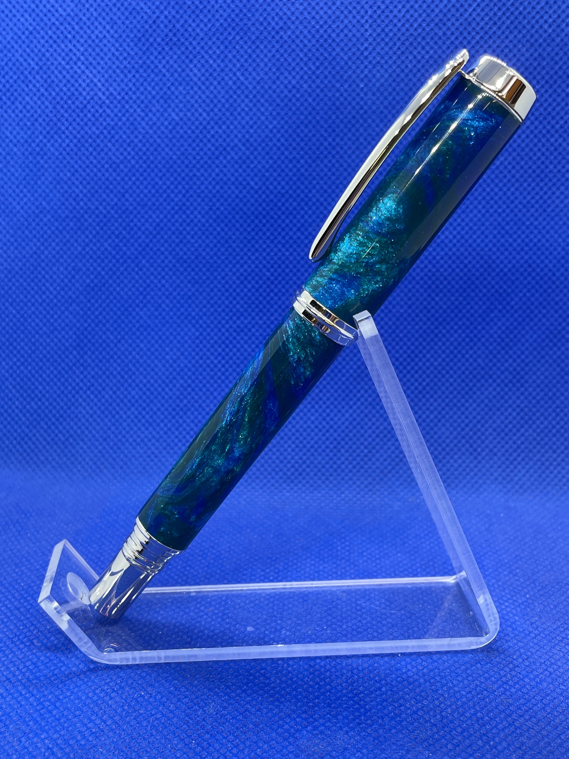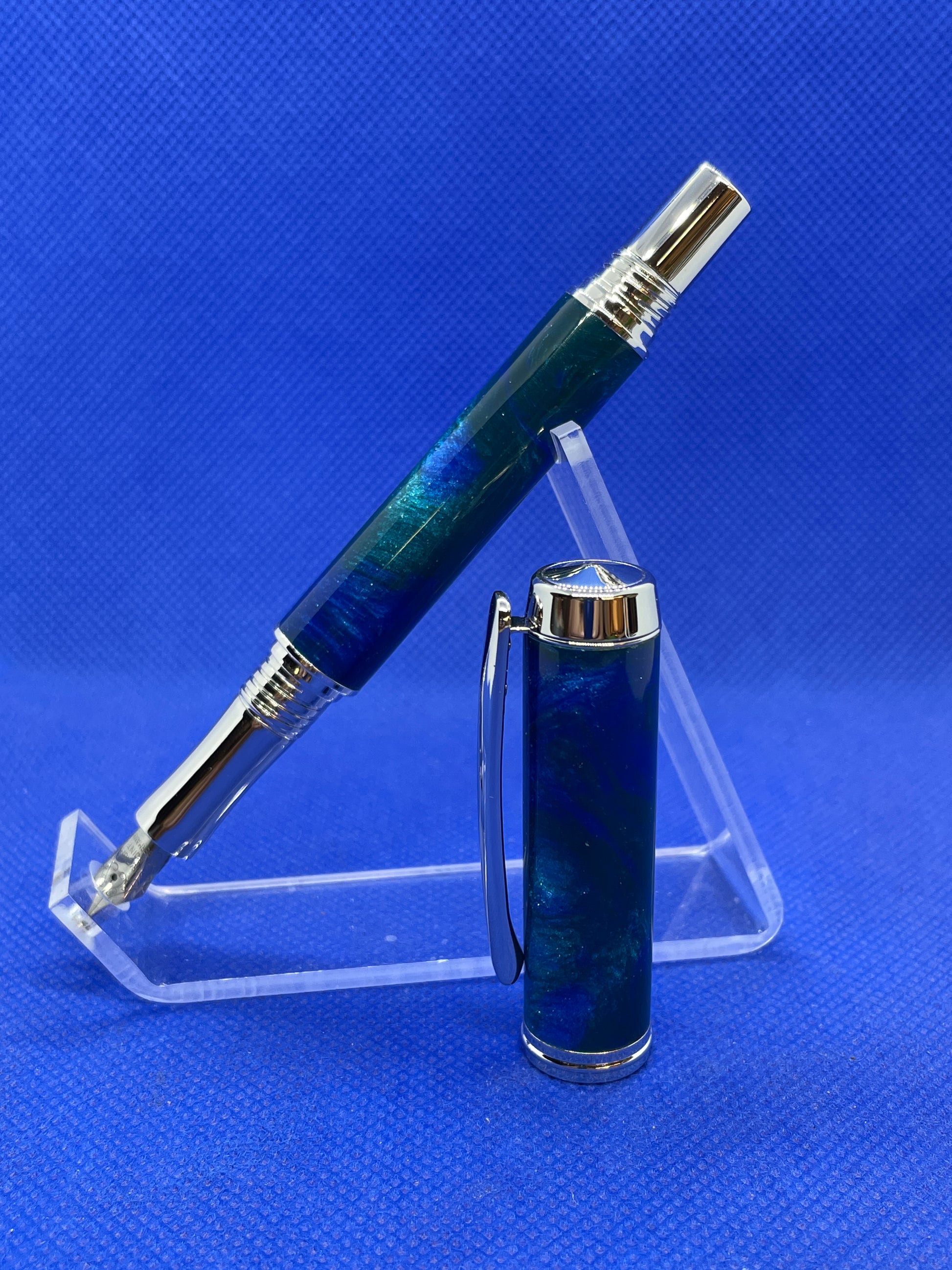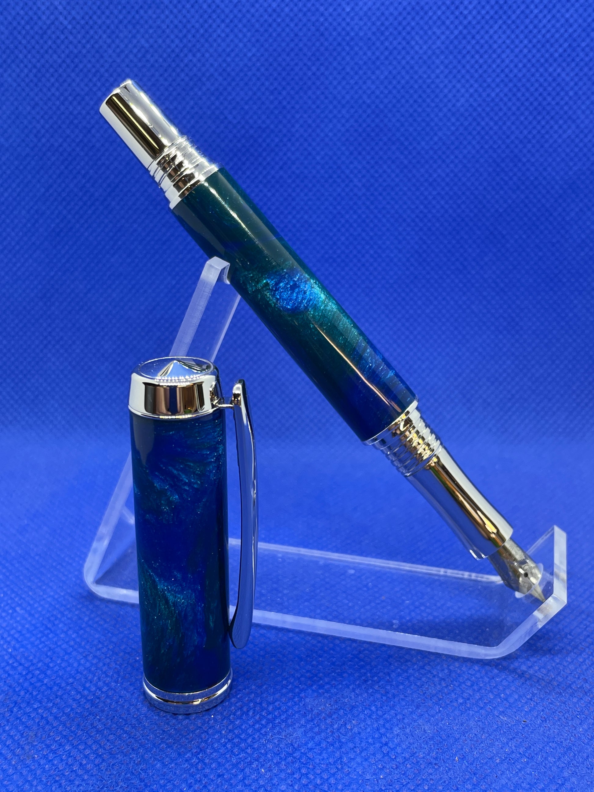This beautiful fountain pen features a vibrant "Lava Lamp Water Nymph" resin body and brilliant Rhodium trim. This is stunning pen that uses either universal fountain pen cartridges, or an included ink pump for filling from an ink bottle.