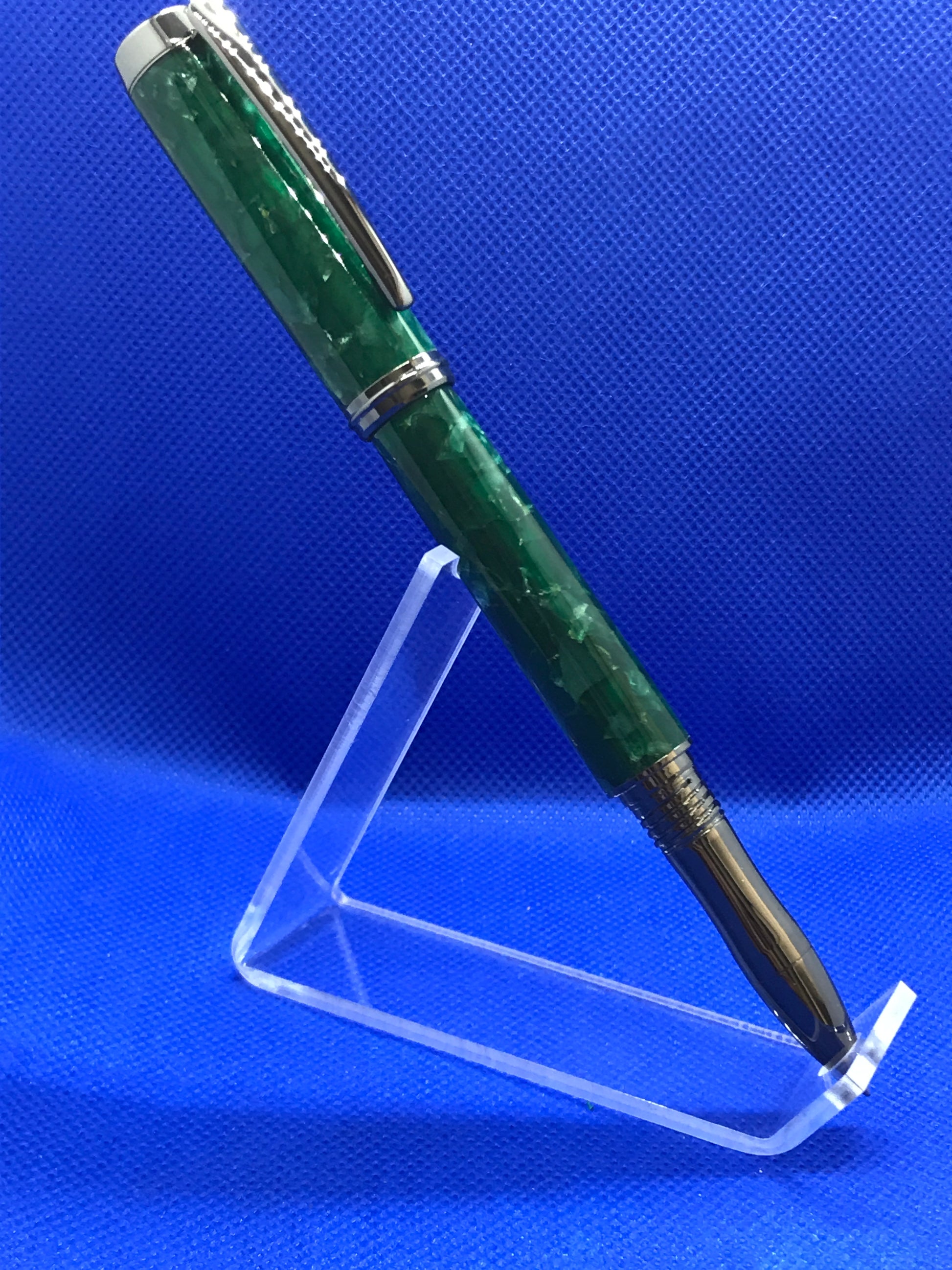 This unique pen easily converts from a Rollerball to a Fountain pen simply by switching the rollerball nib and cartridge for the included fountain pen nib and cartridge. It features a "Green Dragon Scale" body and Black Titanium trim. This is stunning pen that offers flexibility in writing styles. It uses either standard "Schmidt" style rollerball refills, universal fountain pen cartridges, or an included ink pump for filling from an ink bottle.
