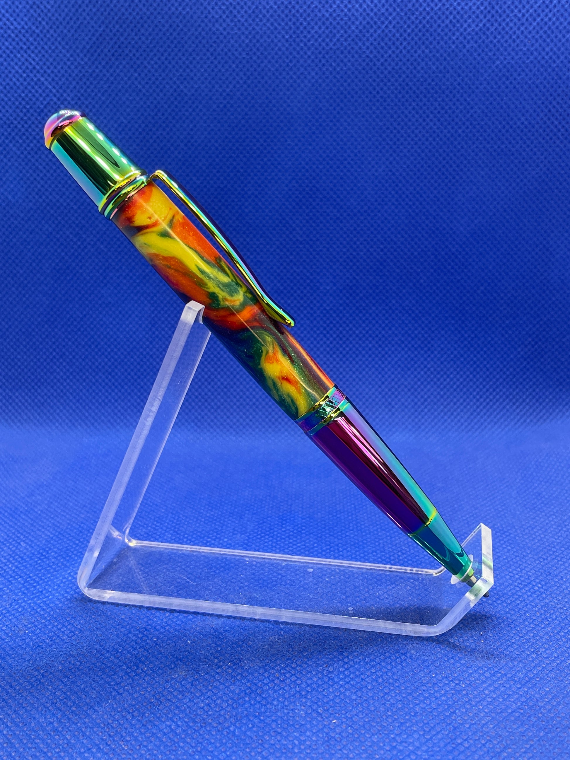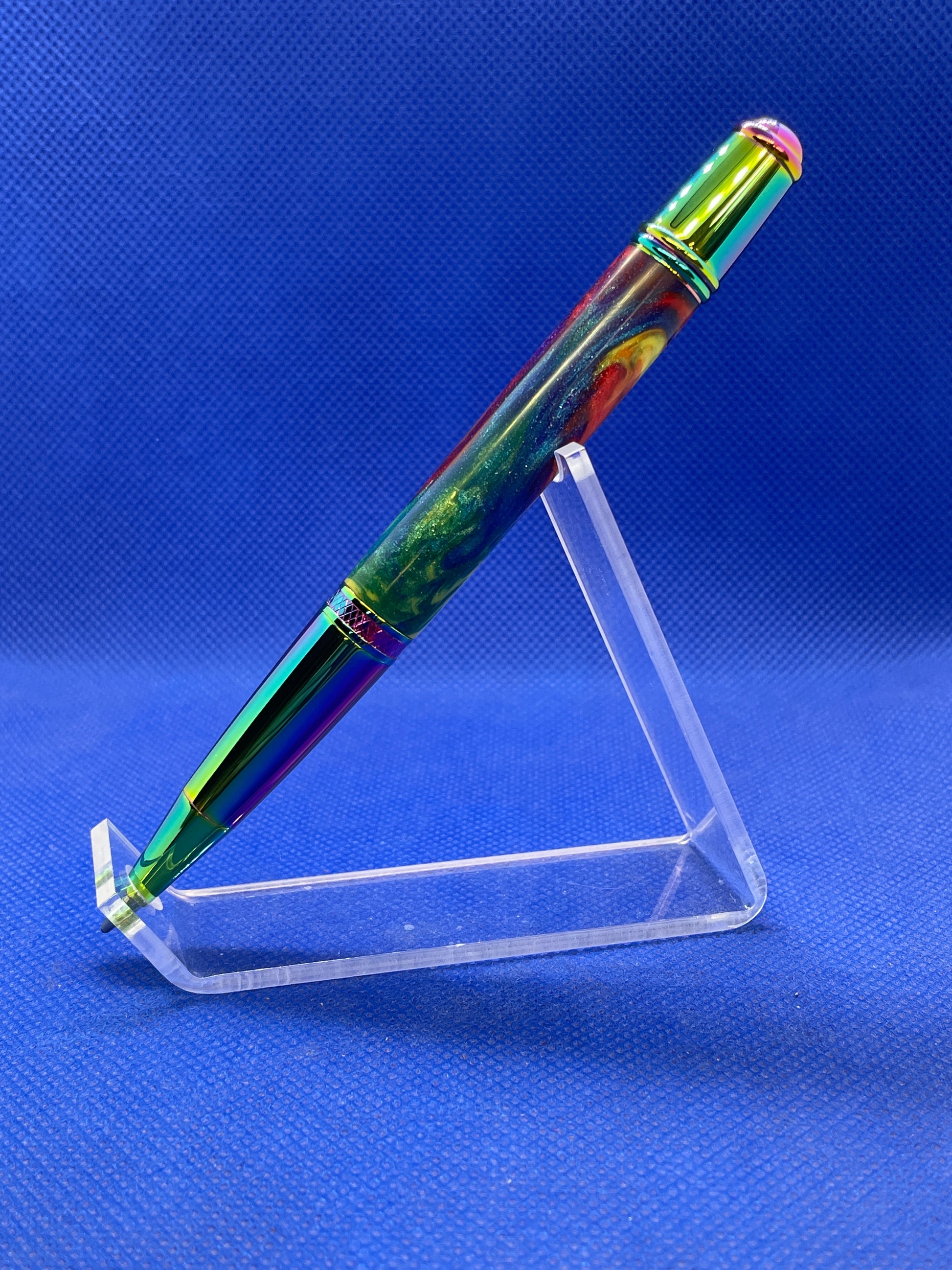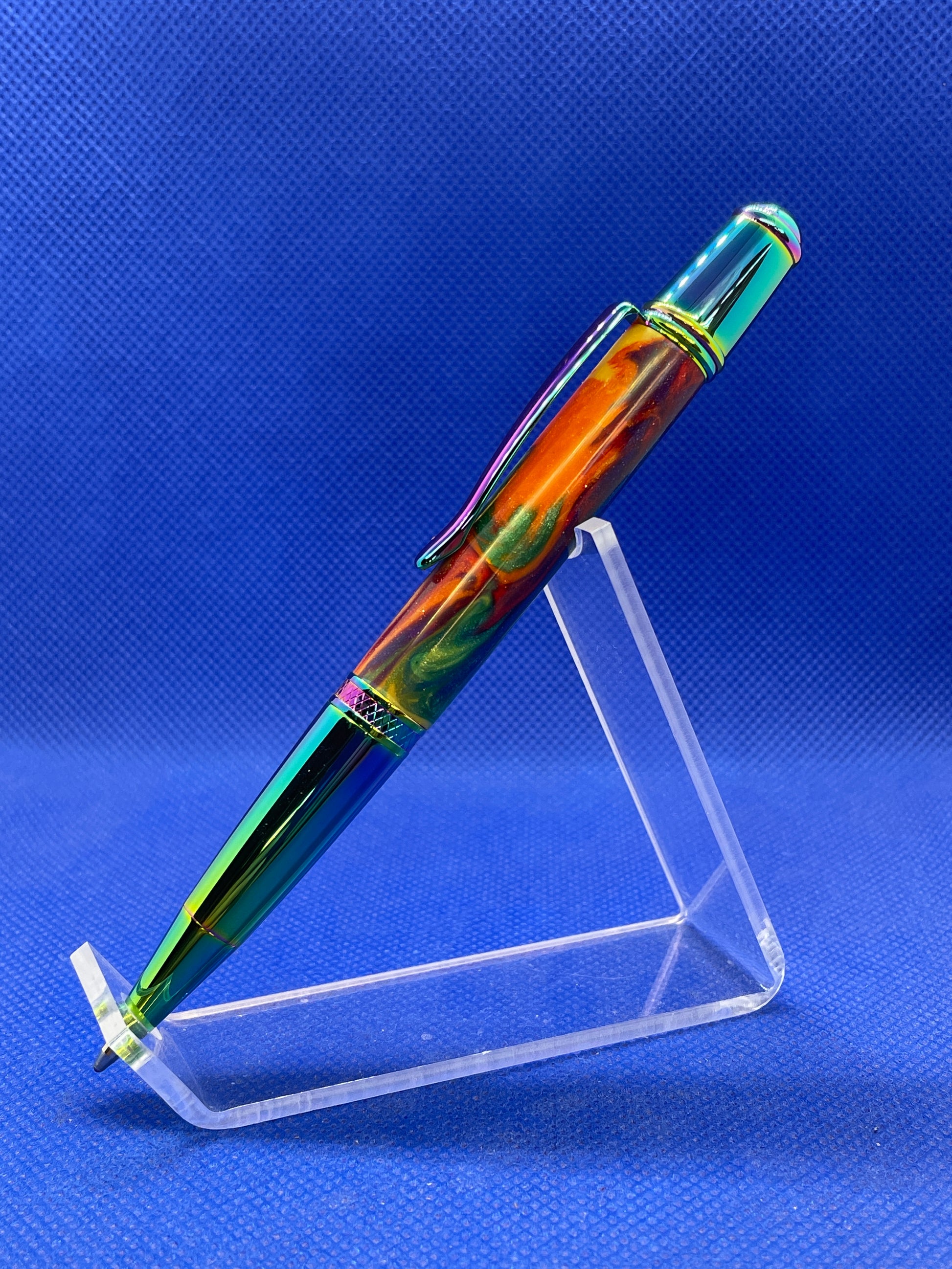 This beautiful Aurora pen features a DiamondCast "Oil Slick" body and multi-coloured "Chameleon" metalwork. Diamondcast material is a urethane resin that is impregnated with real diamond dust that is collected from the diamond cutting industry. This pen uses standard Parker style refills.