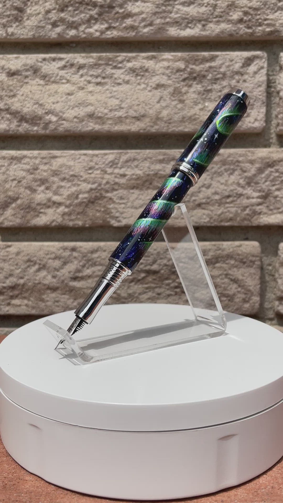 This stunning, one of a kind pen was hand-painted by our in house artist Rachel. It features rhodium metalwork and a "Dark Andromeda" DiamondCast body. "DiamondCast" is an acrylic material with suspended diamond particles throughout. The deep, rich colours give the impression of a nighttime sky, with the diamonds sparkling like distant stars. Rachel hand painted the aurora and the other stars to give this pen a truly outstanding look.