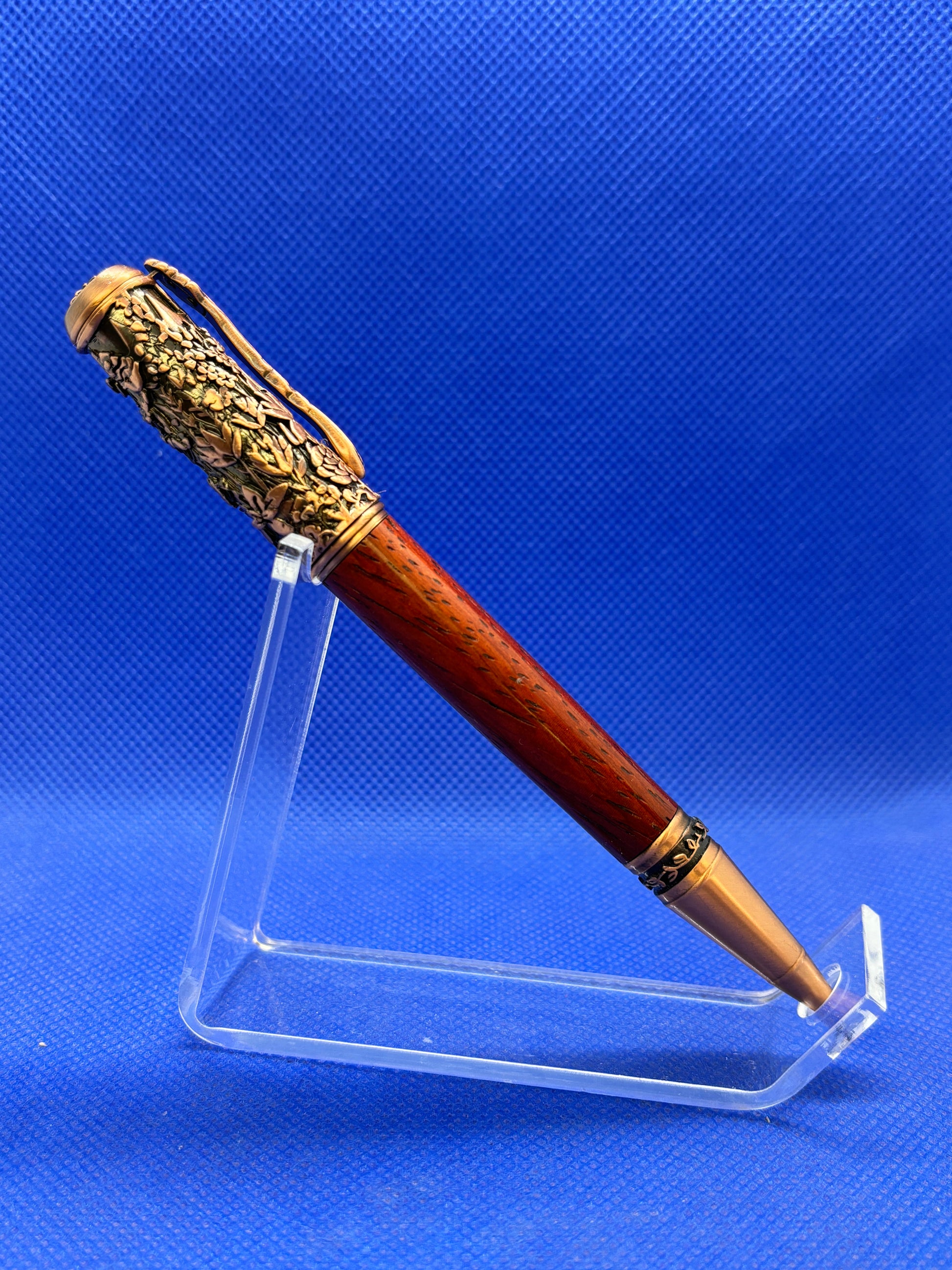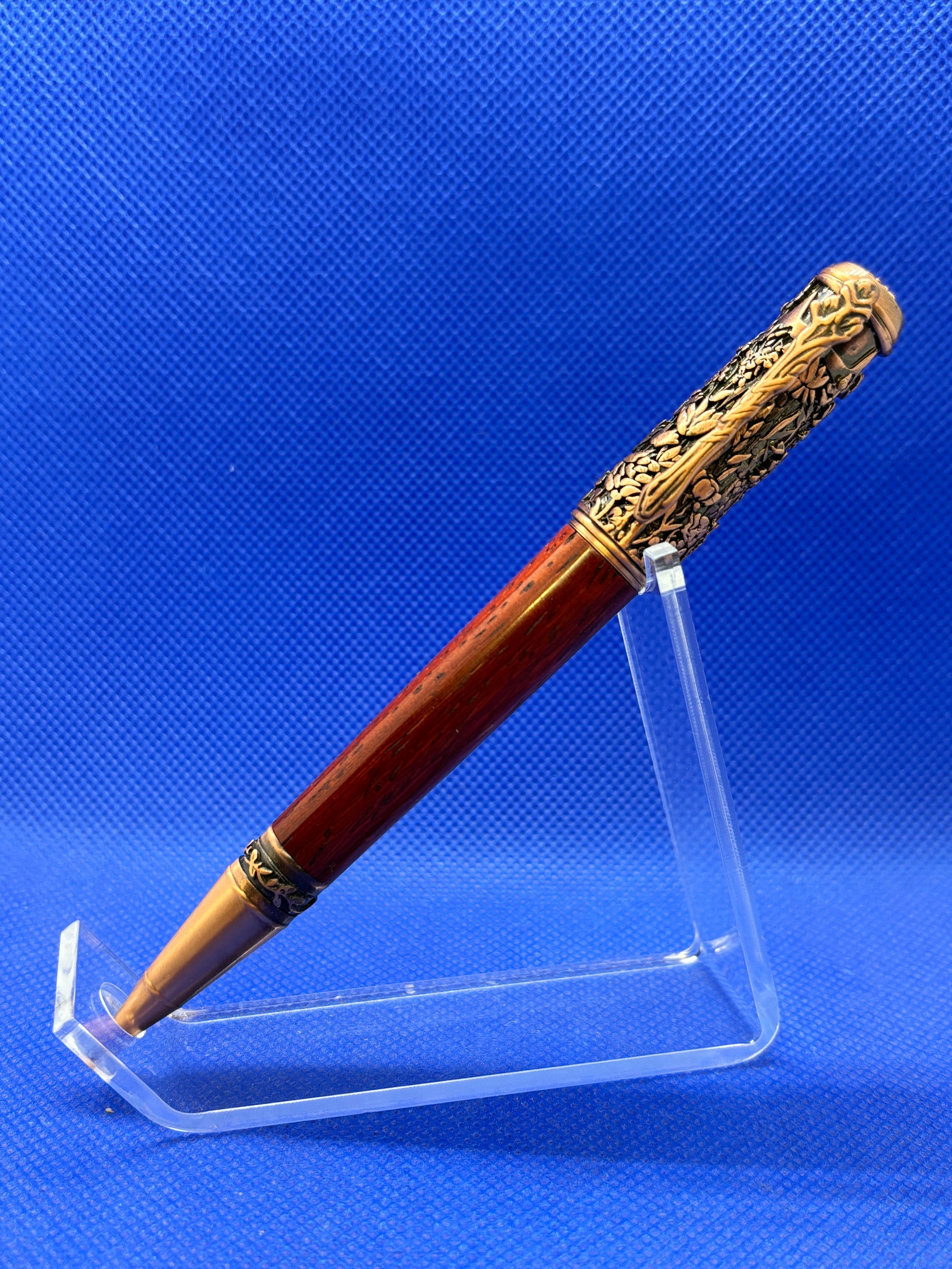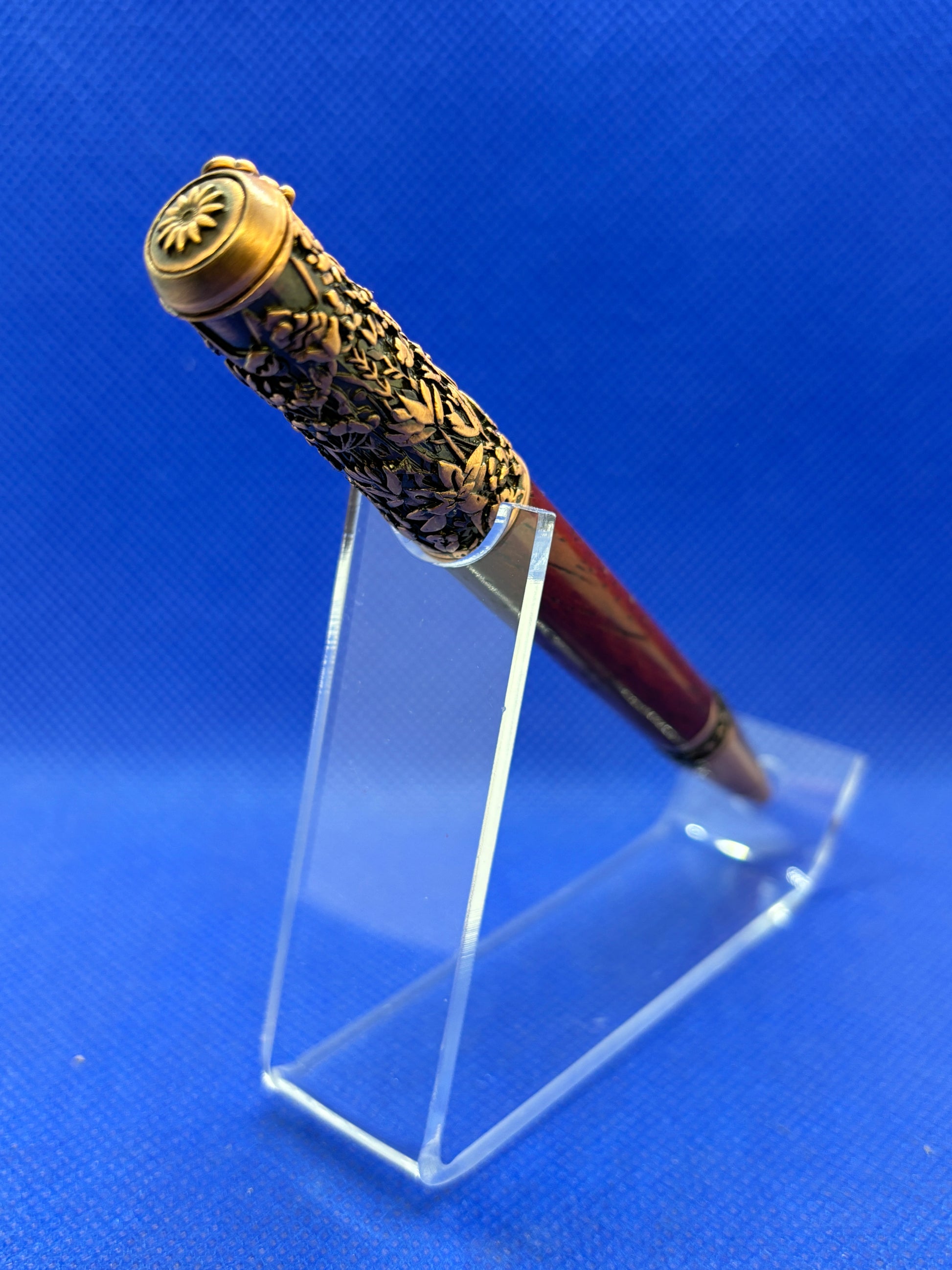 This ornate botanical themed pen features a Padauk wood body with antique copper trim. The decorations on the pen cap and clip feature wildflowers and grasses with a sunflower as a finial. The nib band also has a vine detail around it. This pen uses standard Parker style refills