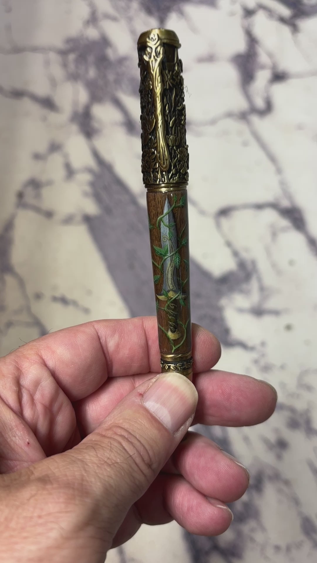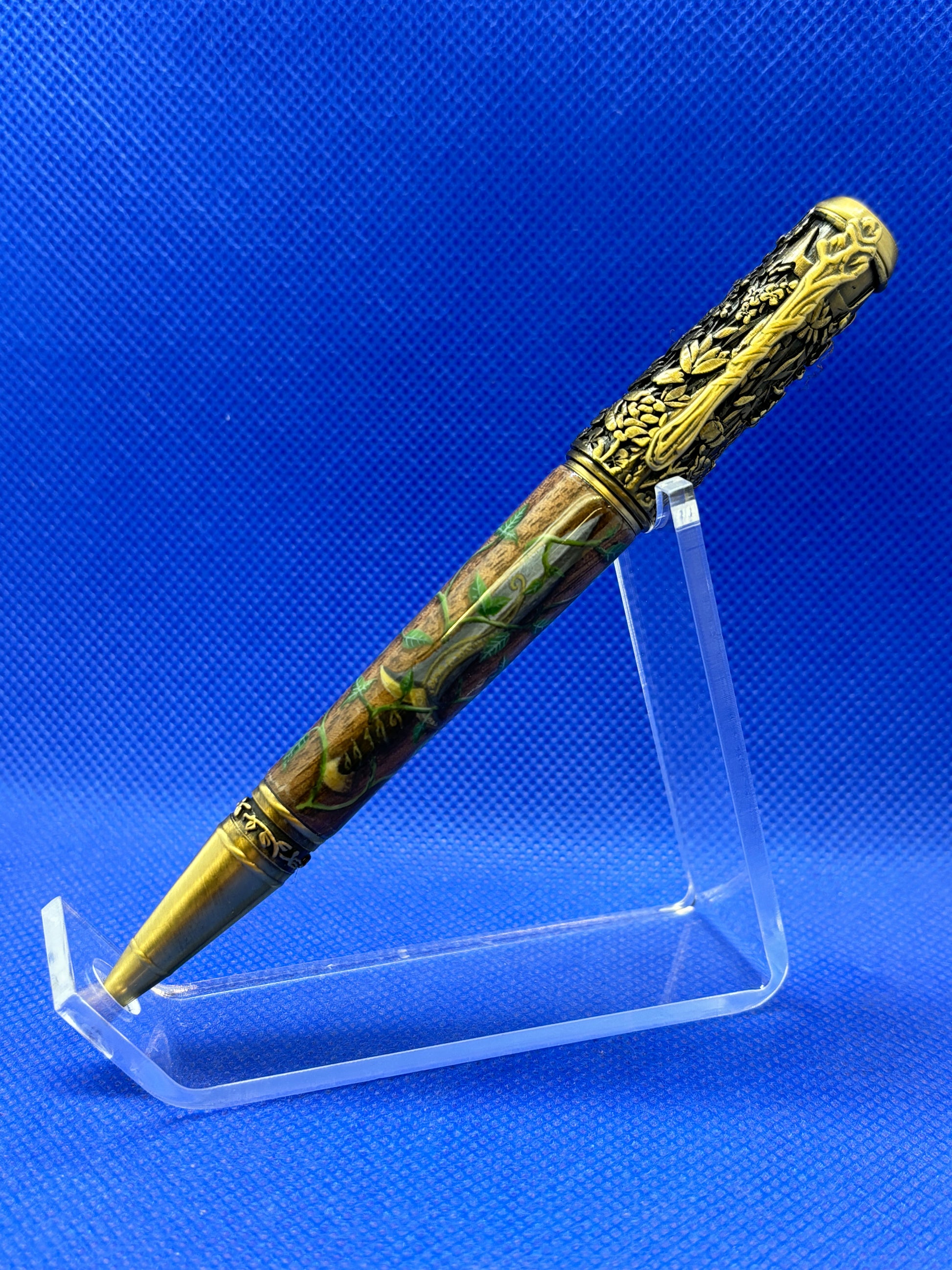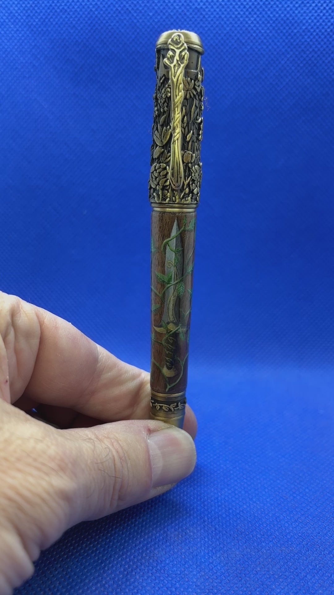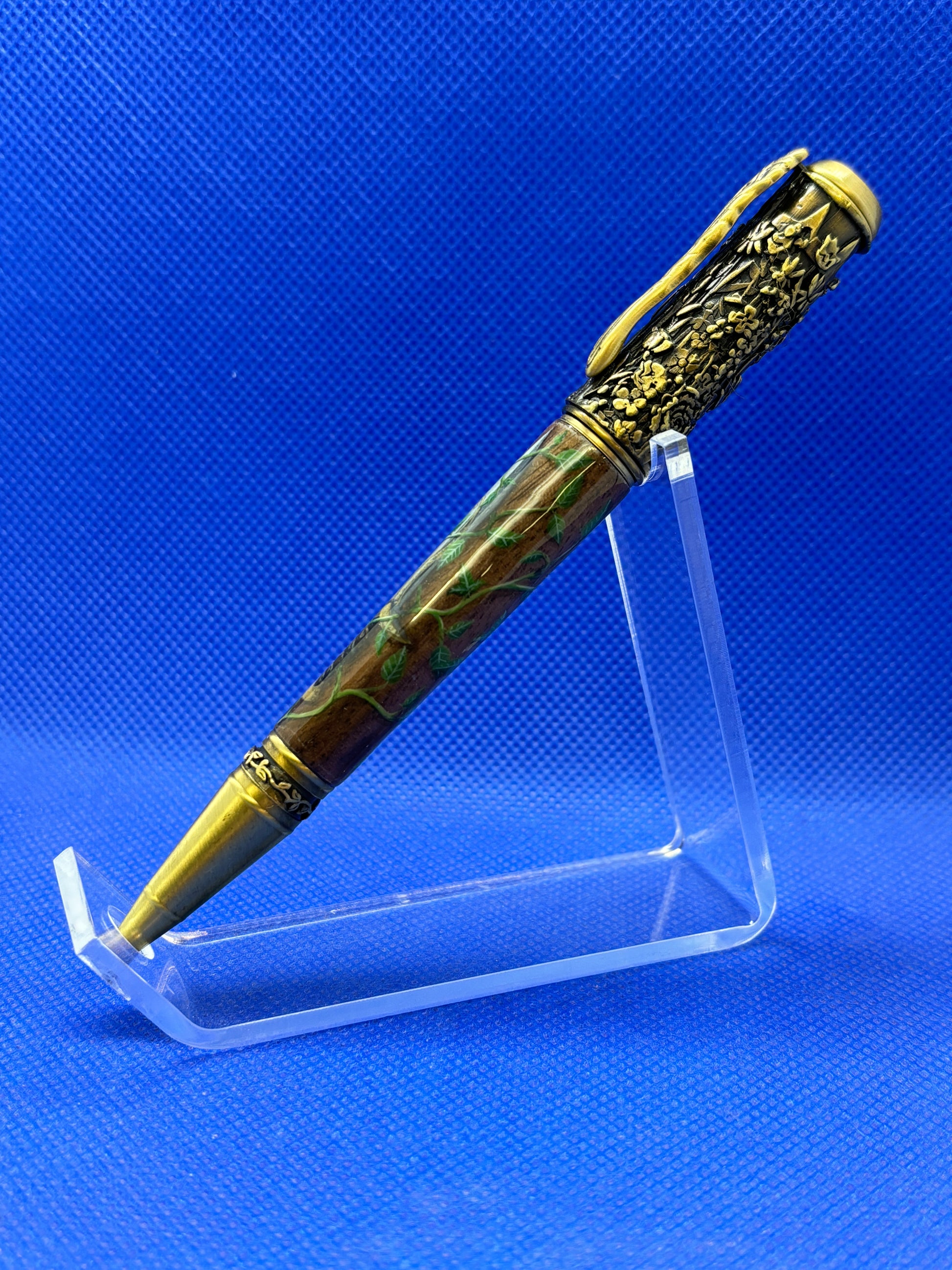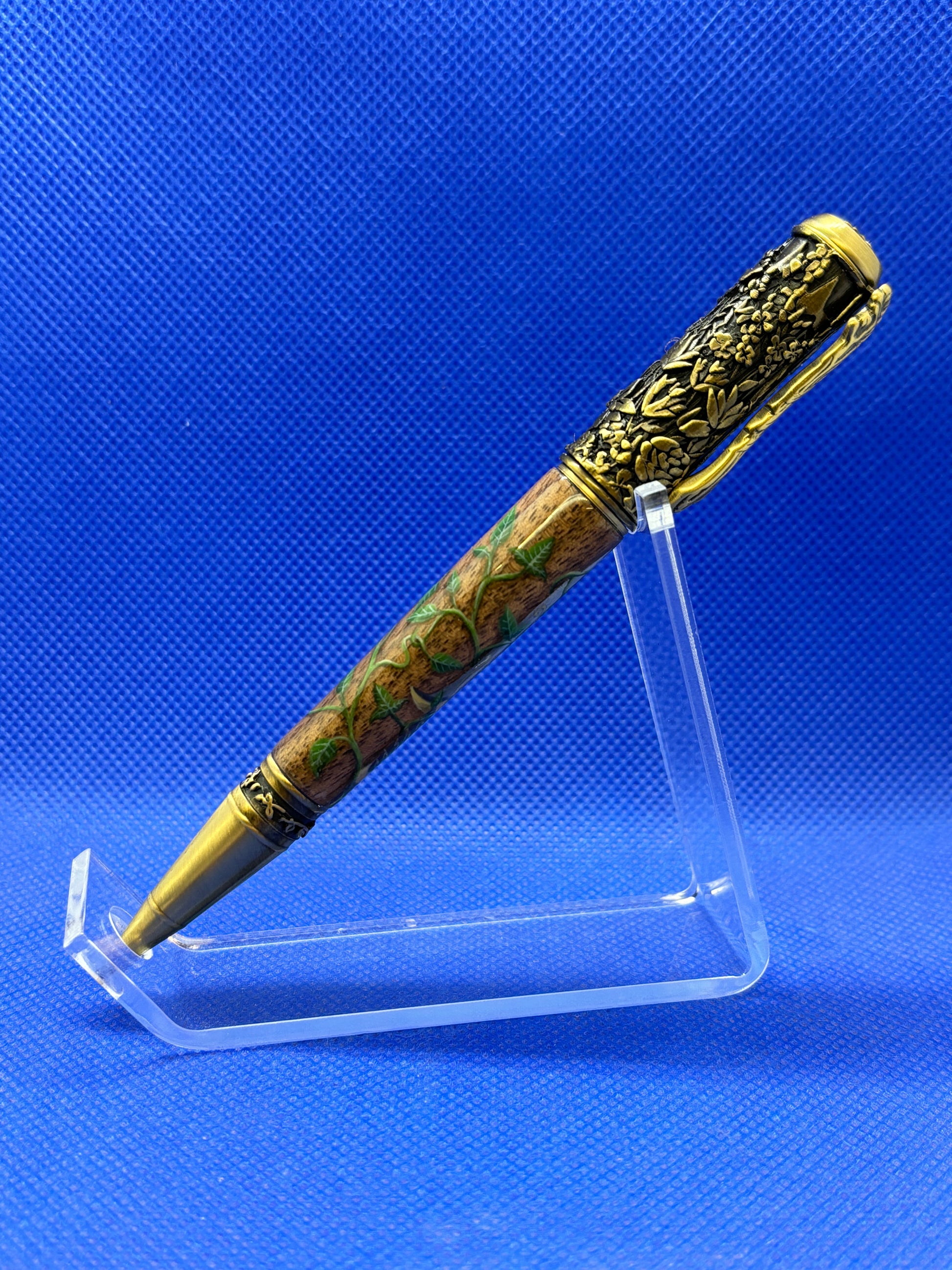 This ornate botanical themed pen features a figured black walnut body with antique brass trim. The decorations on the pen cap and clip feature wildflowers and grasses with a sunflower as a finial. The nib band also has a vine detail around it. This pen was ordered for a fantasy themed wedding and the customized, hand painted artwork is reminiscent of a Middle earth garden. This pen uses standard Parker style refills
