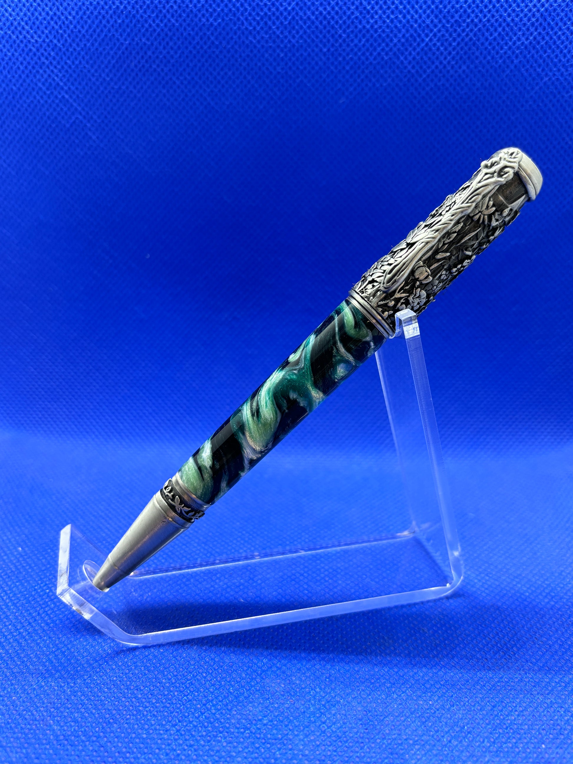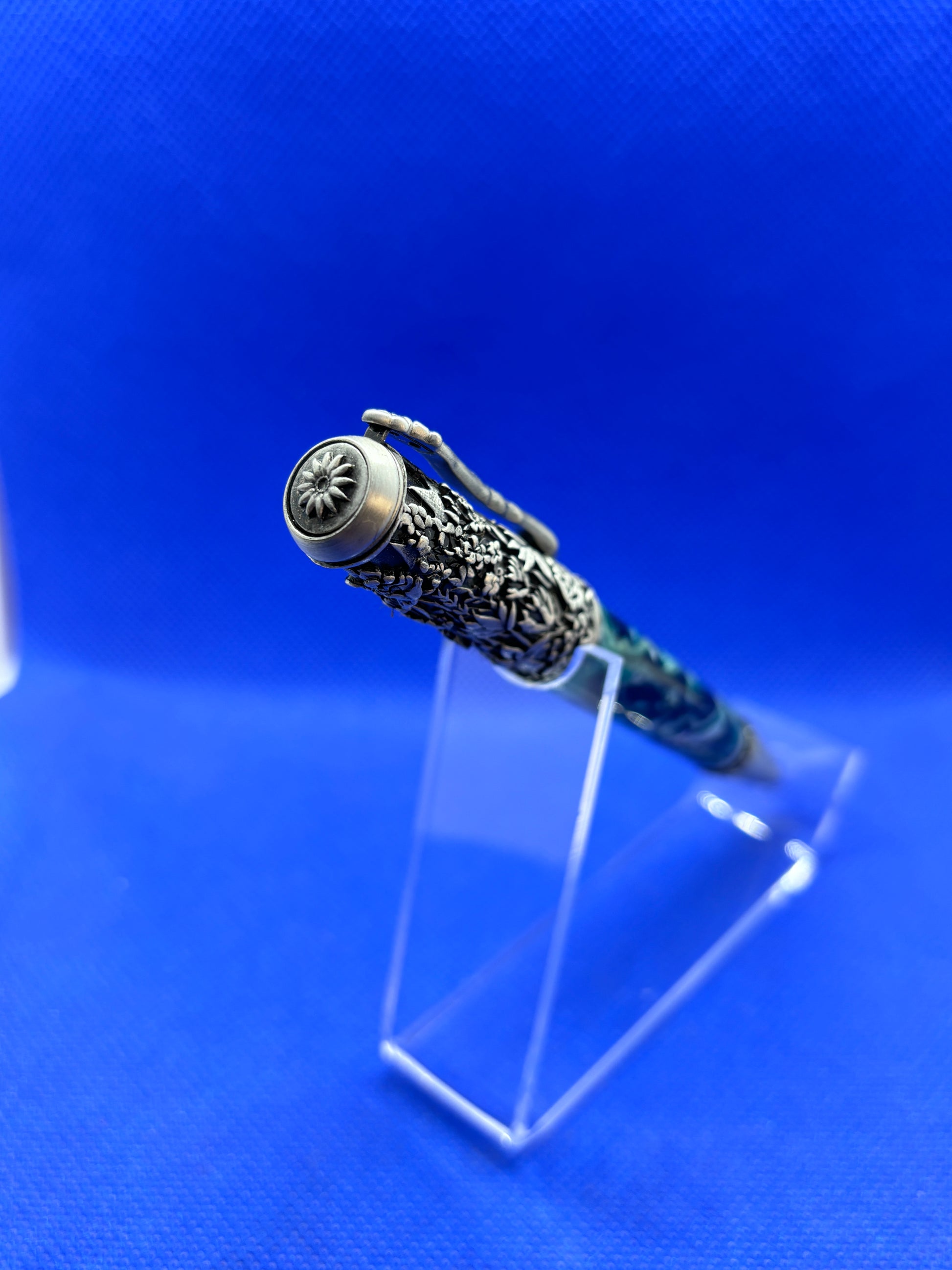 This ornate botanical themed pen features a Pearlux "Marshland" resin body with antique silver trim. The decorations on the pen cap and clip feature wildflowers and grasses with a sunflower as a finial. The nib band also has a vine detail around it. This pen uses standard Parker style refills