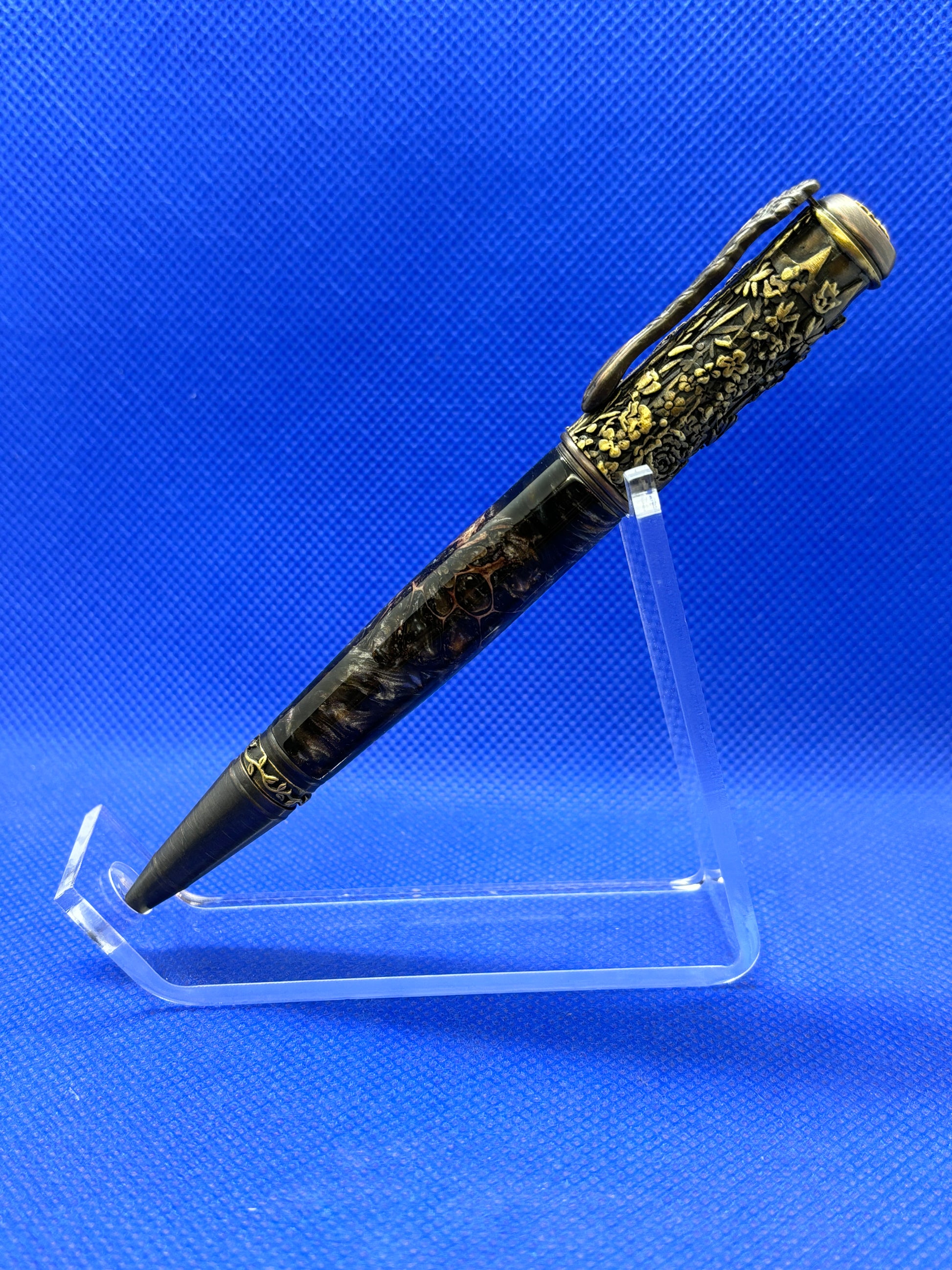 This ornate botanical themed pen features rubbed bronze metalwork with a body made from a sweet gum pod encased in resin. The decorations on the pen cap and clip feature wildflowers and grasses with a sunflower as a finial. The nib band also has a vine detail around it. This pen uses standard Parker style refills