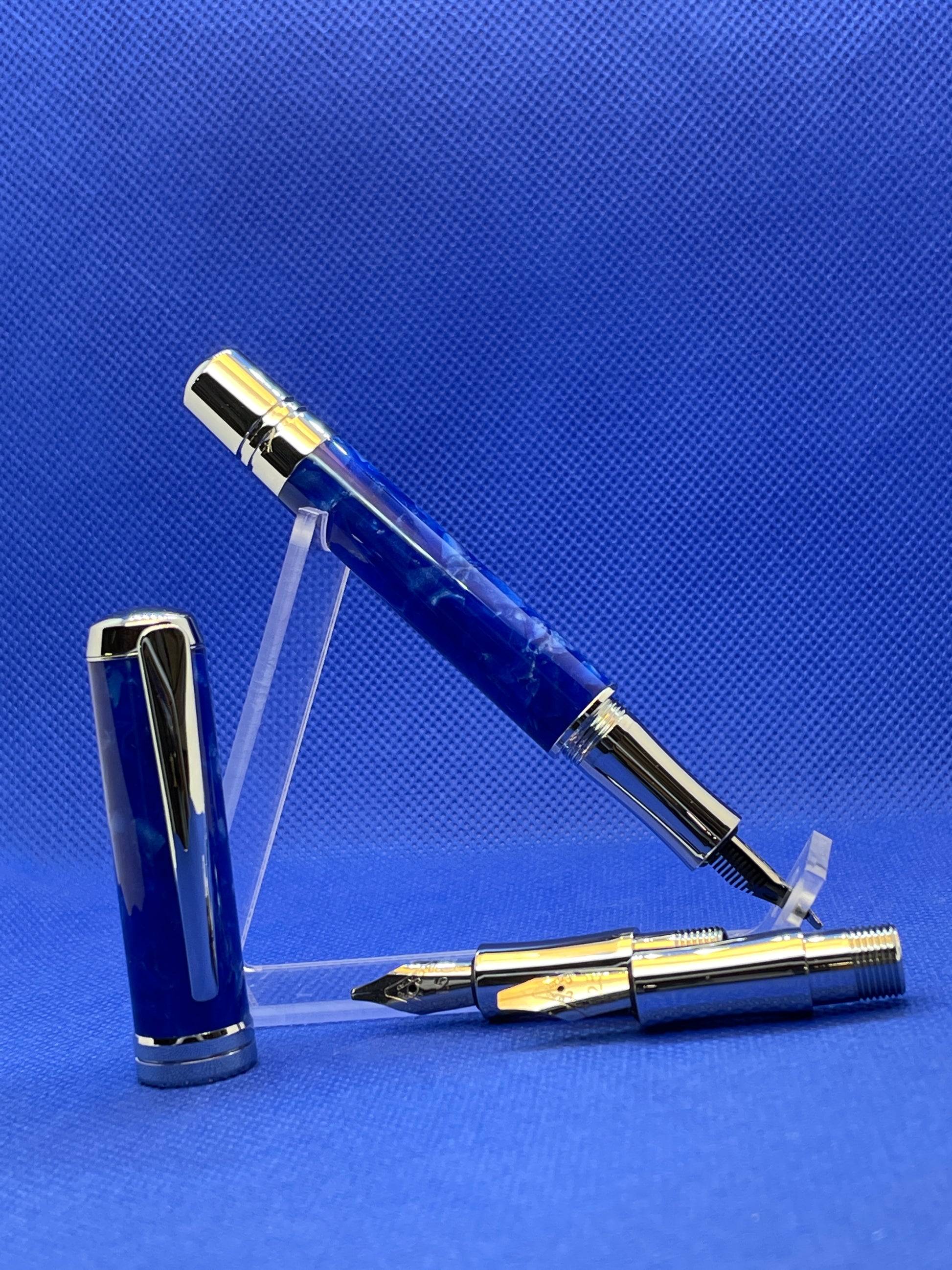 This calligraphy set will give you all the components needed to create beautiful calligraphic documents. It includes one calligraphy pen with chrome trim and a "Royal Blue" acrylic acetate body, 2 universal black ink cartridges, 2 universal blue ink cartridges, an ink pump for use with bottled ink, and three interchangeable nibs measuring 1.5mm, 1.9mm and 2.5mm. Everything is contained in custom fit box.