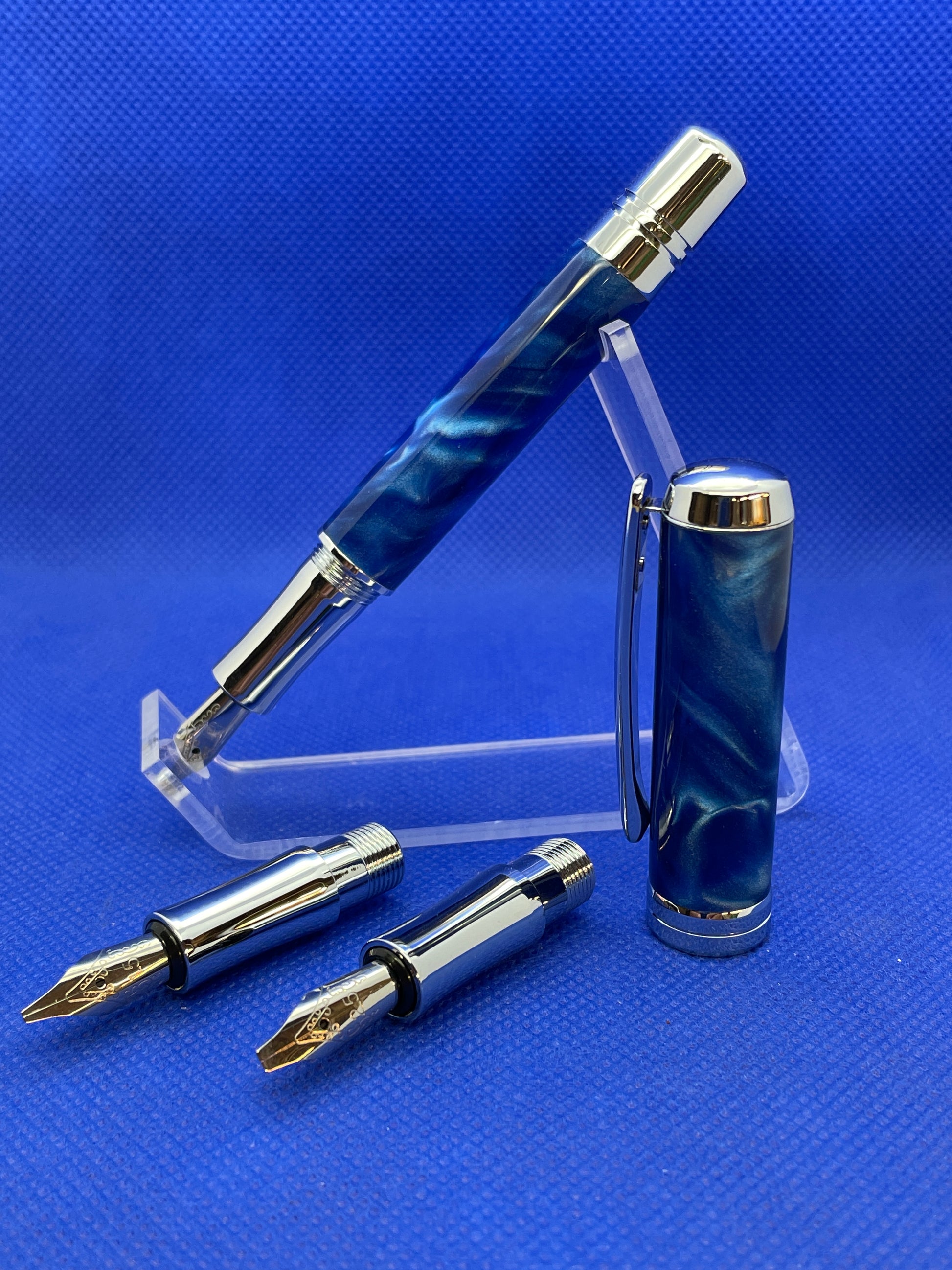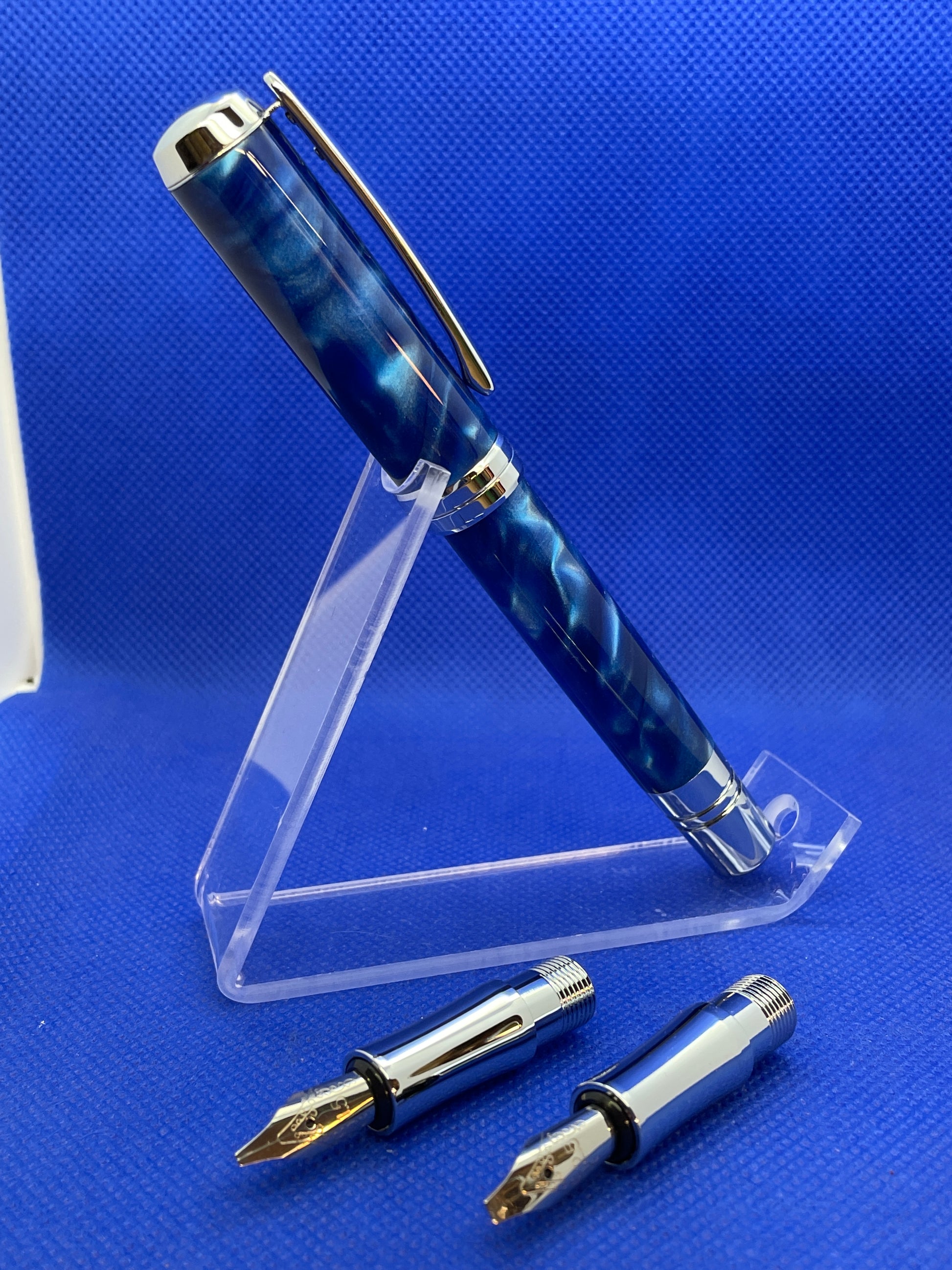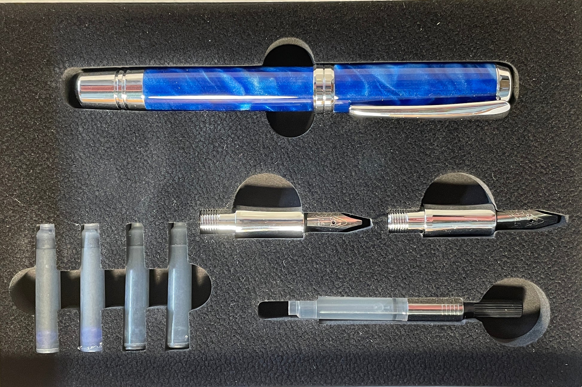 This calligraphy set will give you all the components needed to create beautiful calligraphic documents. It includes one calligraphy pen with chrome trim and a "Blue Macaw" acrylic acetate body, 2 universal black ink cartridges, 2 universal blue ink cartridges, an ink pump for use with bottled ink, and three interchangeable nibs measuring 1.5mm, 1.9mm and 2.5mm. Everything is contained in custom fit box.