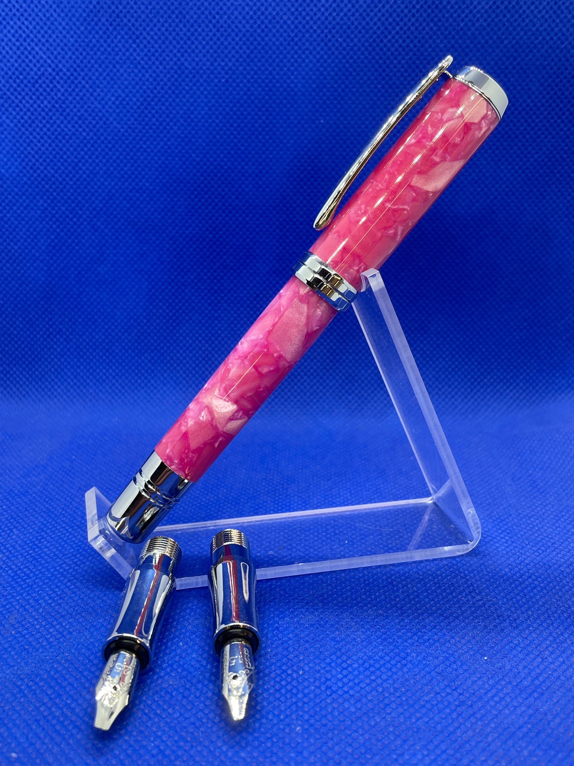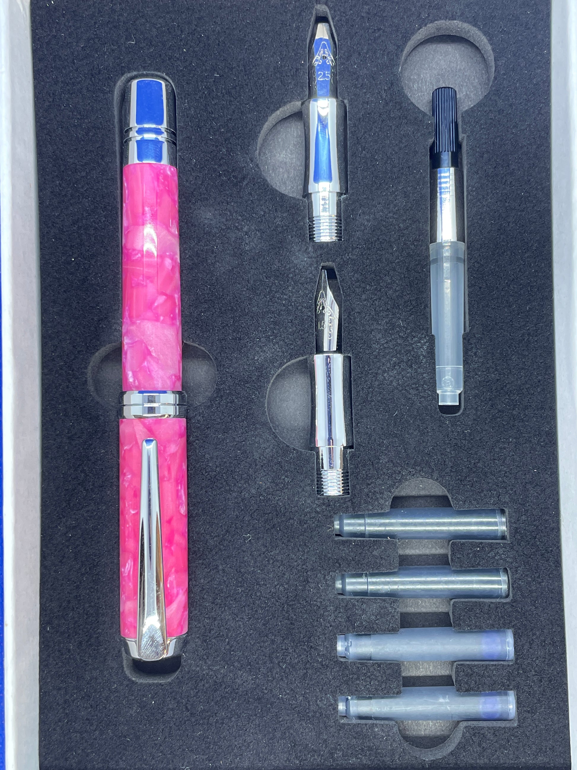 This calligraphy set will give you all the components needed to create beautiful calligraphic documents. It includes one calligraphy pen with chrome trim and a "Pink Pebble" acrylic acetate body, 2 universal black ink cartridges, 2 universal blue ink cartridges, an ink pump for use with bottled ink, and three interchangeable nibs measuring 1.5mm, 1.9mm and 2.5mm. Everything is contained in custom fit box.