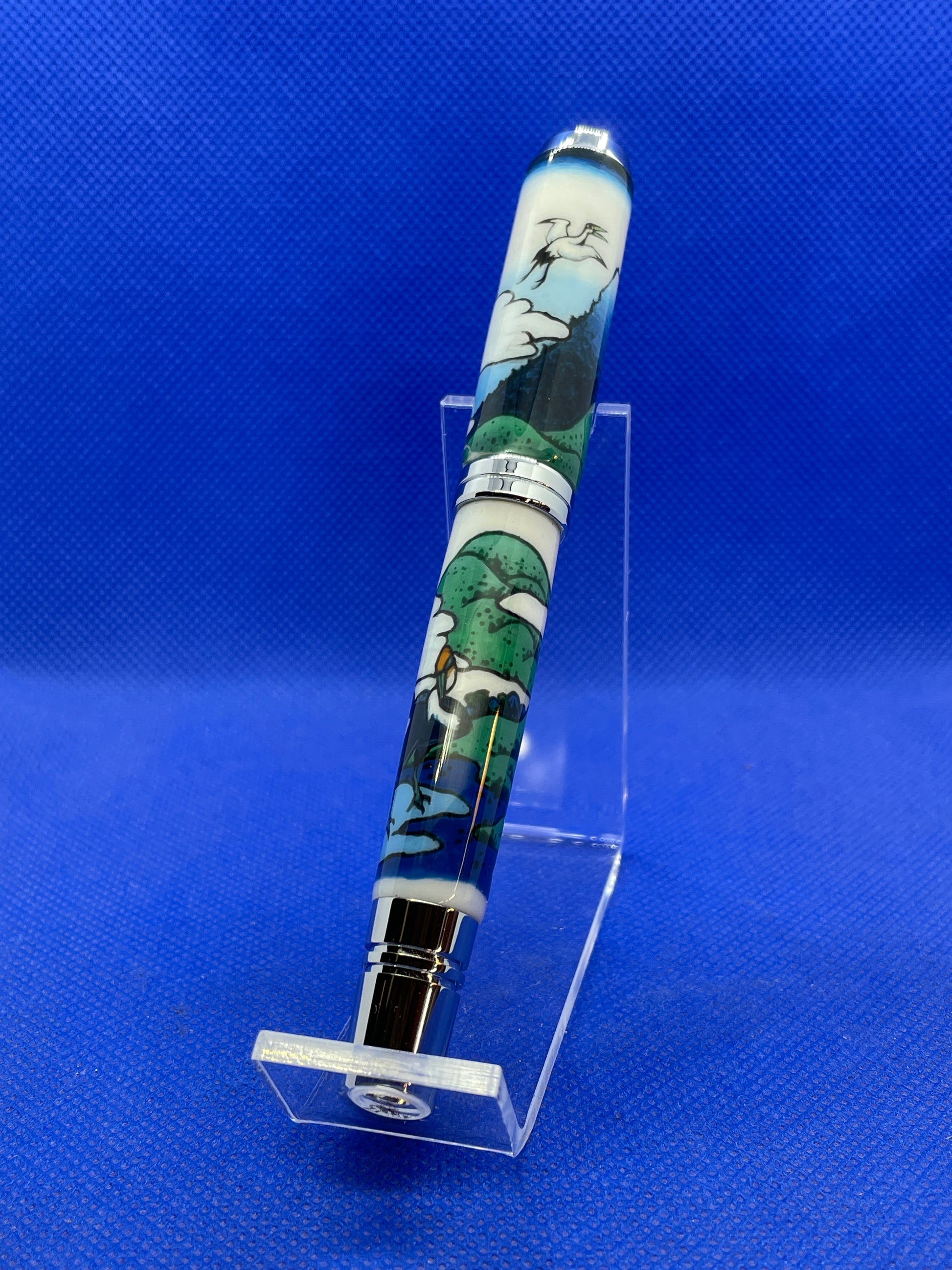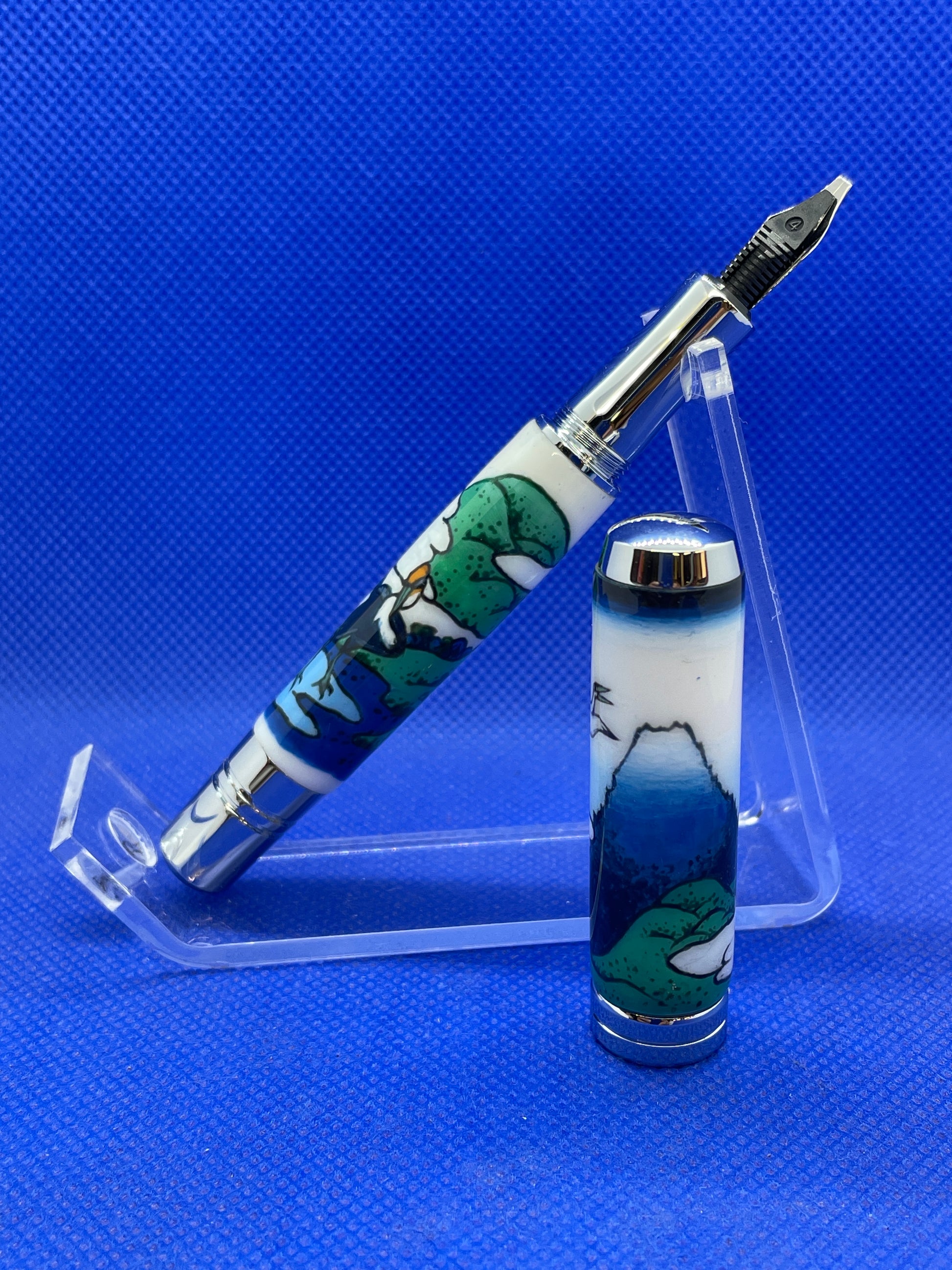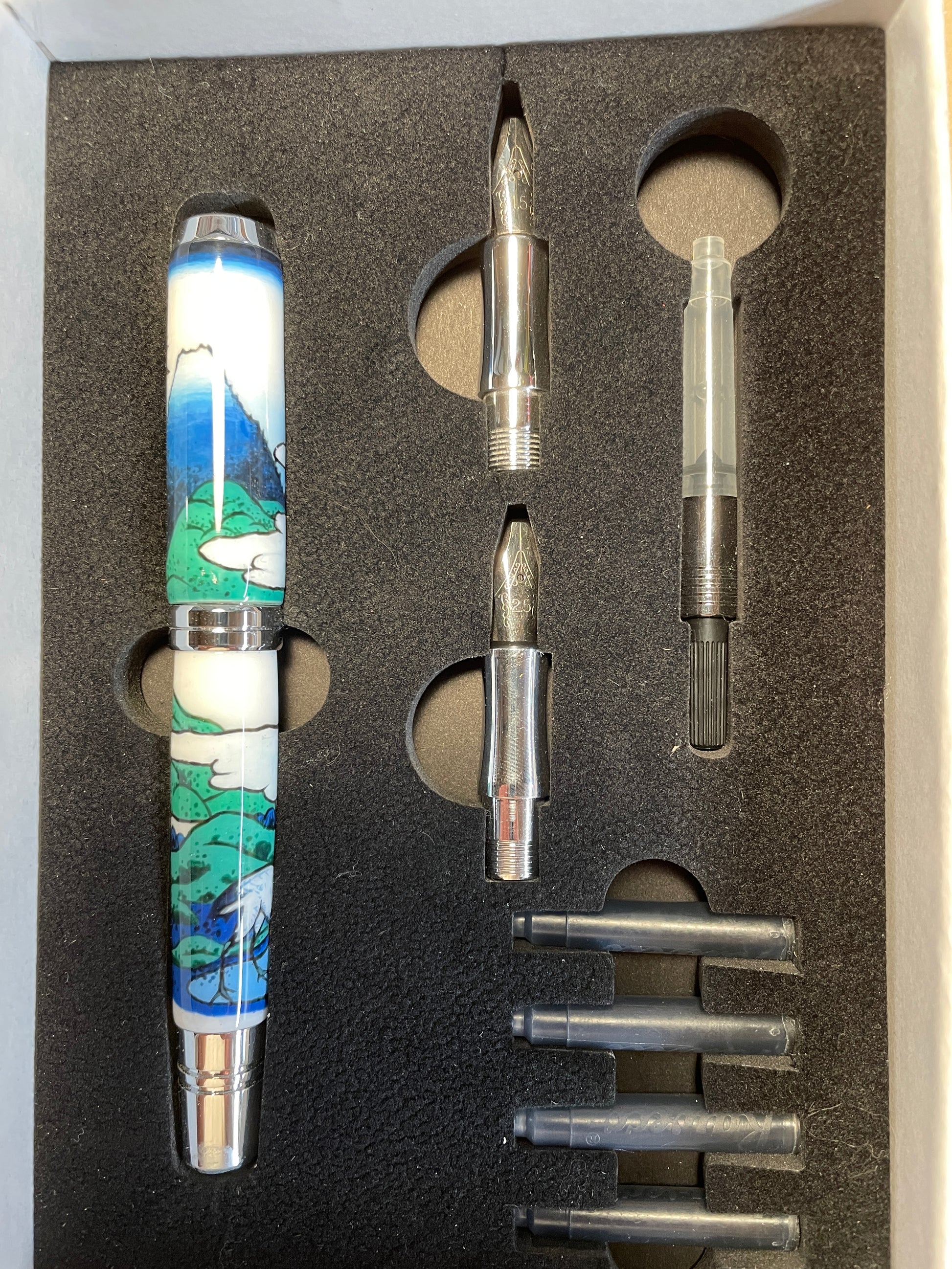 This calligraphy set includes all the components needed to create beautiful calligraphic documents. It includes one calligraphy pen with chrome trim, 2 universal black ink cartridges, 2 universal blue ink cartridges, an ink pump for use with bottled ink, and three interchangeable nibs measuring 1.5mm, 1.9mm and 2.5mm. Everything is contained in custom fit box. This pen was a custom design that was hand-painted by Rachel, our in house artist. It is a beautiful piece based on the Katsushika Hokusai painting " Umegawa in Sagami Province".