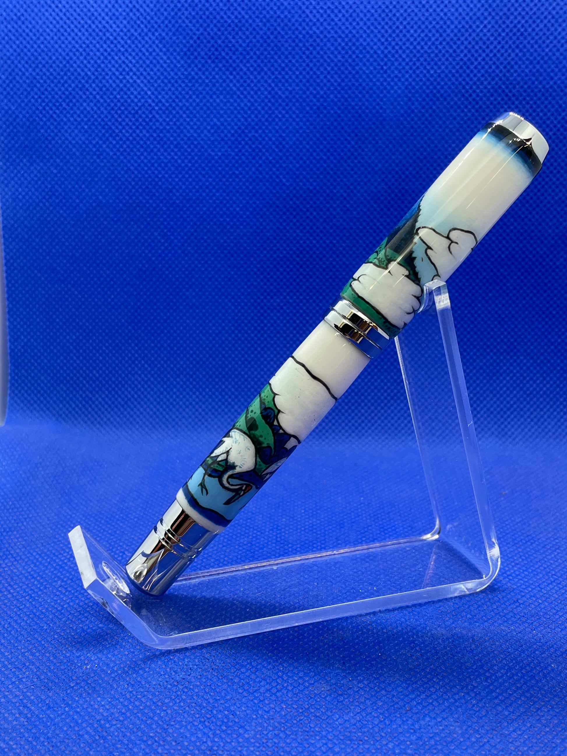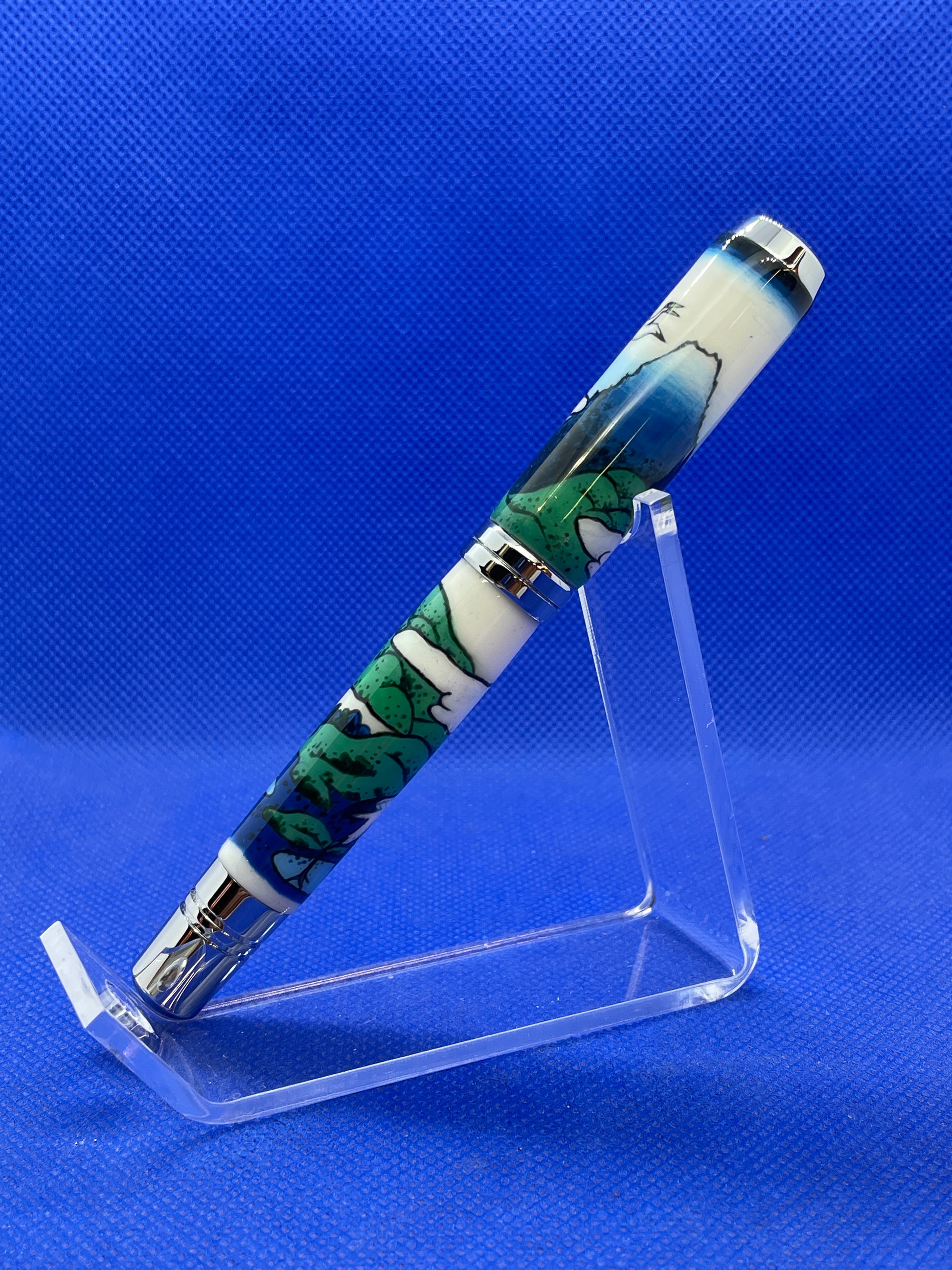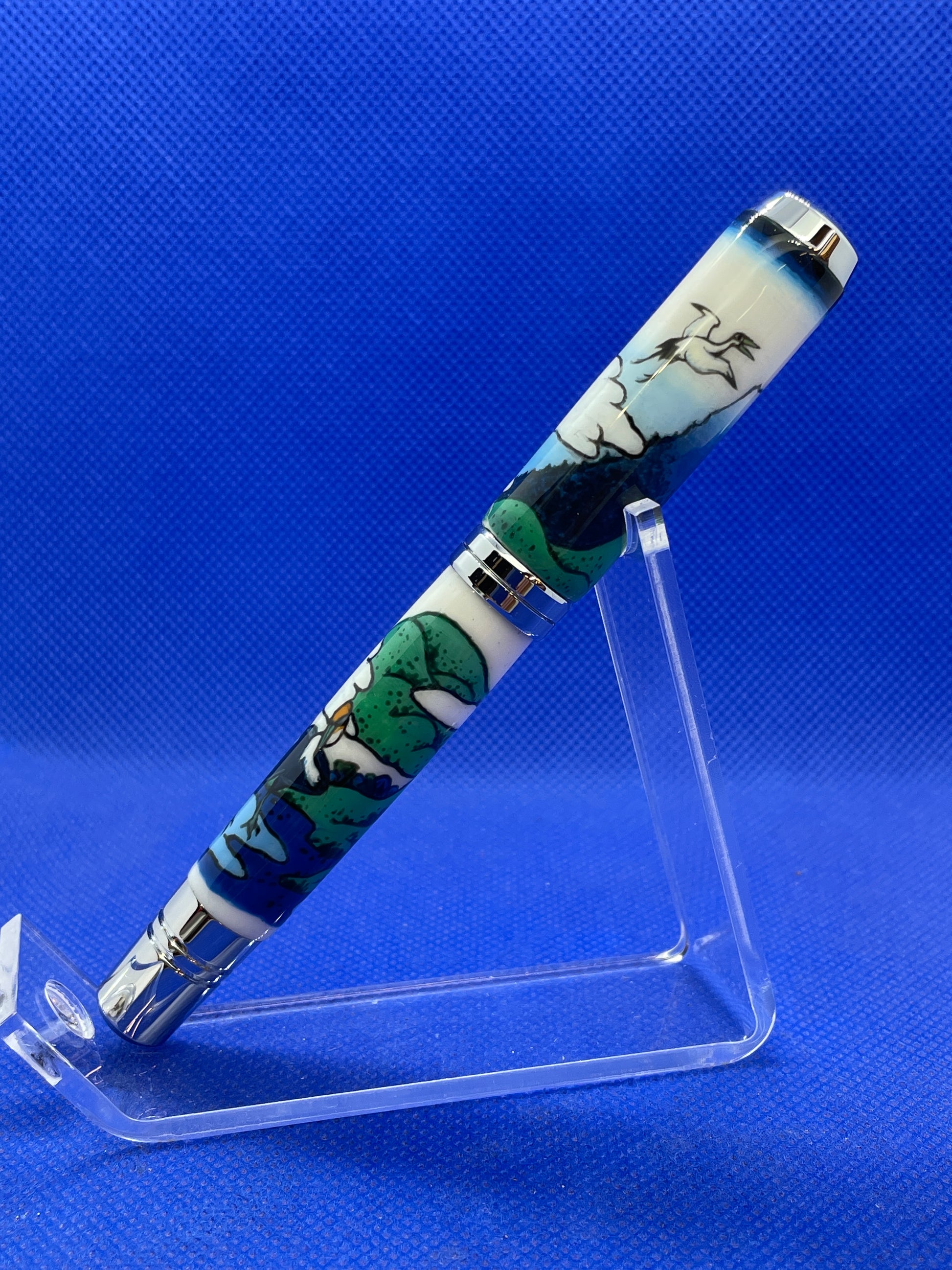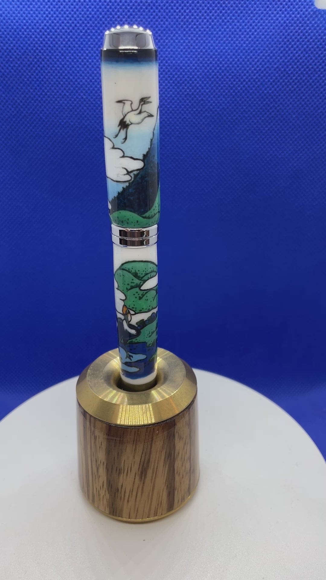This calligraphy set includes all the components needed to create beautiful calligraphic documents. It includes one calligraphy pen with chrome trim, 2 universal black ink cartridges, 2 universal blue ink cartridges, an ink pump for use with bottled ink, and three interchangeable nibs measuring 1.5mm, 1.9mm and 2.5mm. Everything is contained in custom fit box. This pen was a custom design that was hand-painted by Rachel, our in house artist. It is a beautiful piece based on the Katsushika Hokusai painting " Umegawa in Sagami Province".