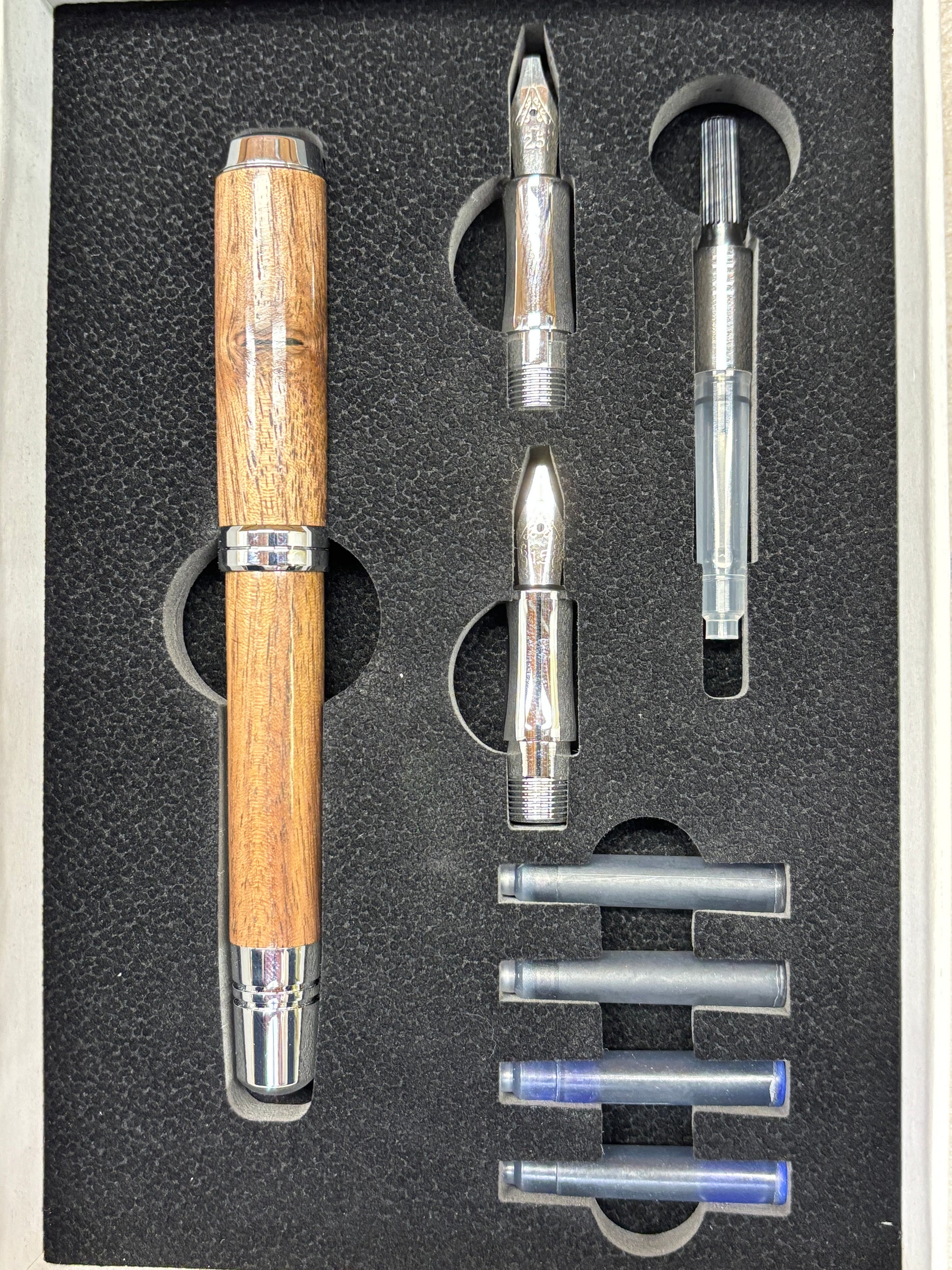 This calligraphy set will give you all the components needed to create beautiful calligraphic documents. It includes one calligraphy pen with chrome trim and a figured walnut body, 2 universal black ink cartridges, 2 universal blue ink cartridges, an ink pump for use with bottled ink, and three interchangeable nibs measuring 1.5mm, 1.9mm and 2.5mm. Everything is contained in custom fit box.