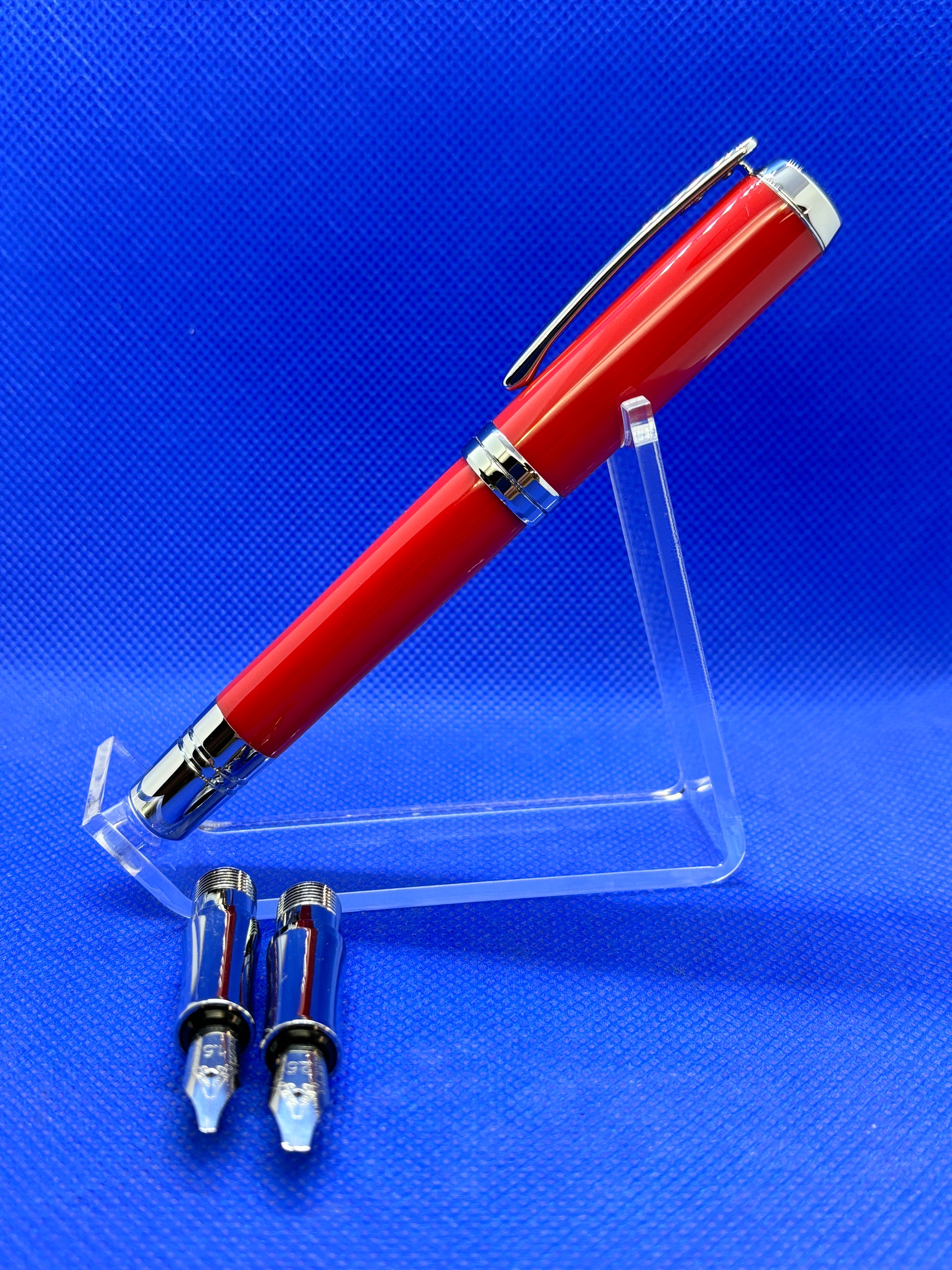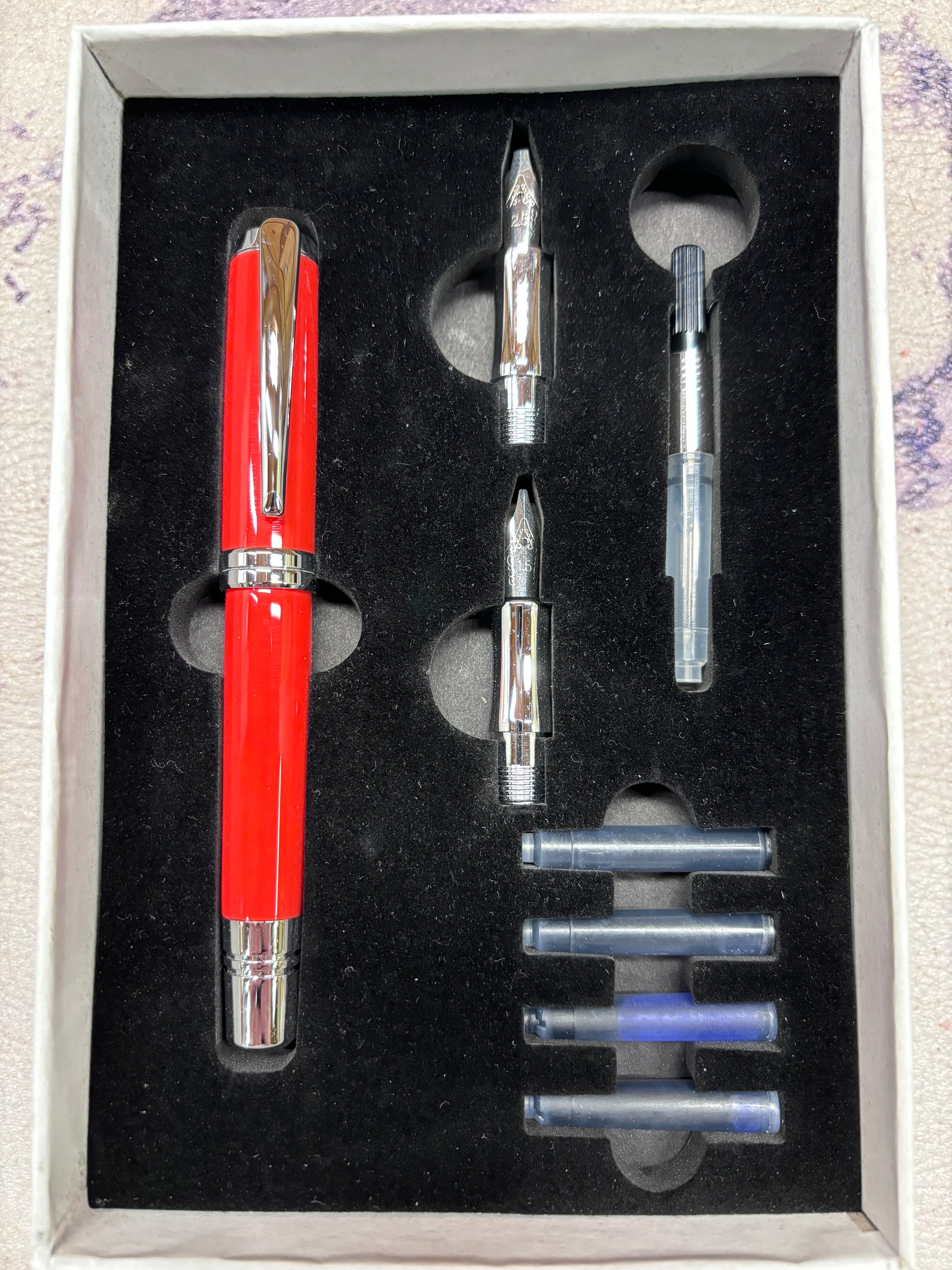 This calligraphy set will give you all the components needed to create beautiful calligraphic documents. It includes one calligraphy pen with chrome trim and a red acrylic acetate body, 2 universal black ink cartridges, 2 universal blue ink cartridges, an ink pump for use with bottled ink, and three interchangeable nibs measuring 1.5mm, 1.9mm and 2.5mm. Everything is contained in custom fit box.