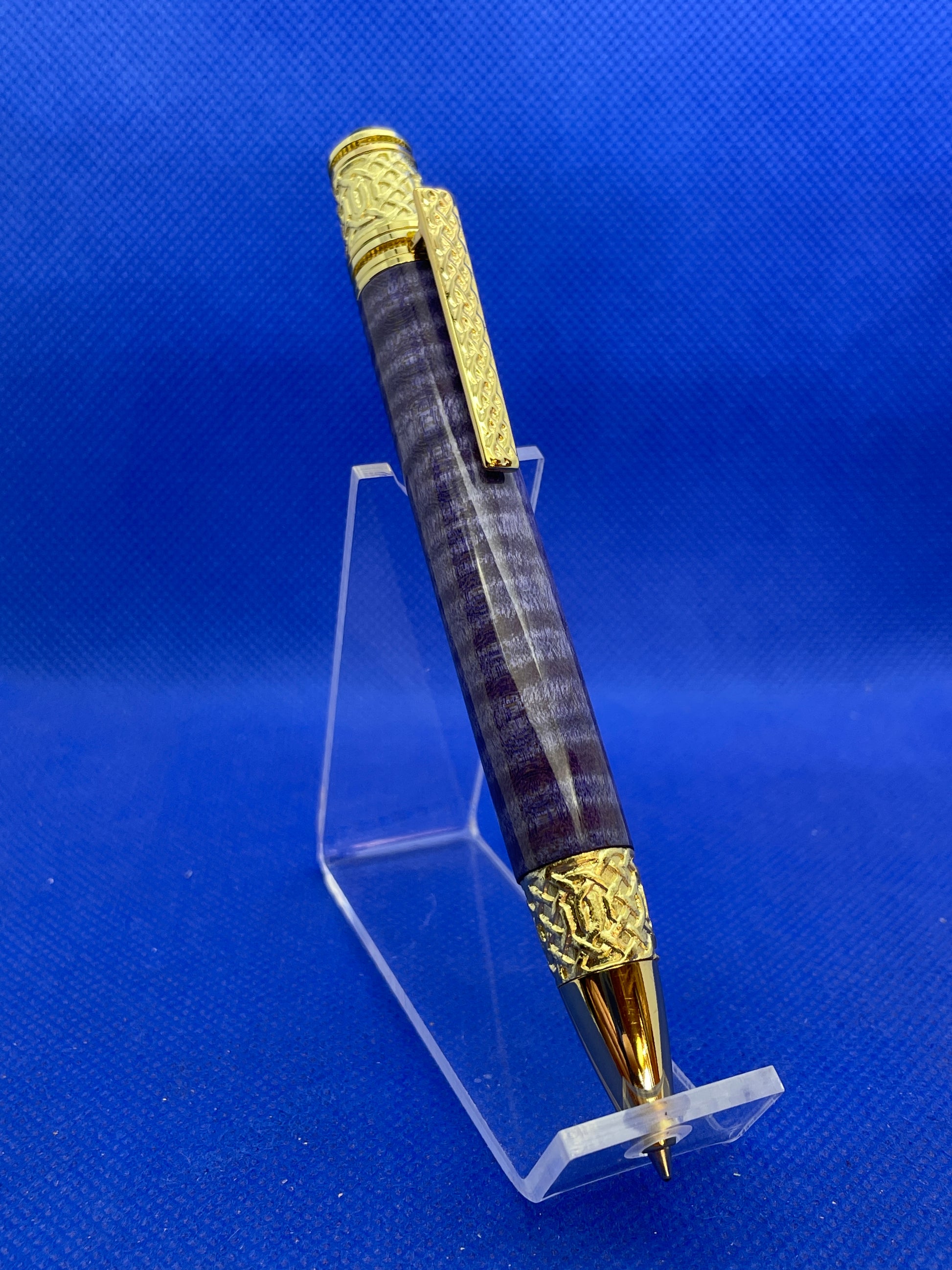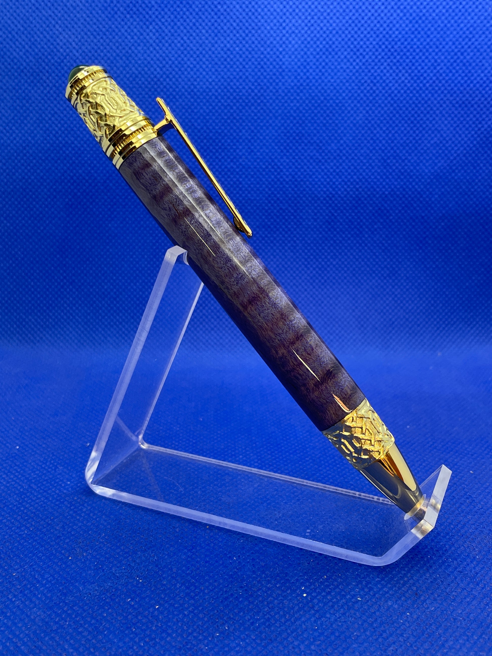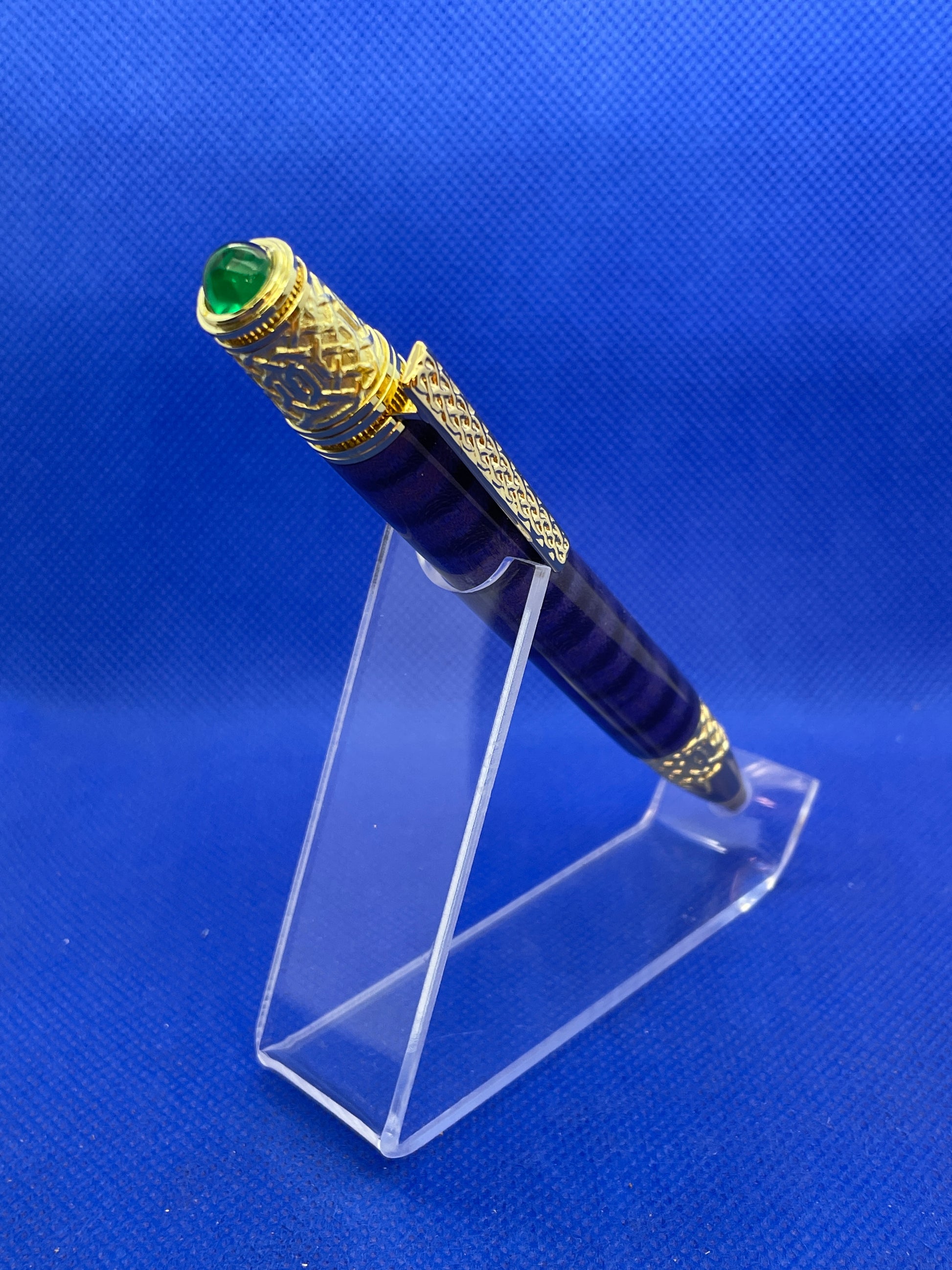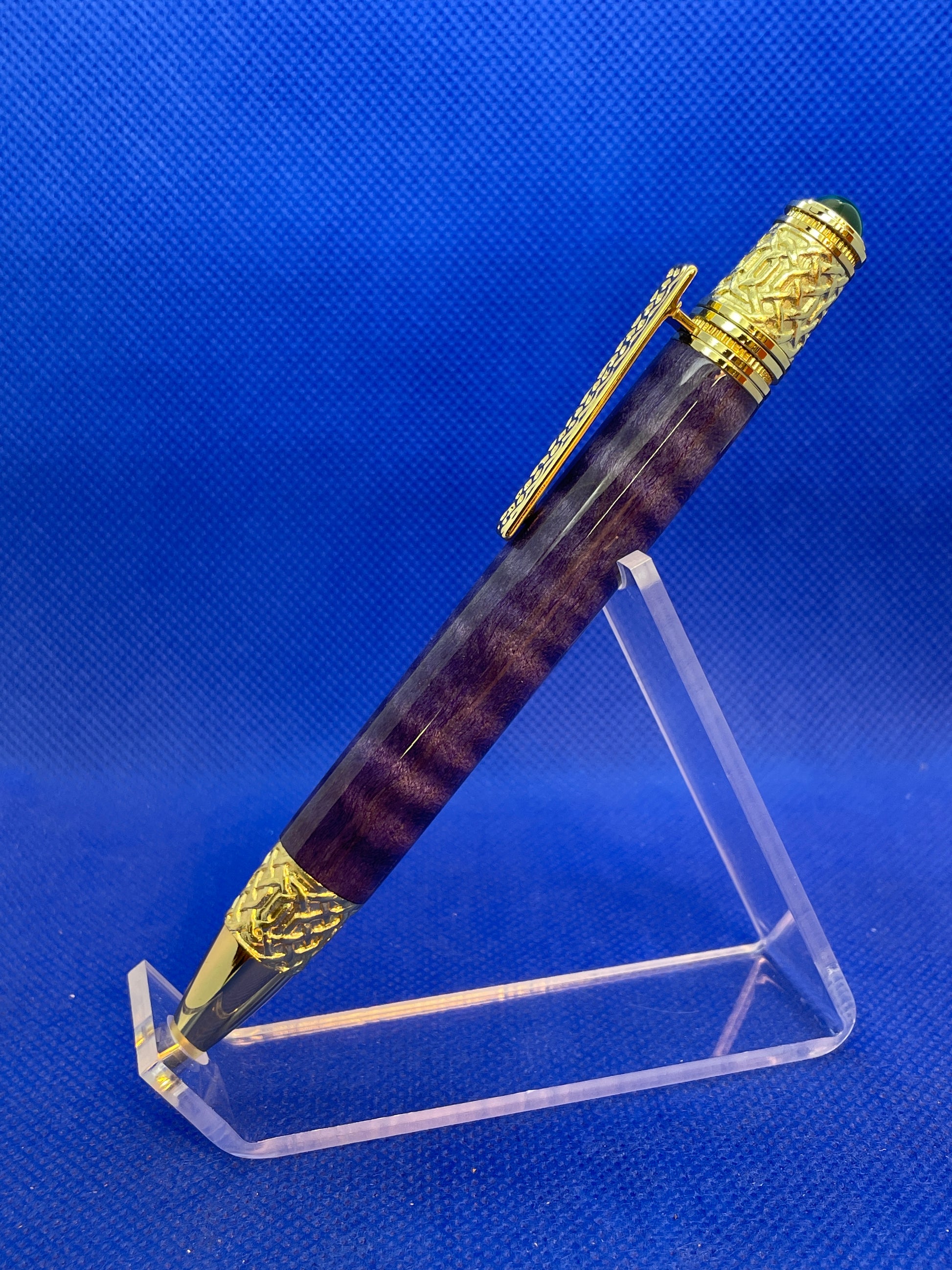 This Celtic ballpoint pen features gold metalwork with a Celtic twist motif and a violet curly maple body. For a touch of added elegance, the pen is topped with a bright green cabochon. This pen uses "Parker" style refills.
