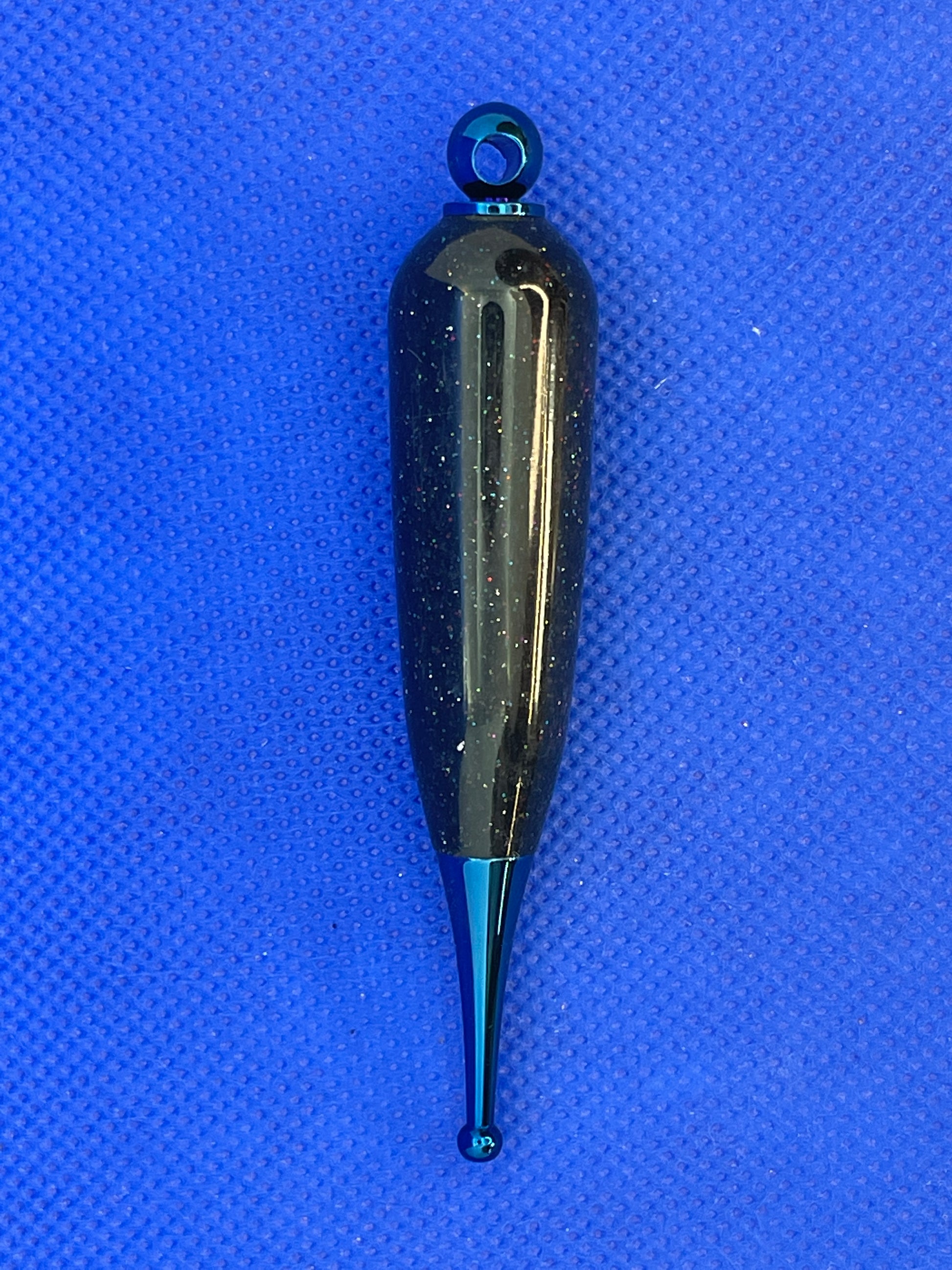 This Christmas ornament features a sparkling "Galaxy" resin glitter body, titanium blue metalwork and a handmade hanger.