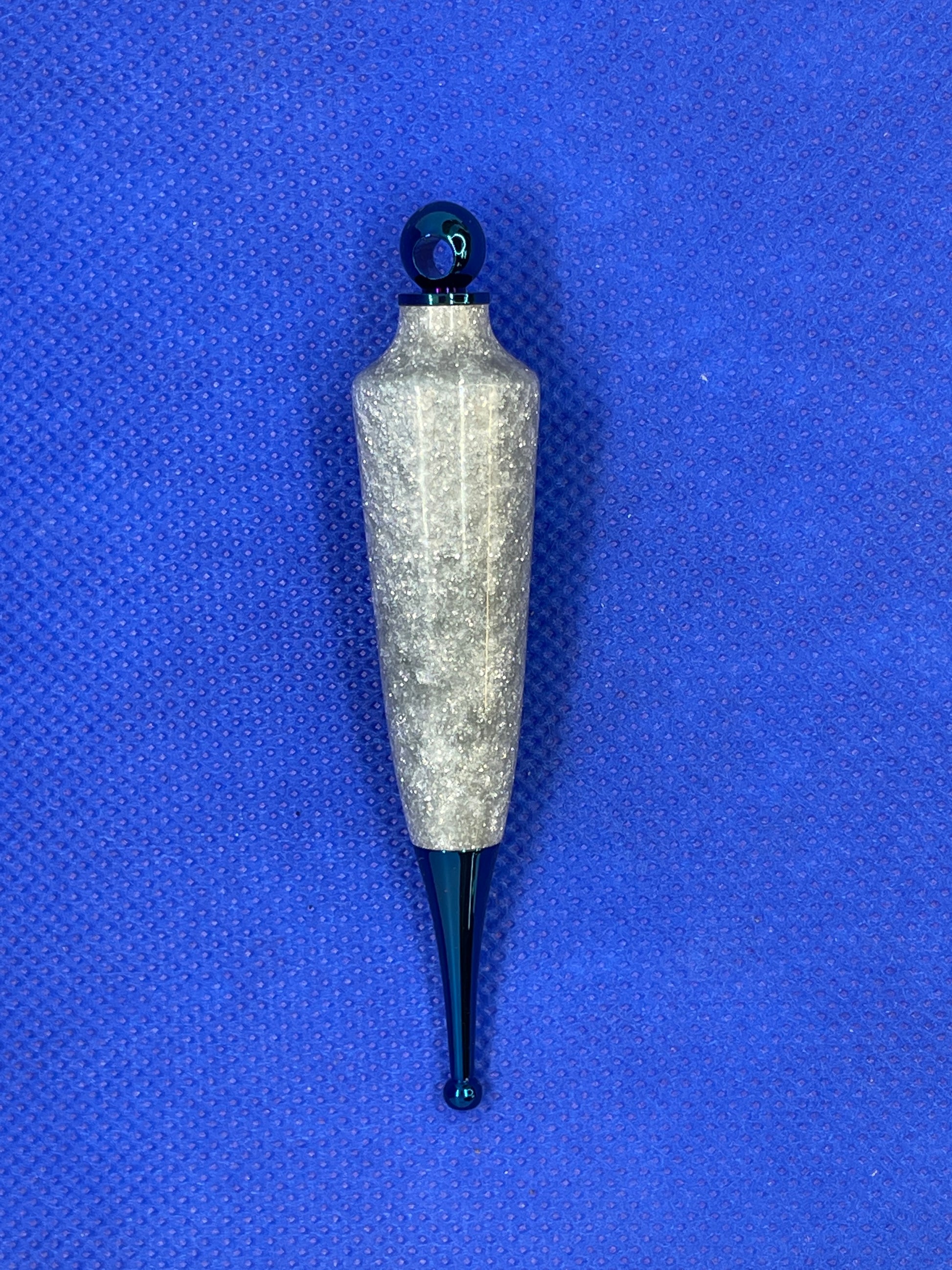 This Christmas ornament features a sparkling "Moon Rocks" resin glitter body, titanium blue metalwork and a handmade hanger.