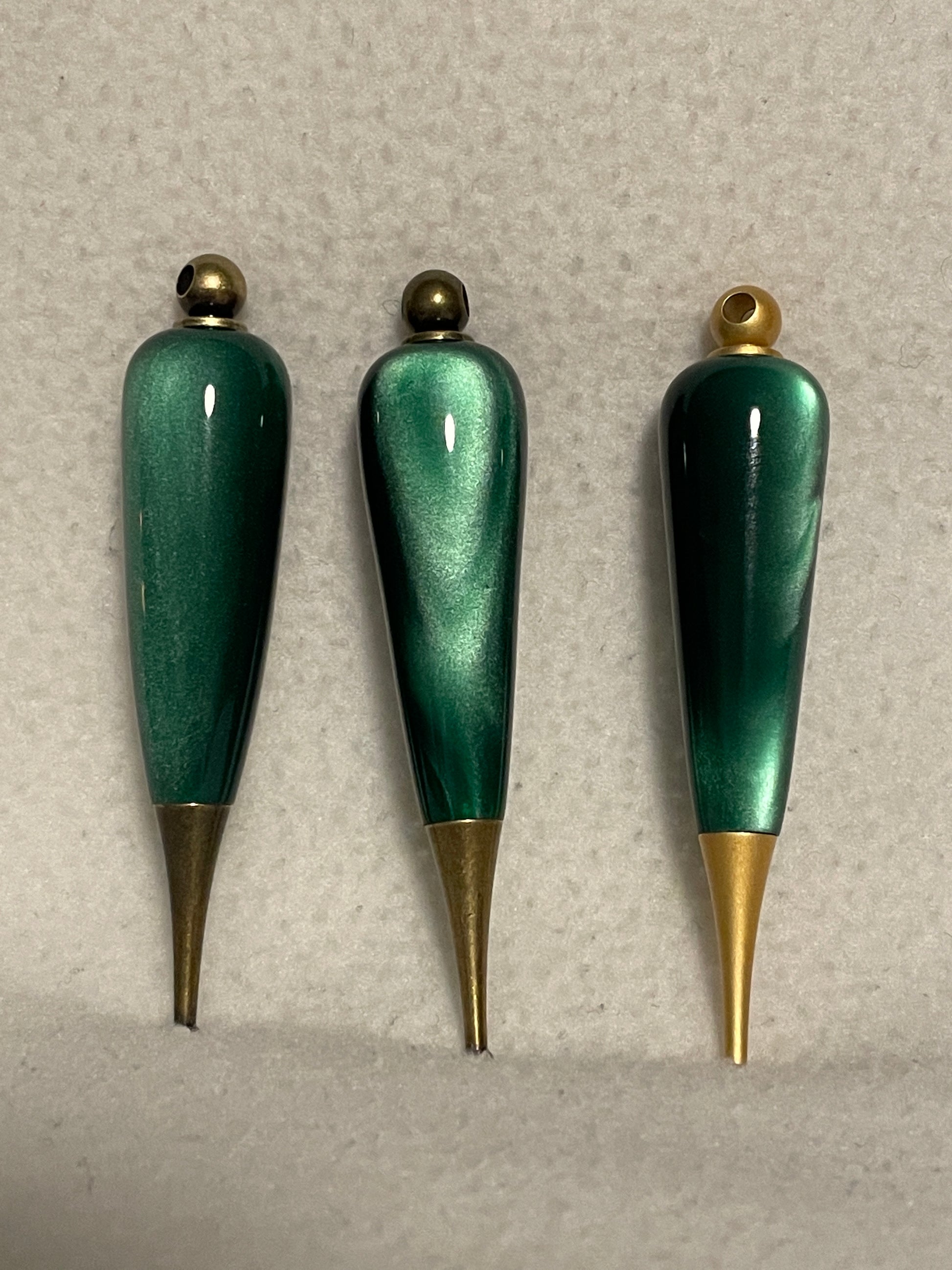 Christmas Ornaments- Dark Forest Green Acrylic bodies, Antique Brass and Satin Gold Trim