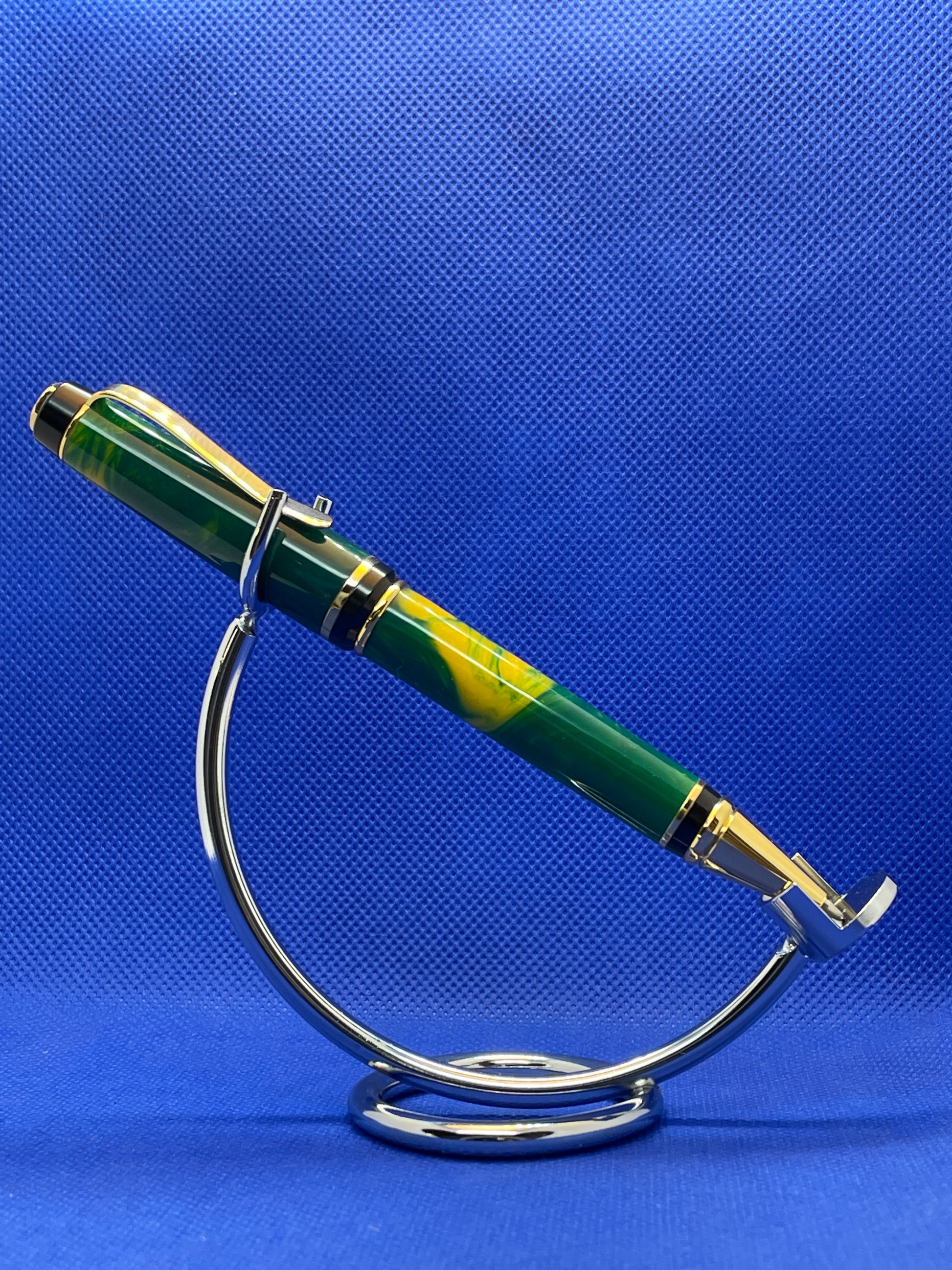 This Cigar ballpoint pen features gold and black fittings and a "Forest Sunlight" resin body. The bight yellows and lively highlights to the rich green base of the pen body. This pen uses standard Parker style refills.