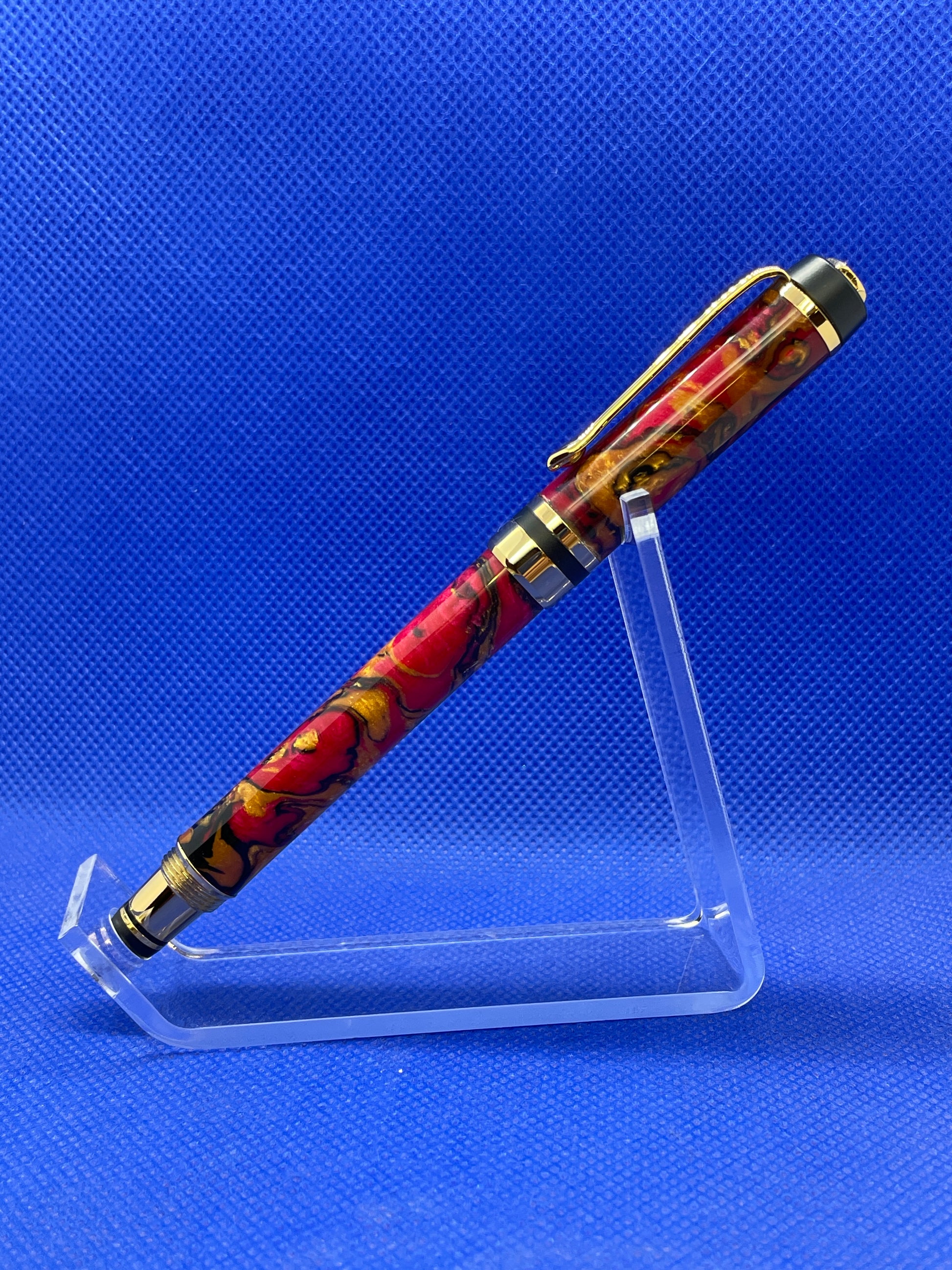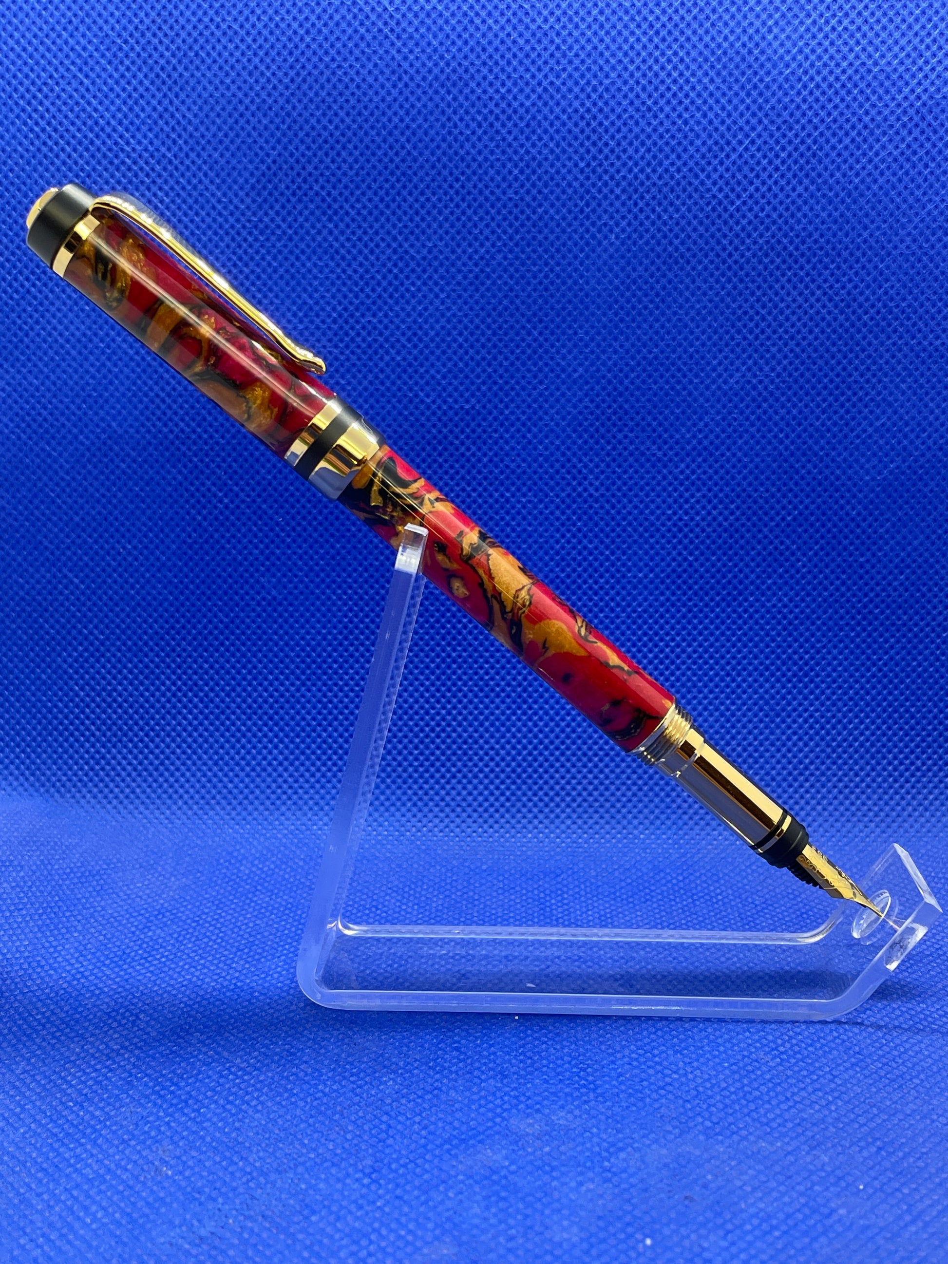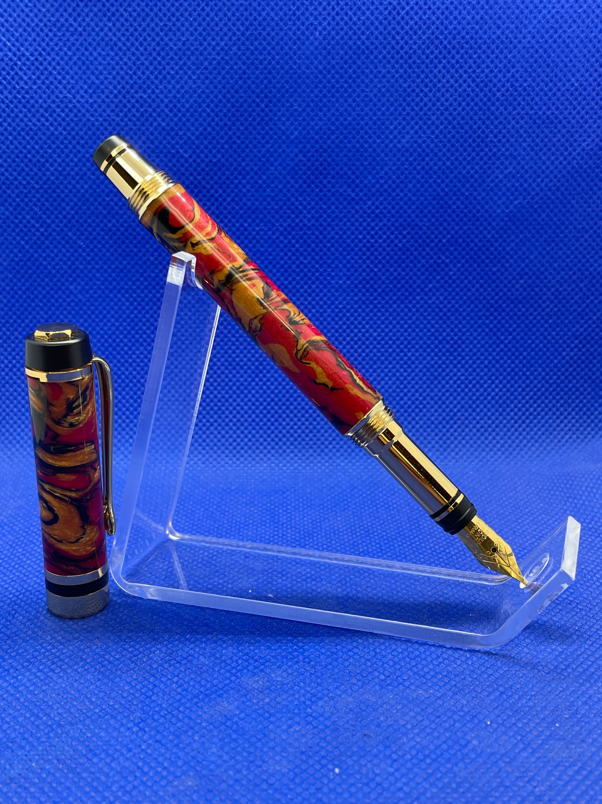 This Classic Elite fountain pen features a colourful Pearlux "Banshee" body with 24K gold and black chrome trim. It is a light weight and well balanced pen with a slightly smaller diameter than many fountain pens. It uses an included screw type ink converter for use with bottled inks and will also accept universal ink cartridges.