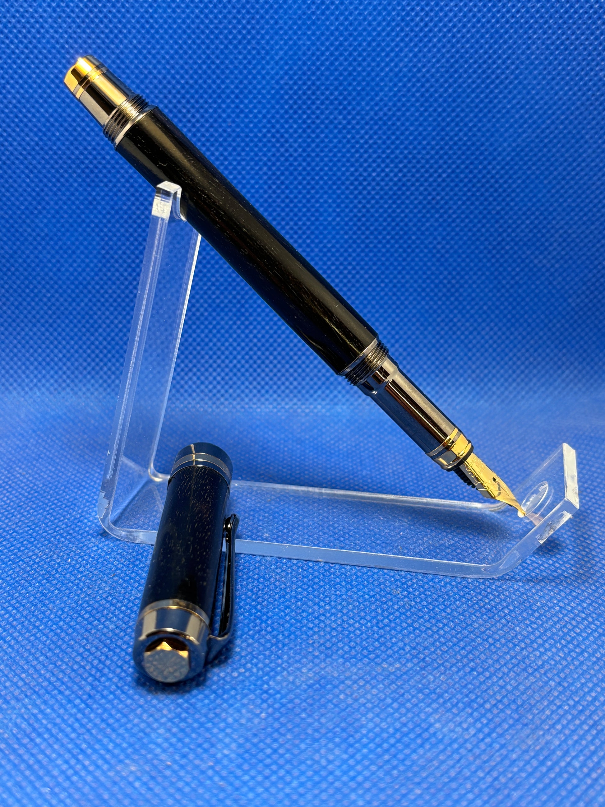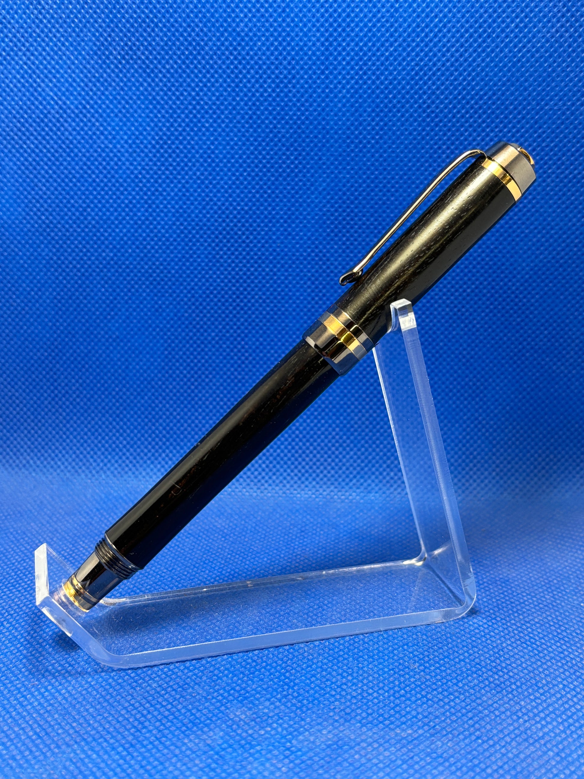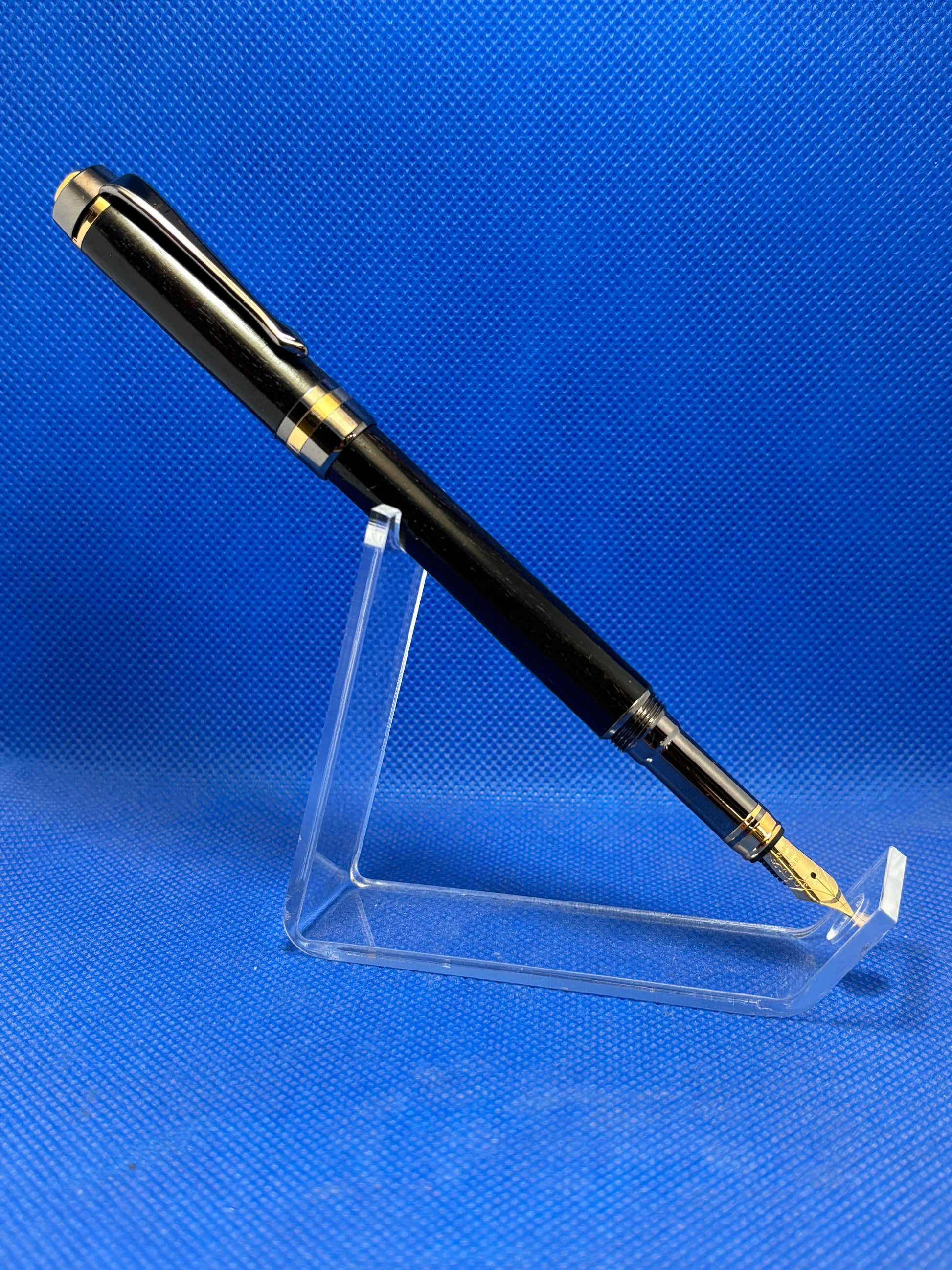 This Classic Elite fountain pen features a dark Ebony body with 24K gold and gun metal trim. It is a light weight and well balanced pen with a slightly smaller diameter than many fountain pens. It uses an included screw type ink converter for use with bottled inks and will also accept universal ink cartridges.
