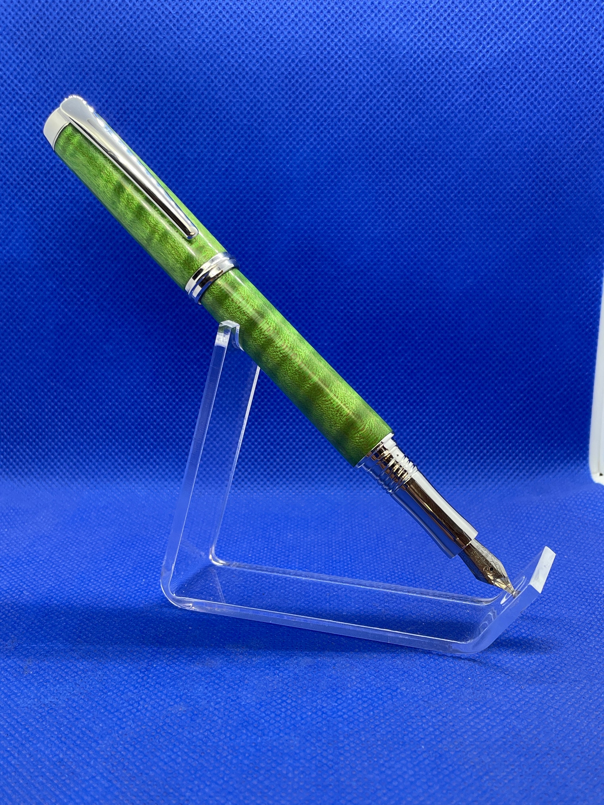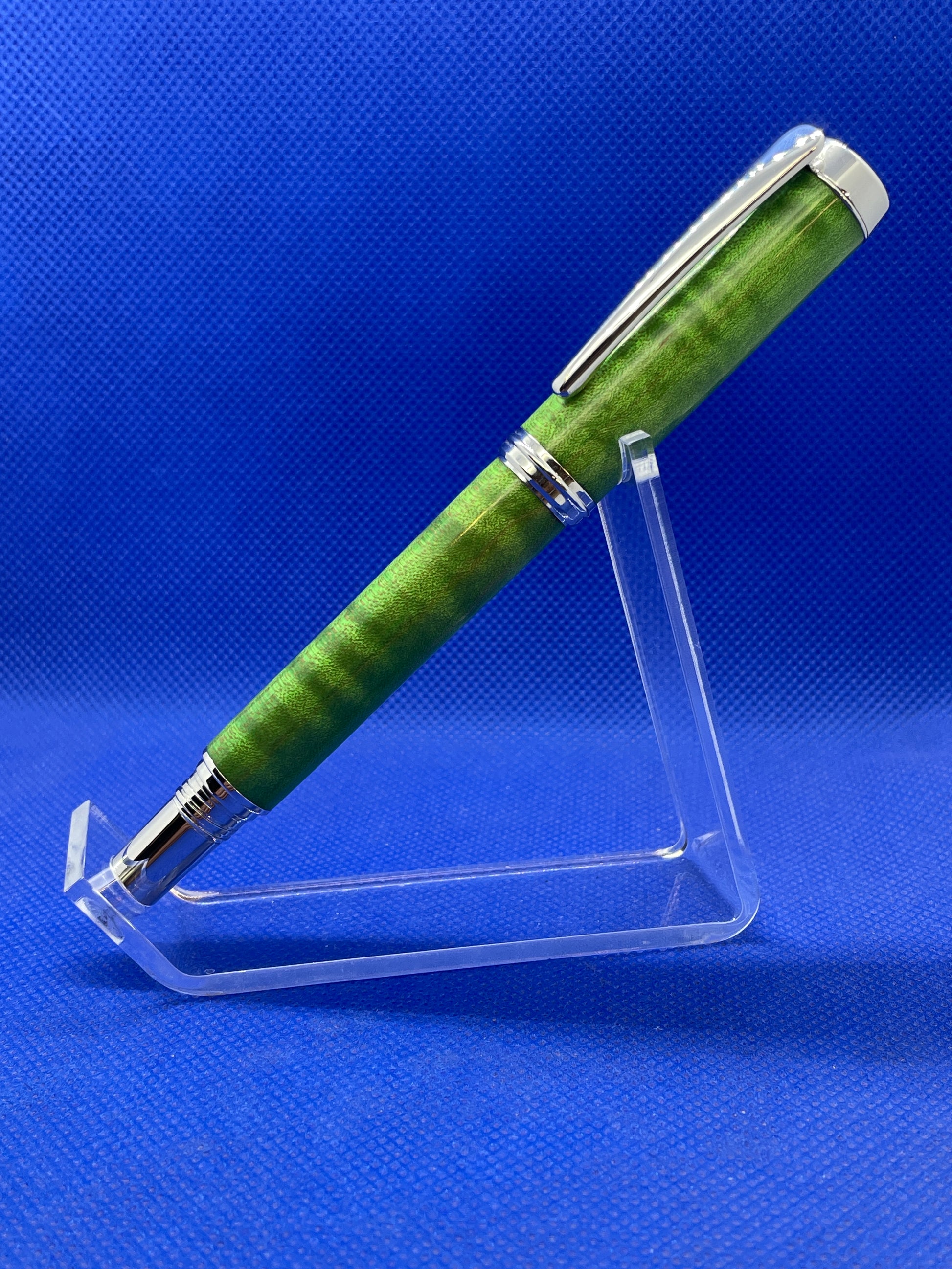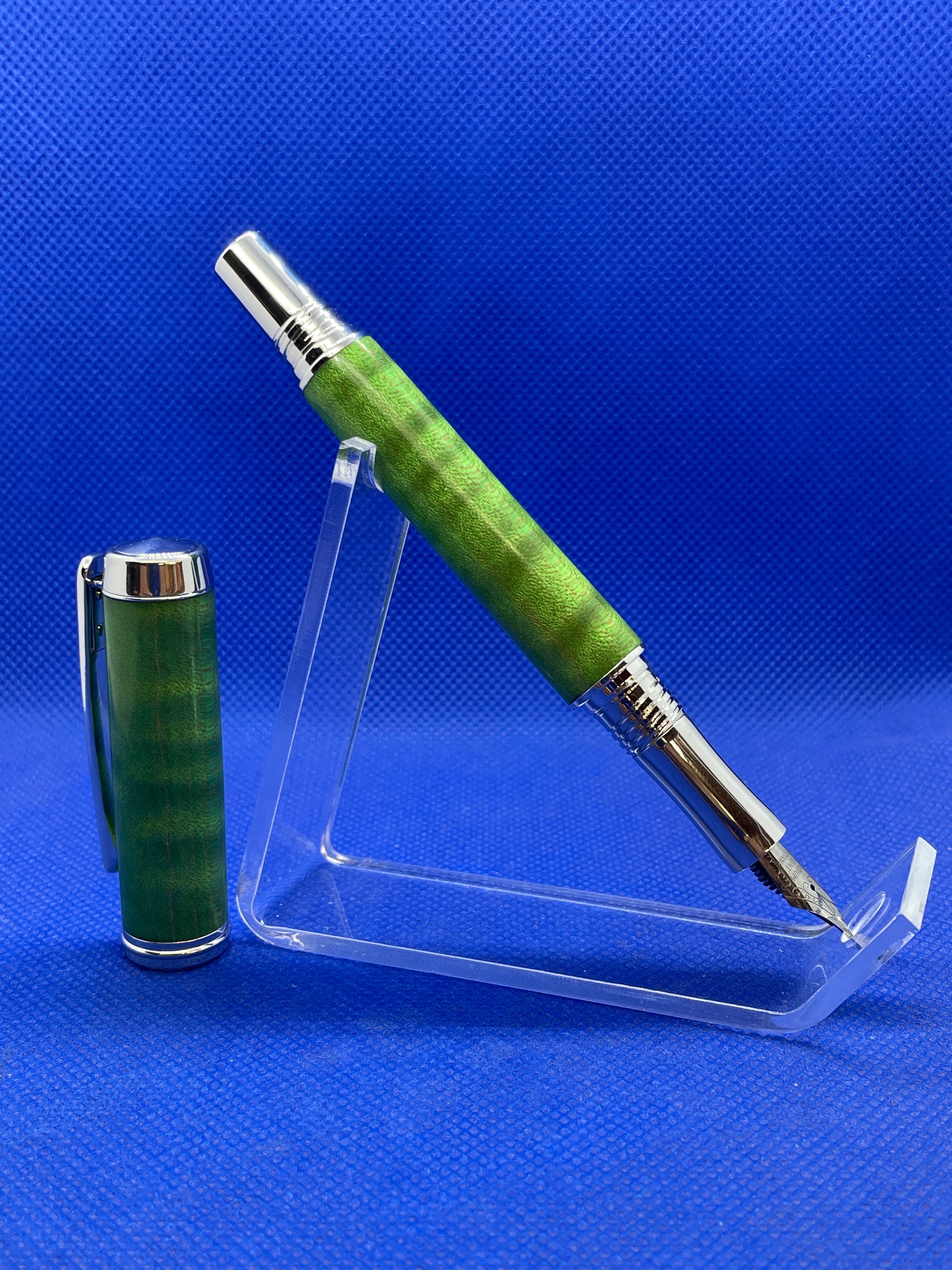 This beautiful fountain pen features a vibrant lime green curly maple body and brilliant Rhodium trim. This is stunning pen that uses either universal fountain pen cartridges, or an included ink pump for filling from an ink bottle.