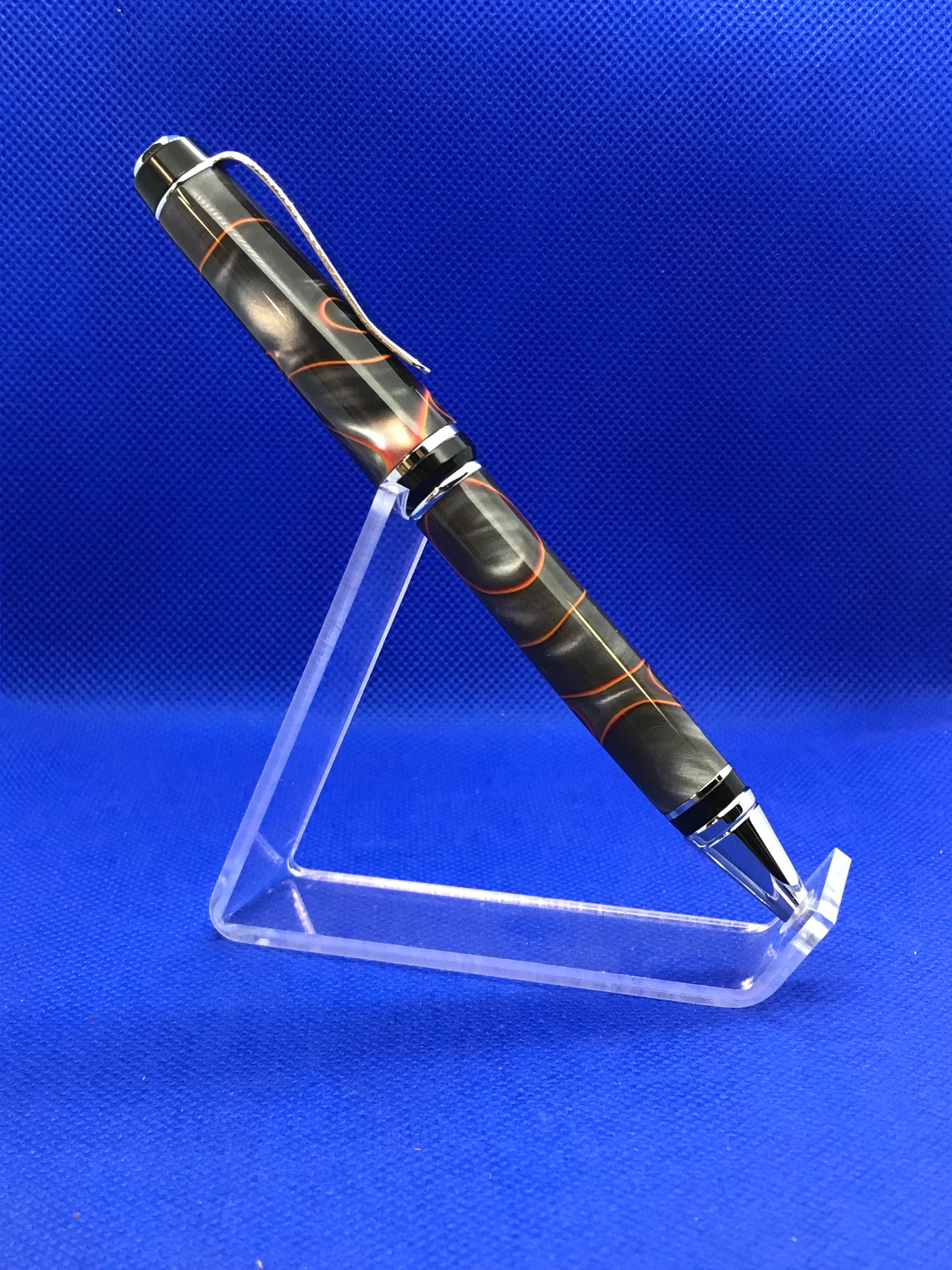 This Cigar ballpoint pen features chrome fittings and a bold "Silver Fury" acrylic acetate body. The orange swirls are a great accent to the silver and black body. Very well balanced in the hand and comfortable for long periods of writing. This pen comes in a window box and uses standard Parker style refills.