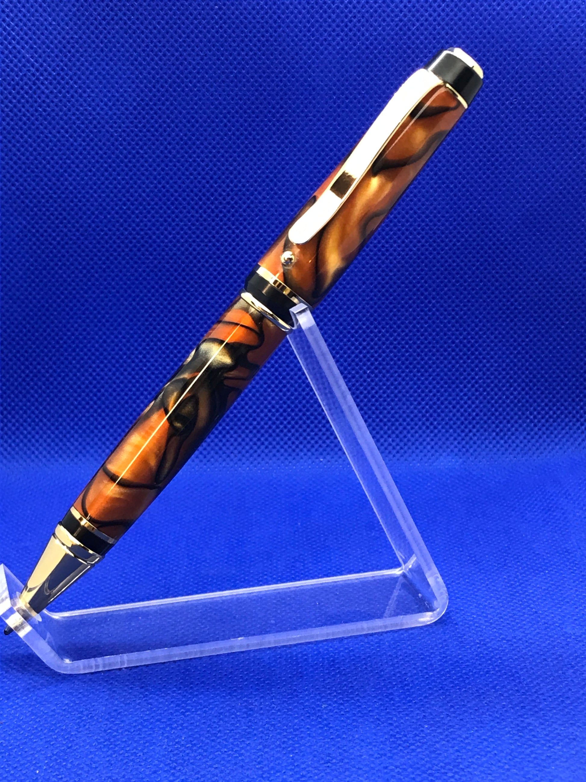 This Cigar ballpoint pen features gold fittings and a rich "Volcanic Flame" acrylic acetate body. The orange swirls are a great accent to the silver and black body. This pen uses standard Parker style refills.