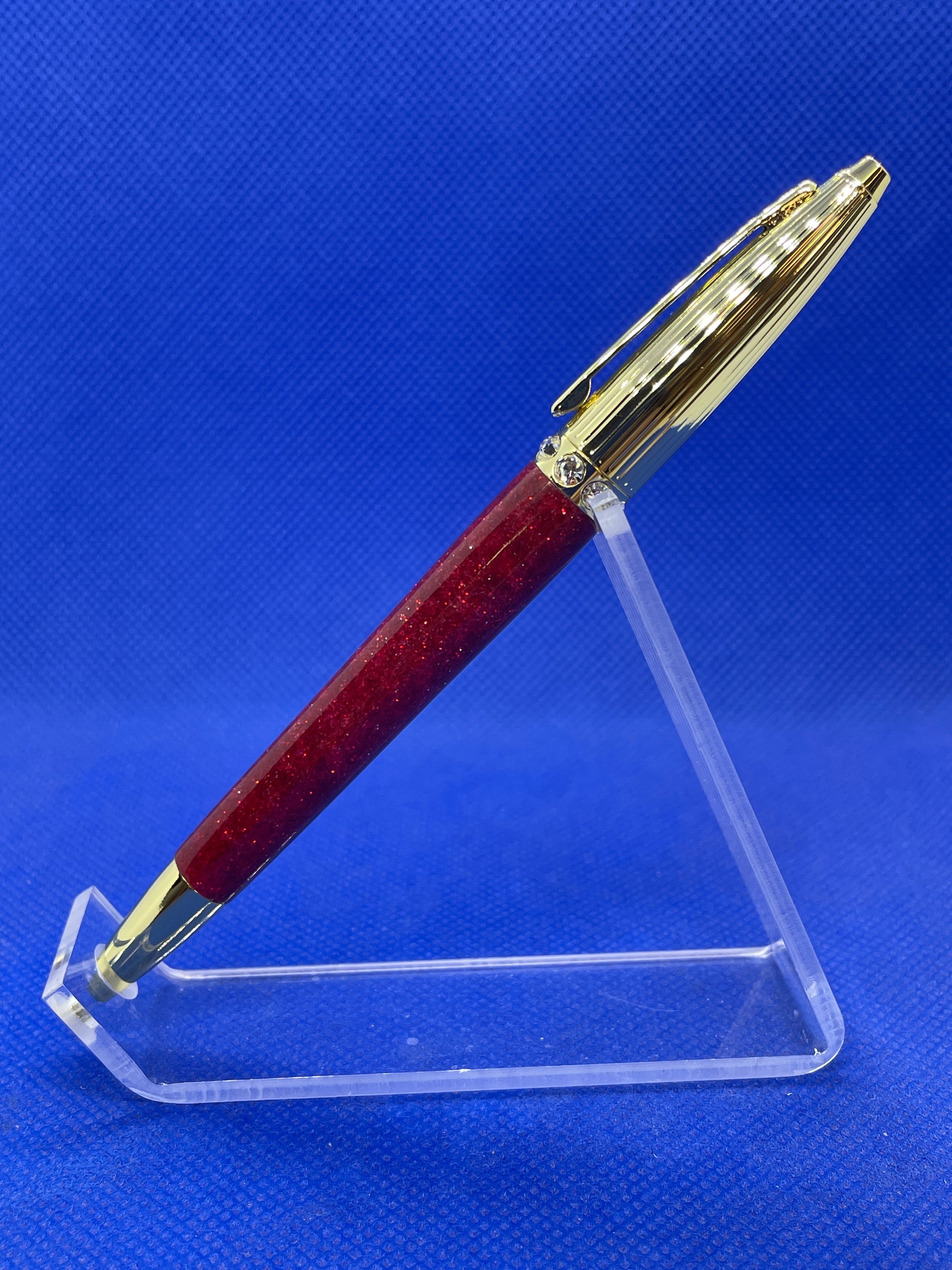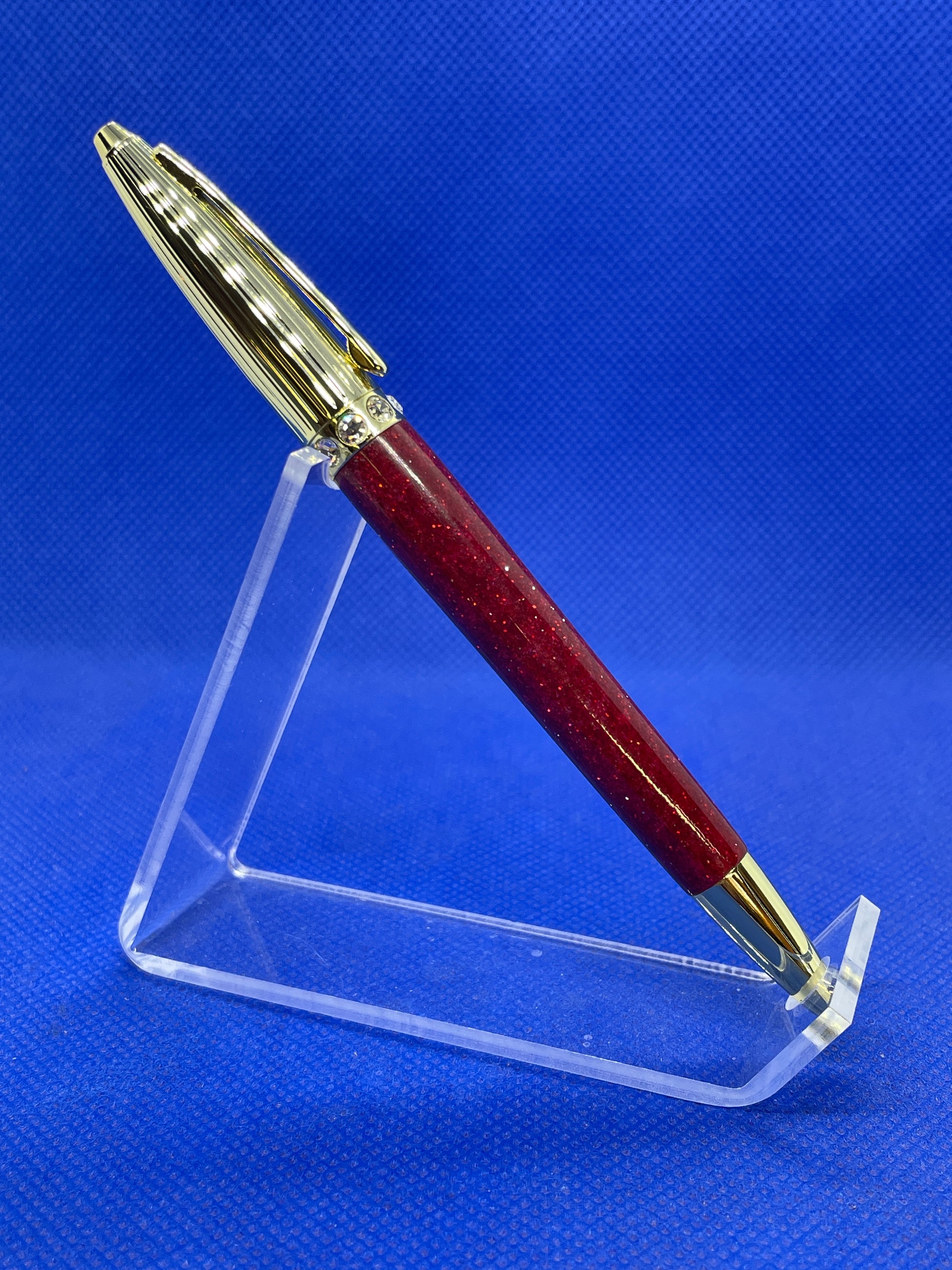 This Duchess ballpoint pen features an elegant ribbed gold top section with eight Swarovski crystals and a "Flare Glitter" resin body. This pen is both charming and fun! It uses standard Cross style refills.
