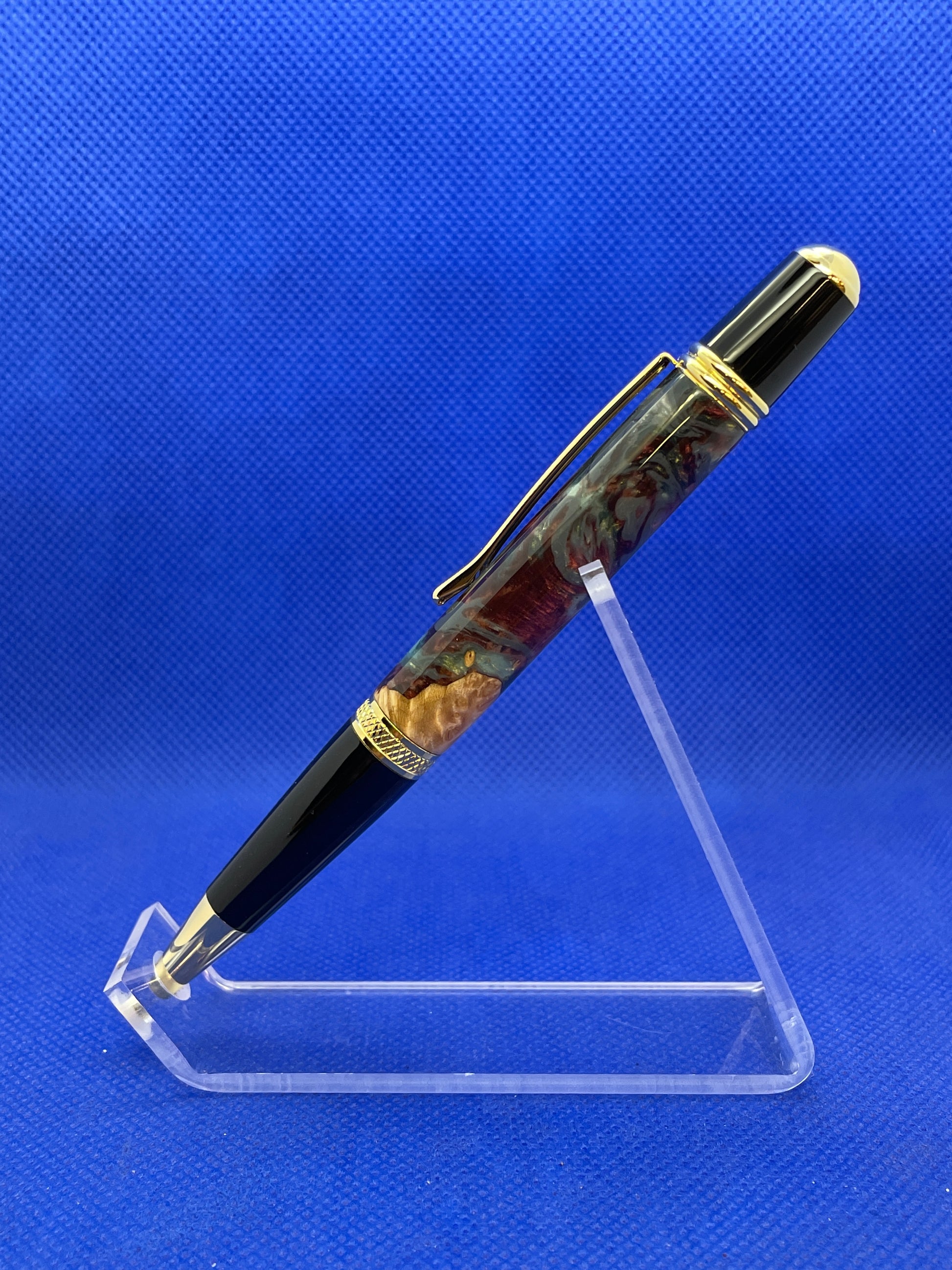 This Sierra ballpoint pen features gold and black trim with a unique "Nebula" multi-coloured resin and Box Elder burl hybrid body. It uses standard Parker style refills.