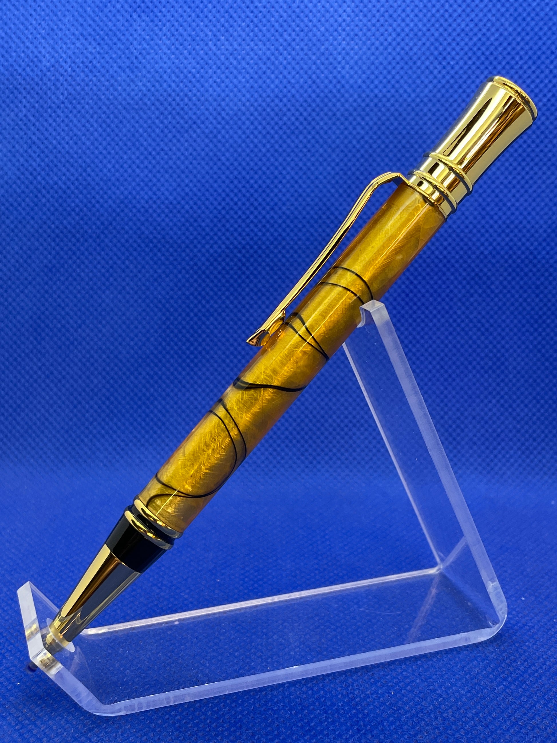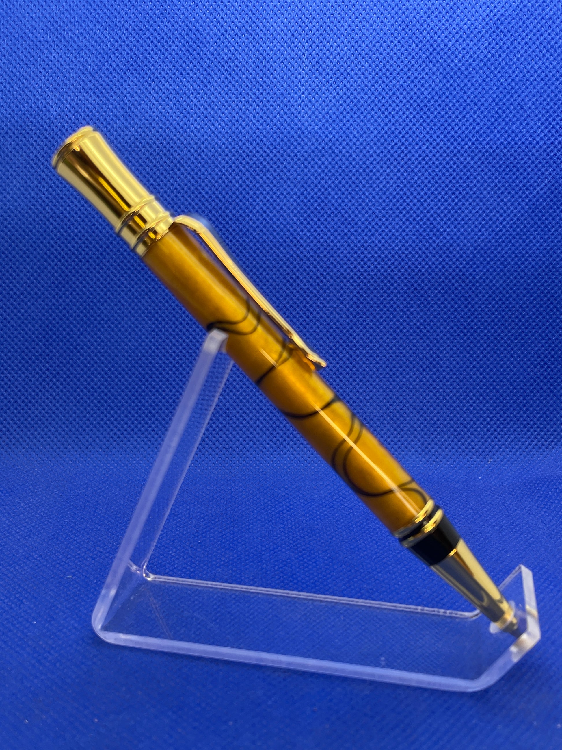This Corporate twist ballpoint pen features a "Volcanic Flame" acrylic acetate body and gold metalwork. It is a very nicely weighted and balanced pen and it uses a standard Parker style refill.