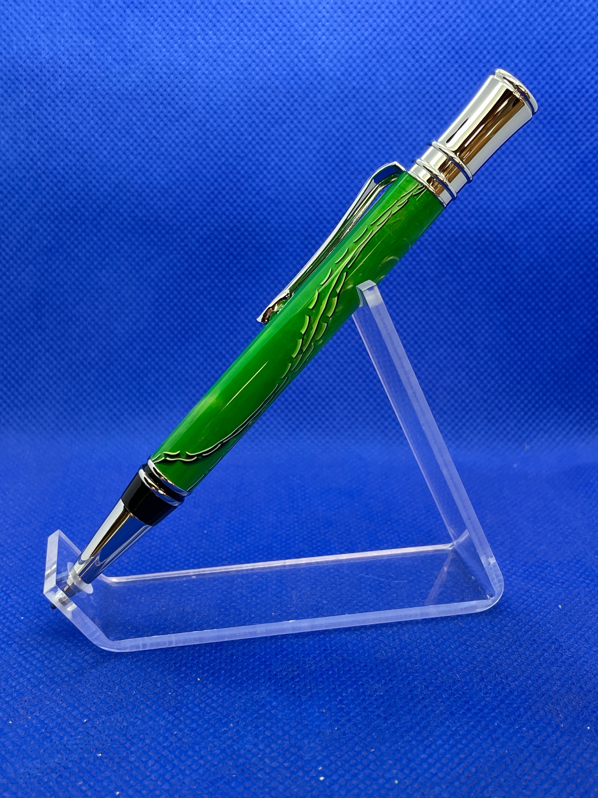 This Corporate twist ballpoint pen features a "Cosmic Green" acrylic acetate body and chrome metalwork. It is a very nicely weighted and balanced pen and it uses a standard Parker style refill.
