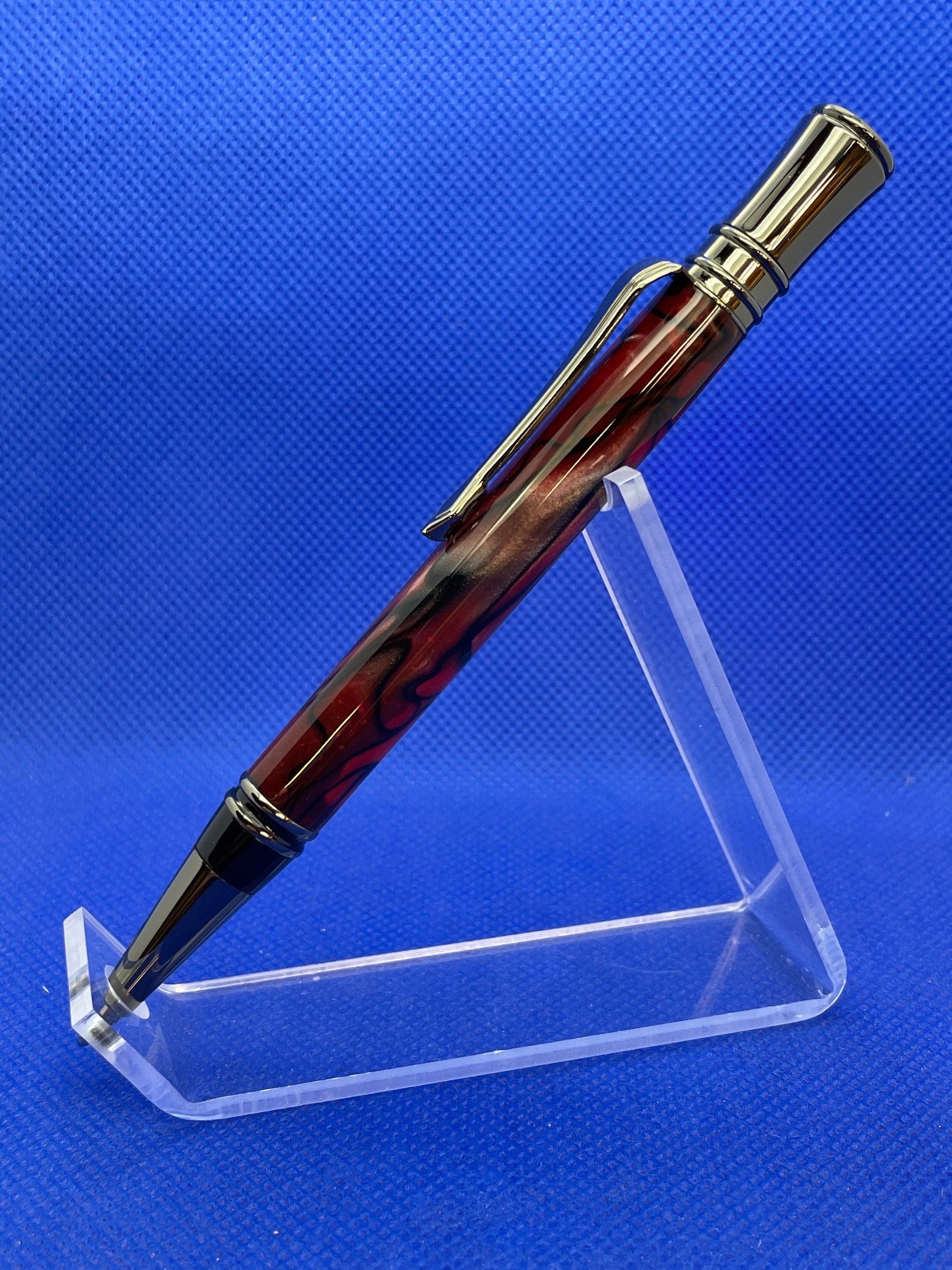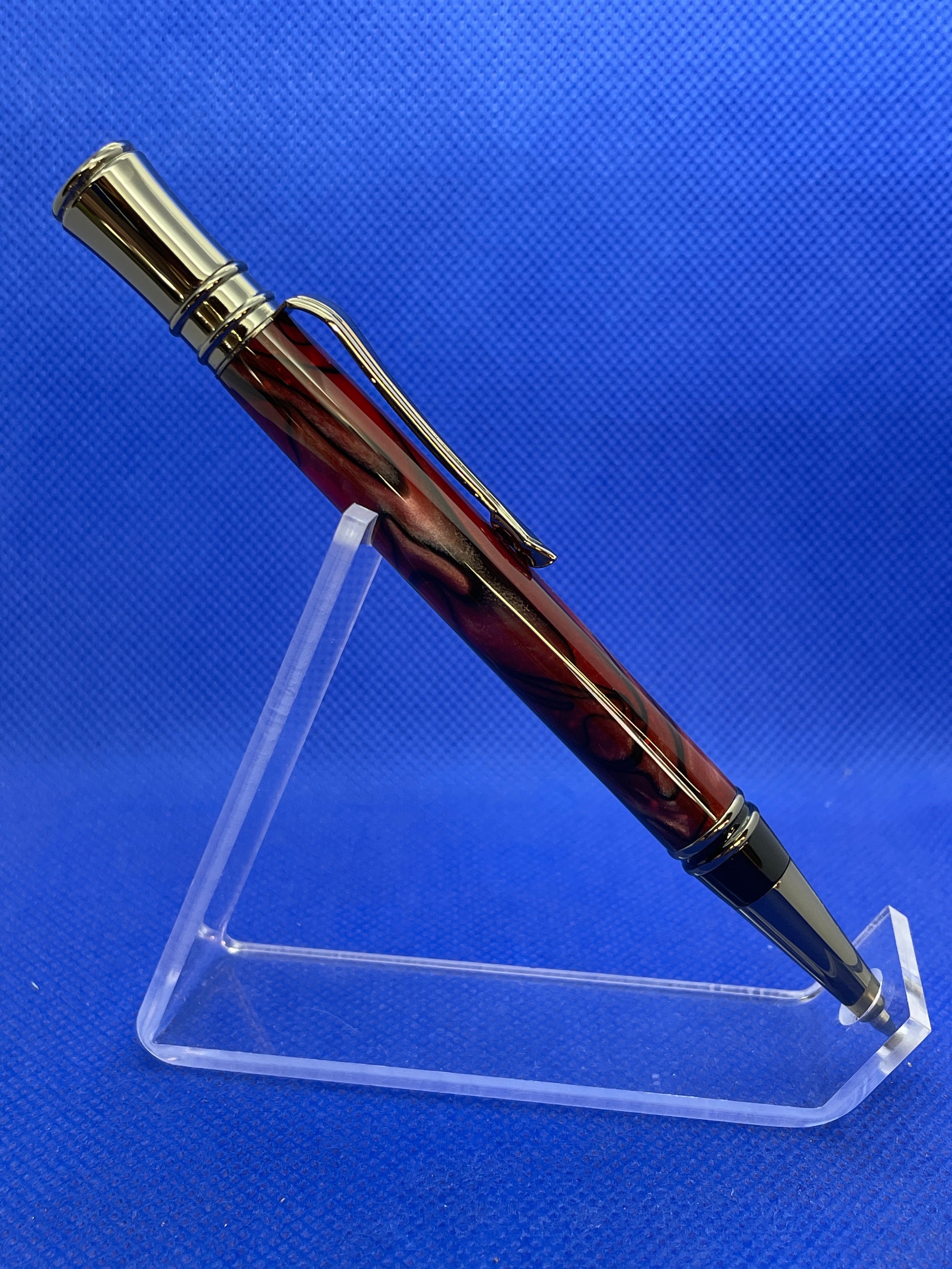 This Corporate twist ballpoint pen features a "Black Cherry" acrylic acetate body and gunmetal metalwork. It is a very nicely weighted and balanced pen and it uses a standard Parker style refill.