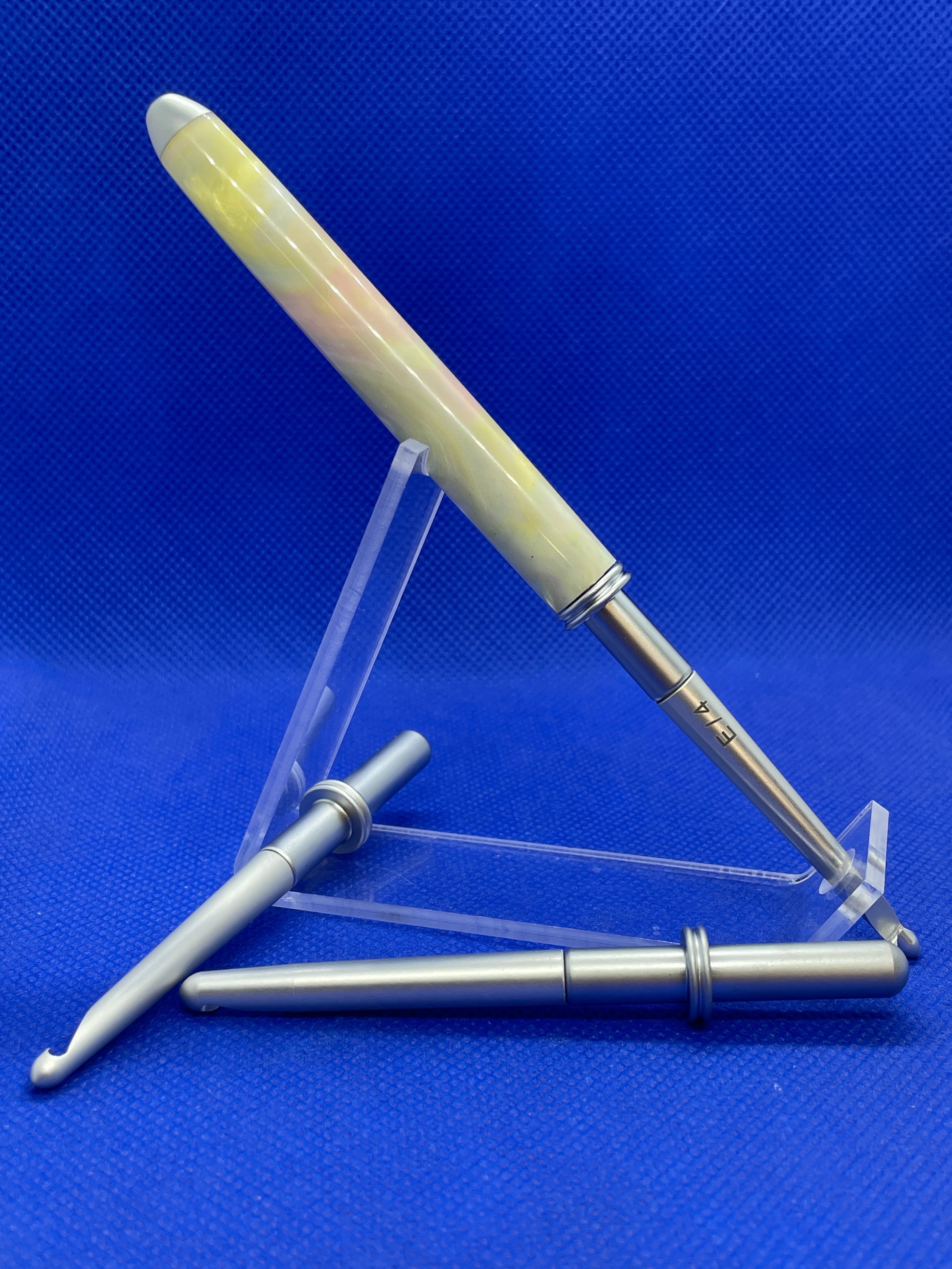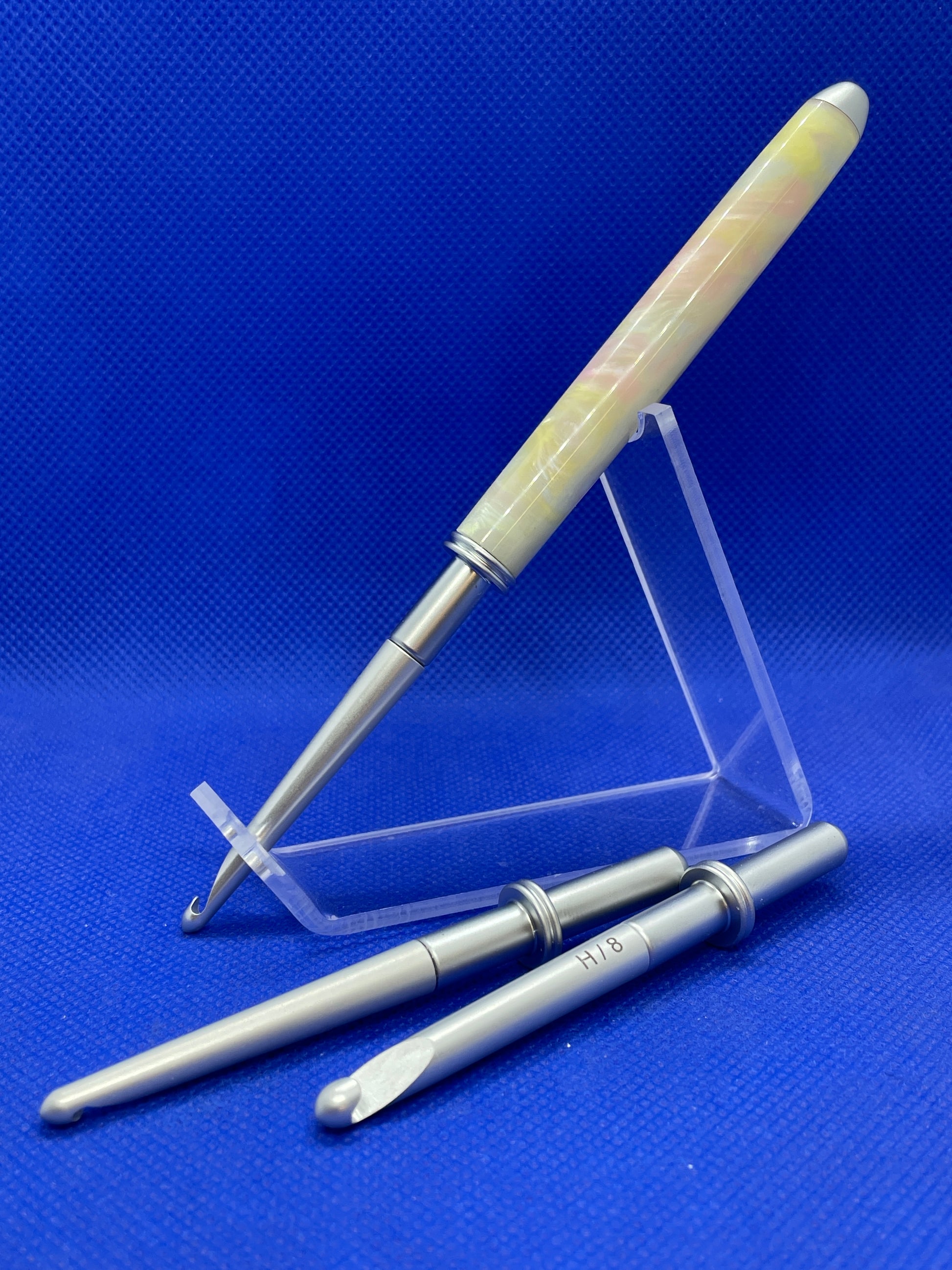 This crochet hook set includes a handle maple from "Four Colour Opal" resin, and 3 different sizes of interchangeable crochet hooks.