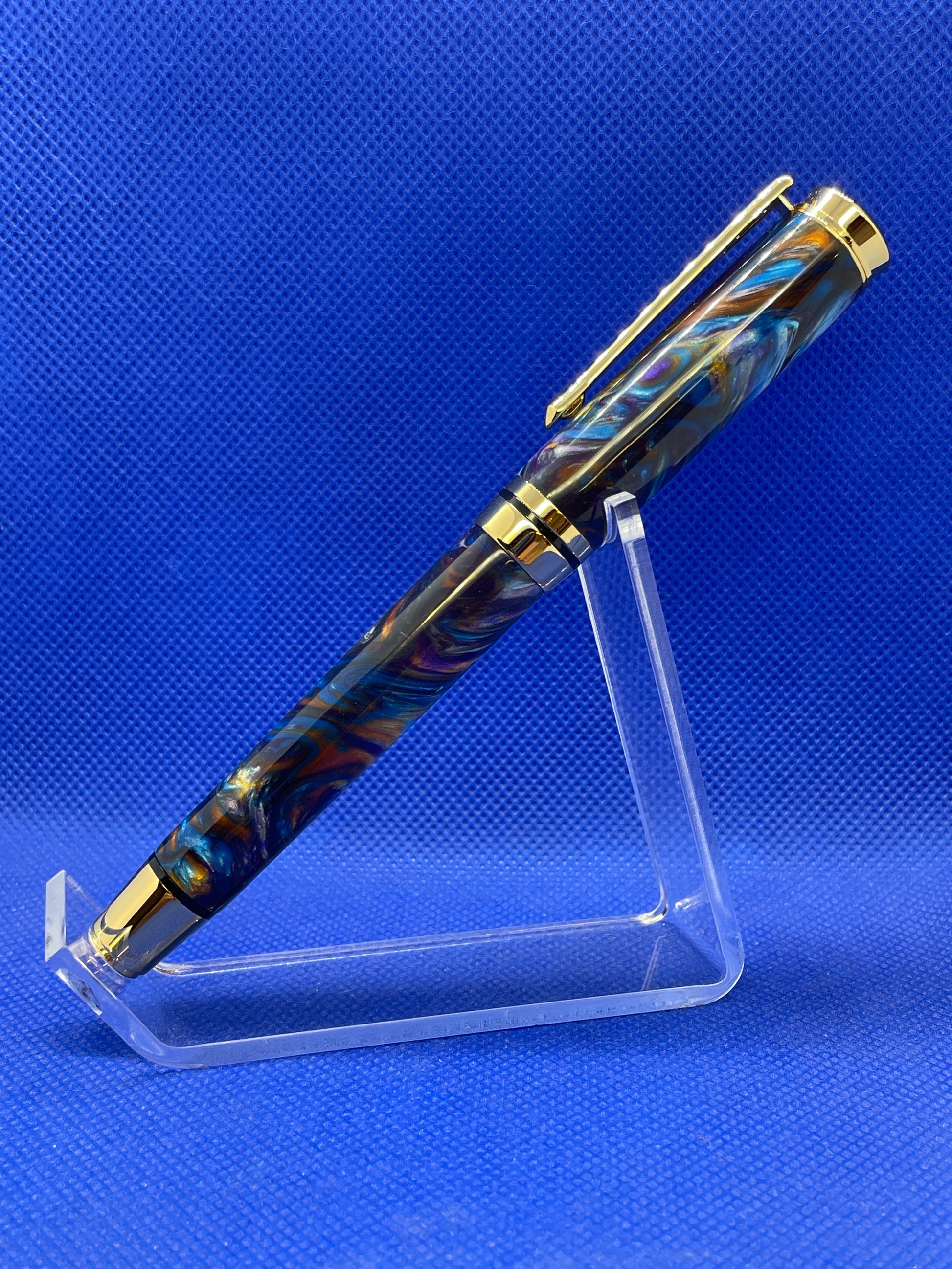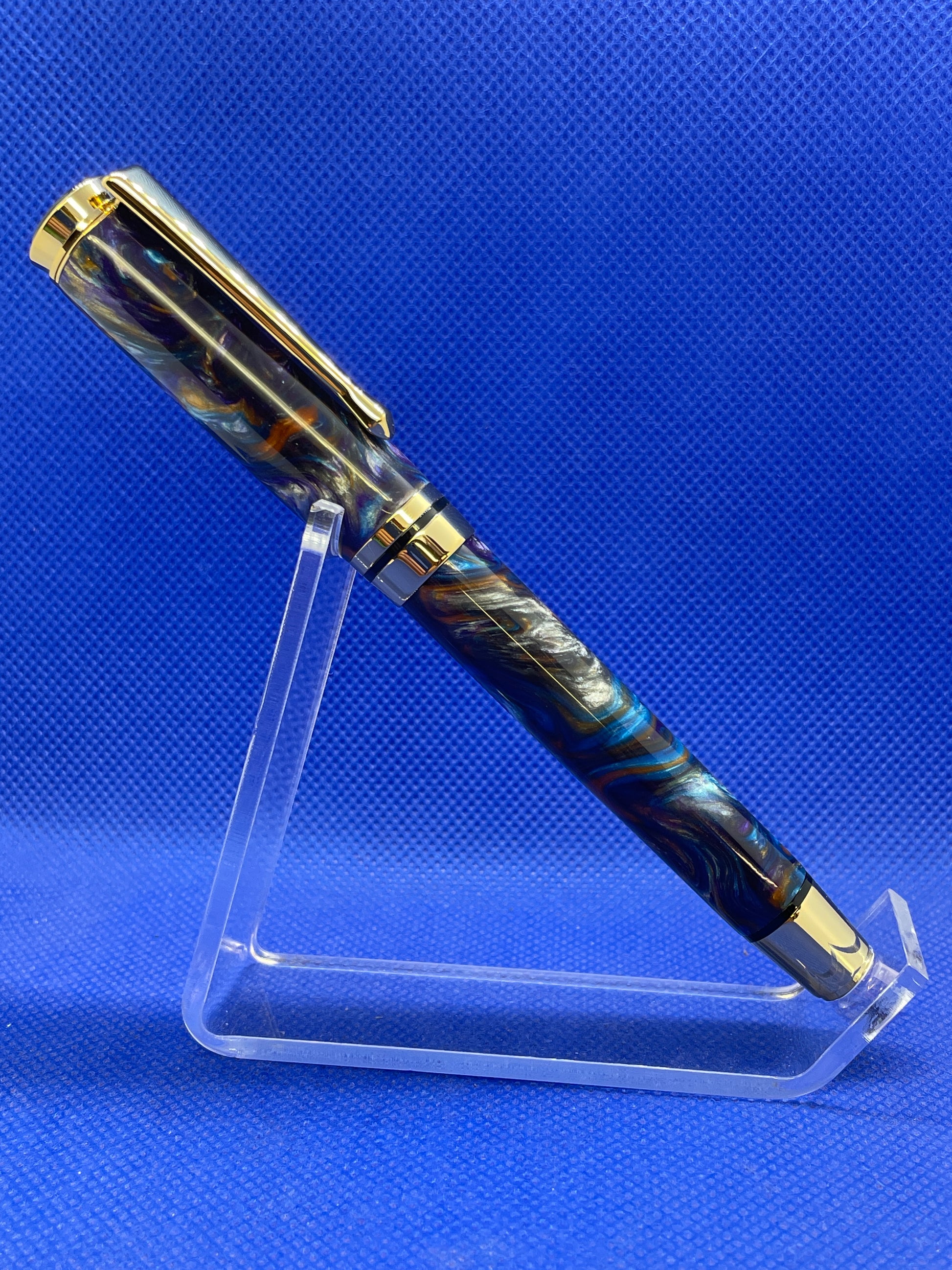 This Cyclone fountain pen features Gold and Black Chrome trim and a multicoloured "Nebula" resin body. The pen comes with a Beaufort #6 two-tone nib and an ink converter for use with bottled ink. The nib will also accept universal style ink cartridges.
