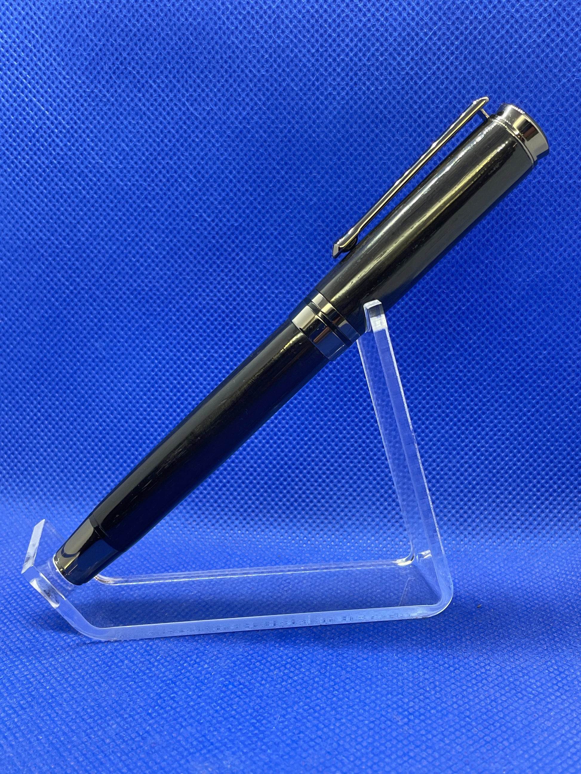 This Cyclone fountain pen features Gun Metal and Black Chrome trim and a 5500 year old Ukrainian bog oak body. This wood comes from an oak tree that rested at the bottom of a swamp for over 5000 years before being harvested and dried. The pen comes with a certificate of radio carbon dating from Laval University to verify its age. The nib on the pen is a Beaufort #6 two-tone nib and includes an ink converter for use with bottled ink. The nib will also accept universal style ink cartridges.