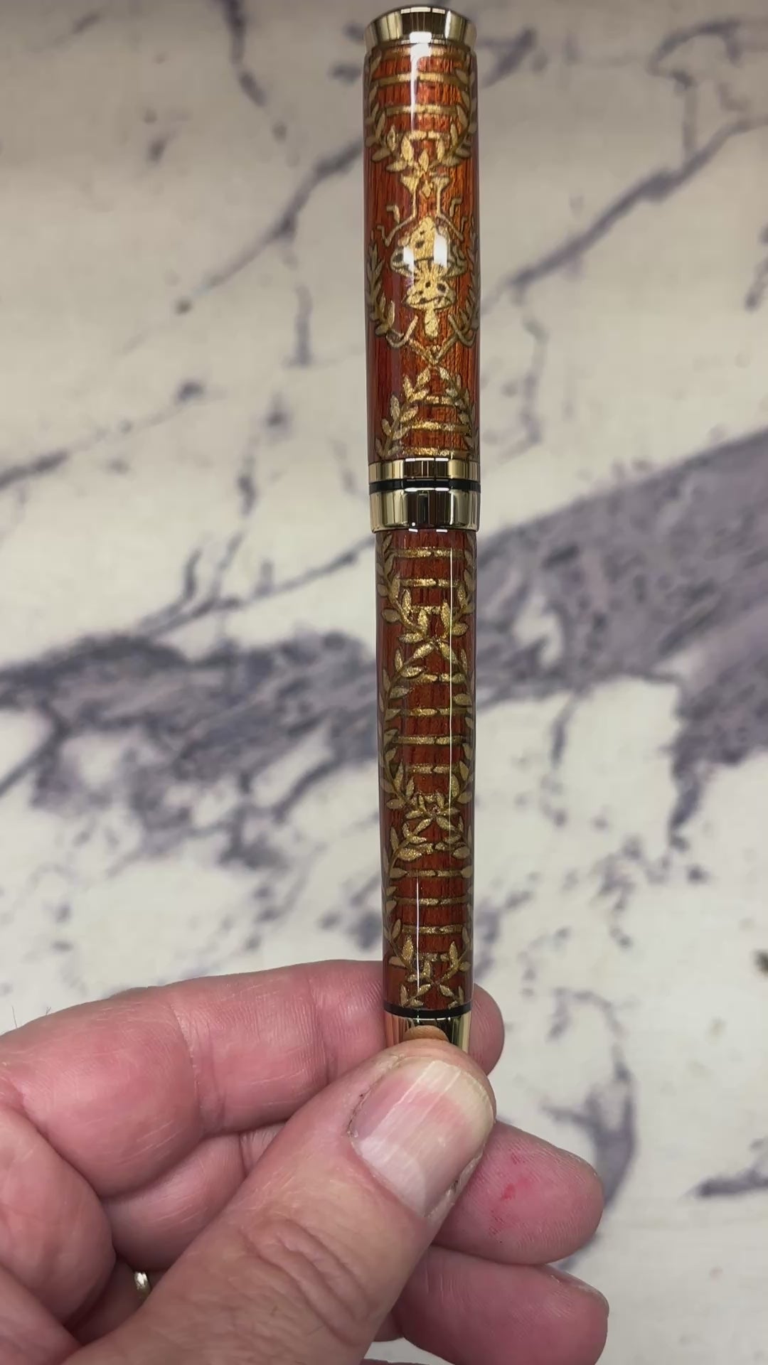 This Cyclone fountain pen features Gold and Black Chrome trim and a custom designed, hand painted design on a bloodwood body. The pen comes with a Beaufort #6 two-tone nib and an ink converter for use with bottled ink. The nib will also accept universal style ink cartridges.