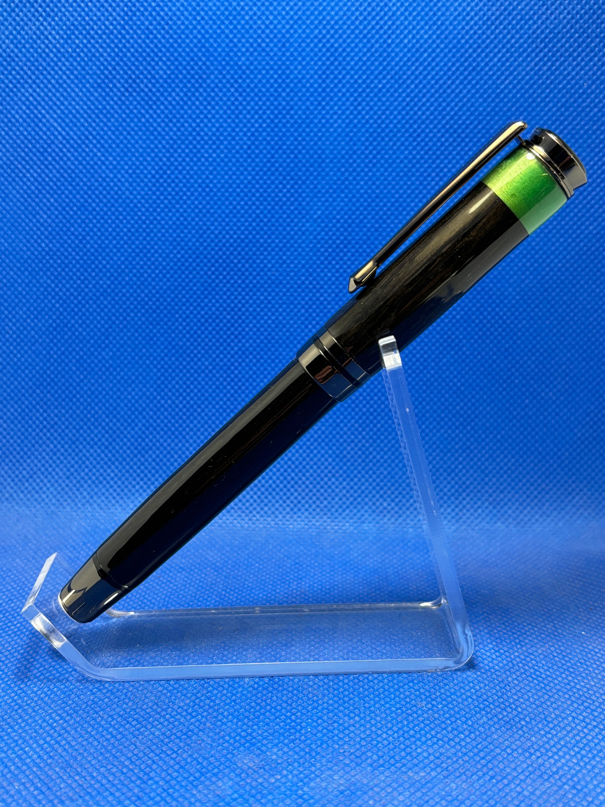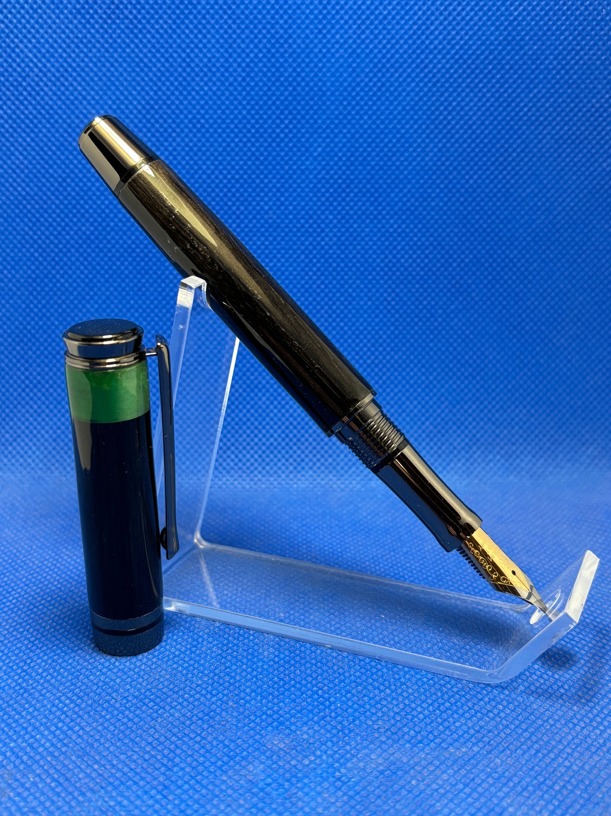 This Cyclone fountain pen features Gun Metal and Black Chrome trim and a 5500 year old Ukrainian bog oak body with green acrylic trim at the cap. This wood comes from an oak tree that rested at the bottom of a swamp for over 5000 years before being harvested and dried. The pen comes with a certificate of radio carbon dating from Laval University to verify its age.The pen comes with a Beaufort #6 two-tone nib and an ink converter for use with bottled ink. The nib will also accept universal style ink cartridges.