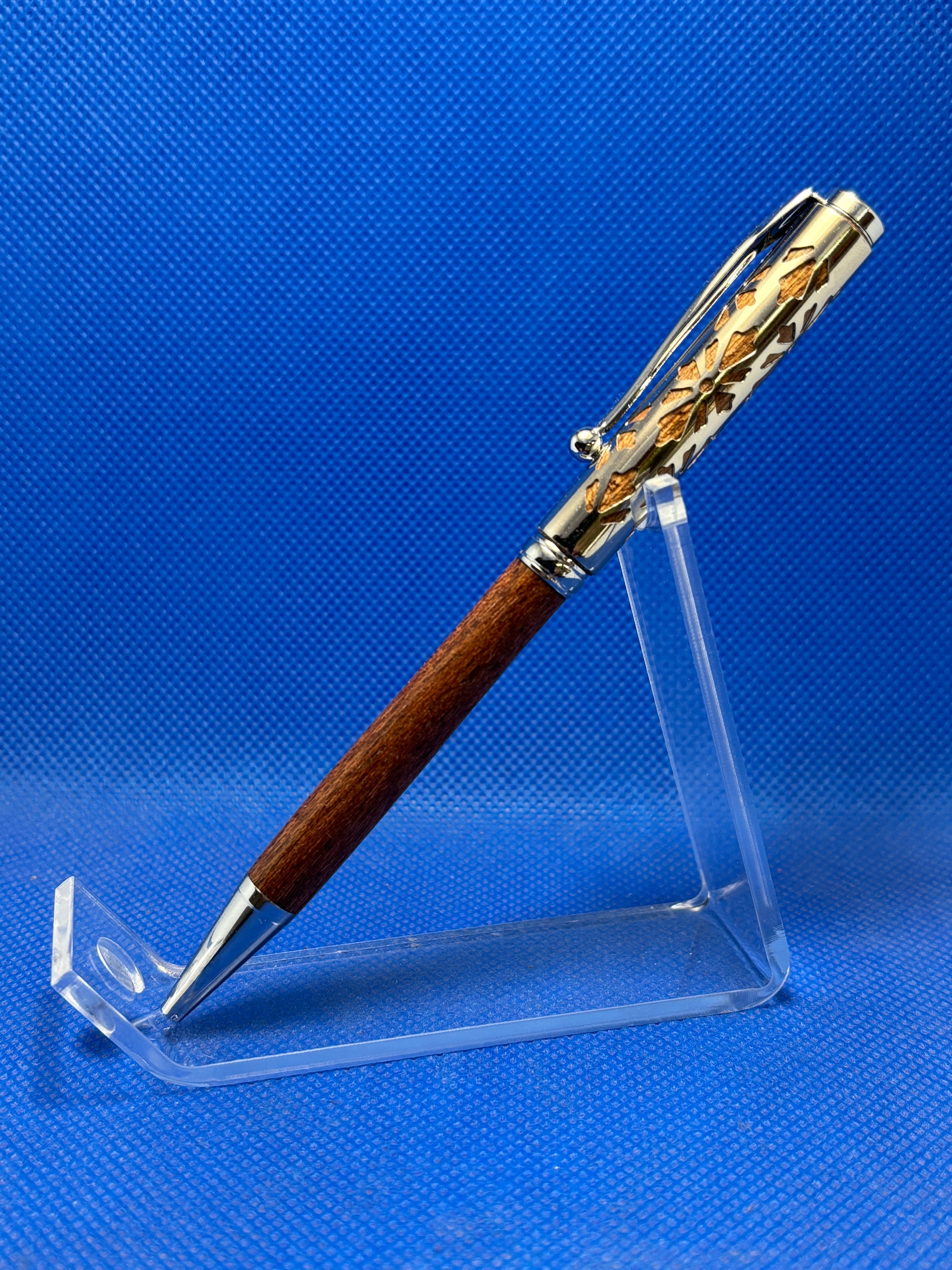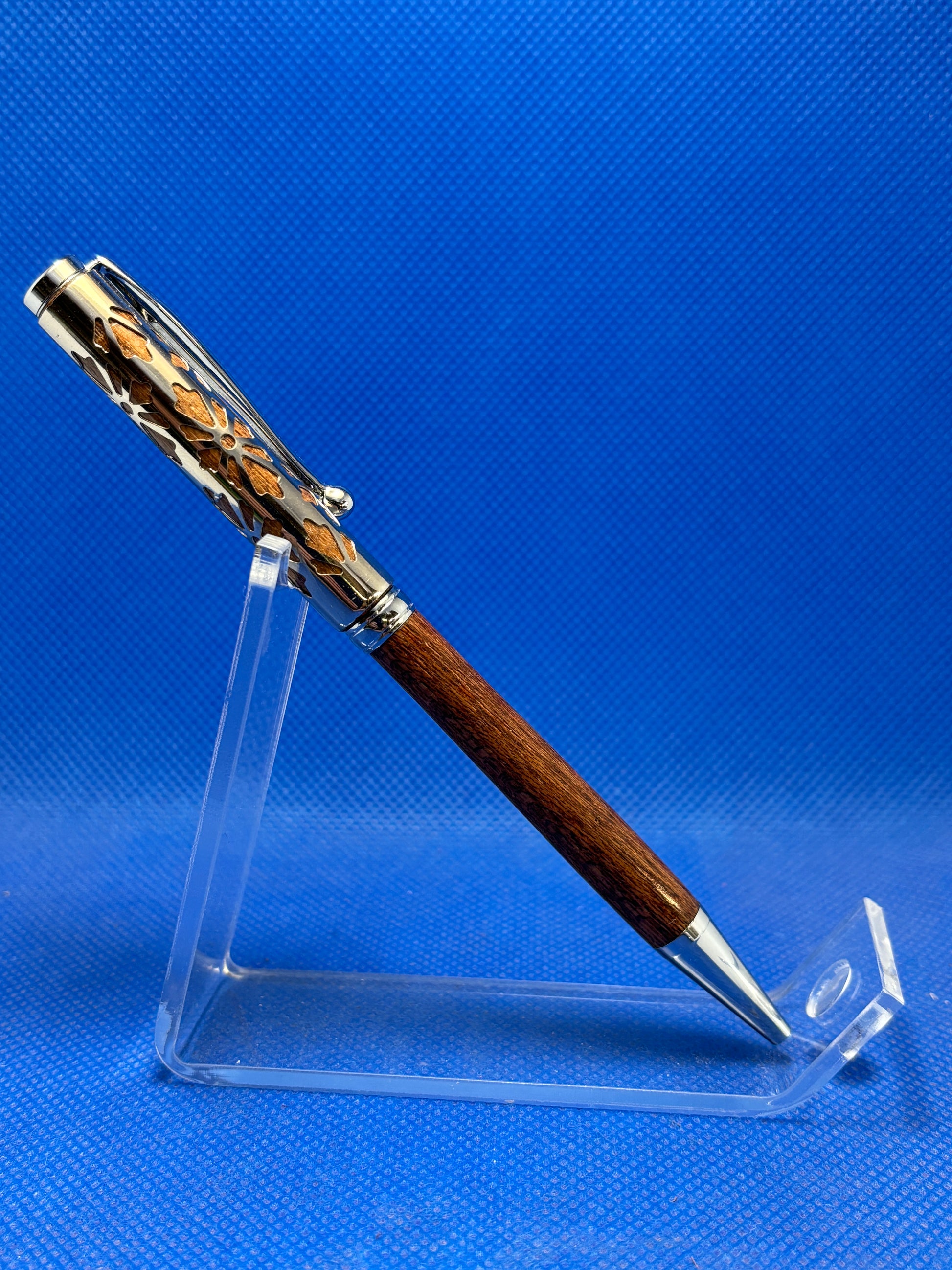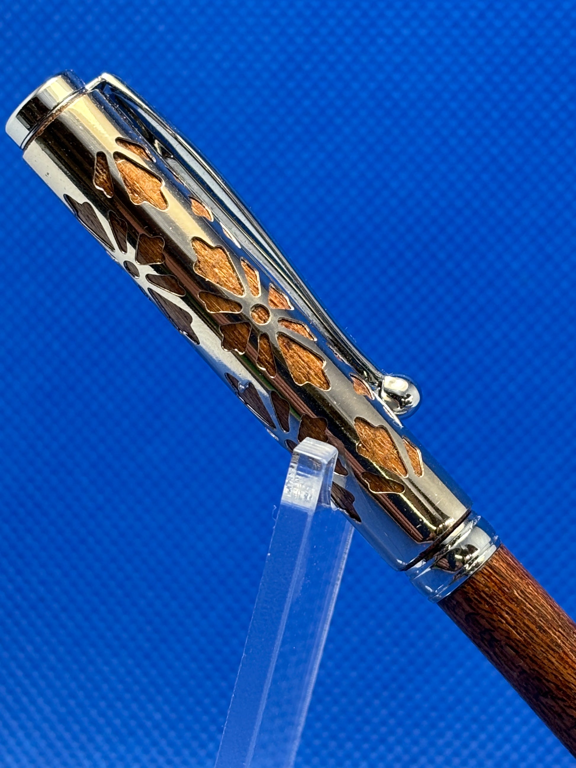 This Slimline ballpoint pen features chrome trim and a mahogany body. The special element is the decorative pierced sleeve on the upper section that adds an elegant touch to this pen. This pen uses "Cross" style refills.