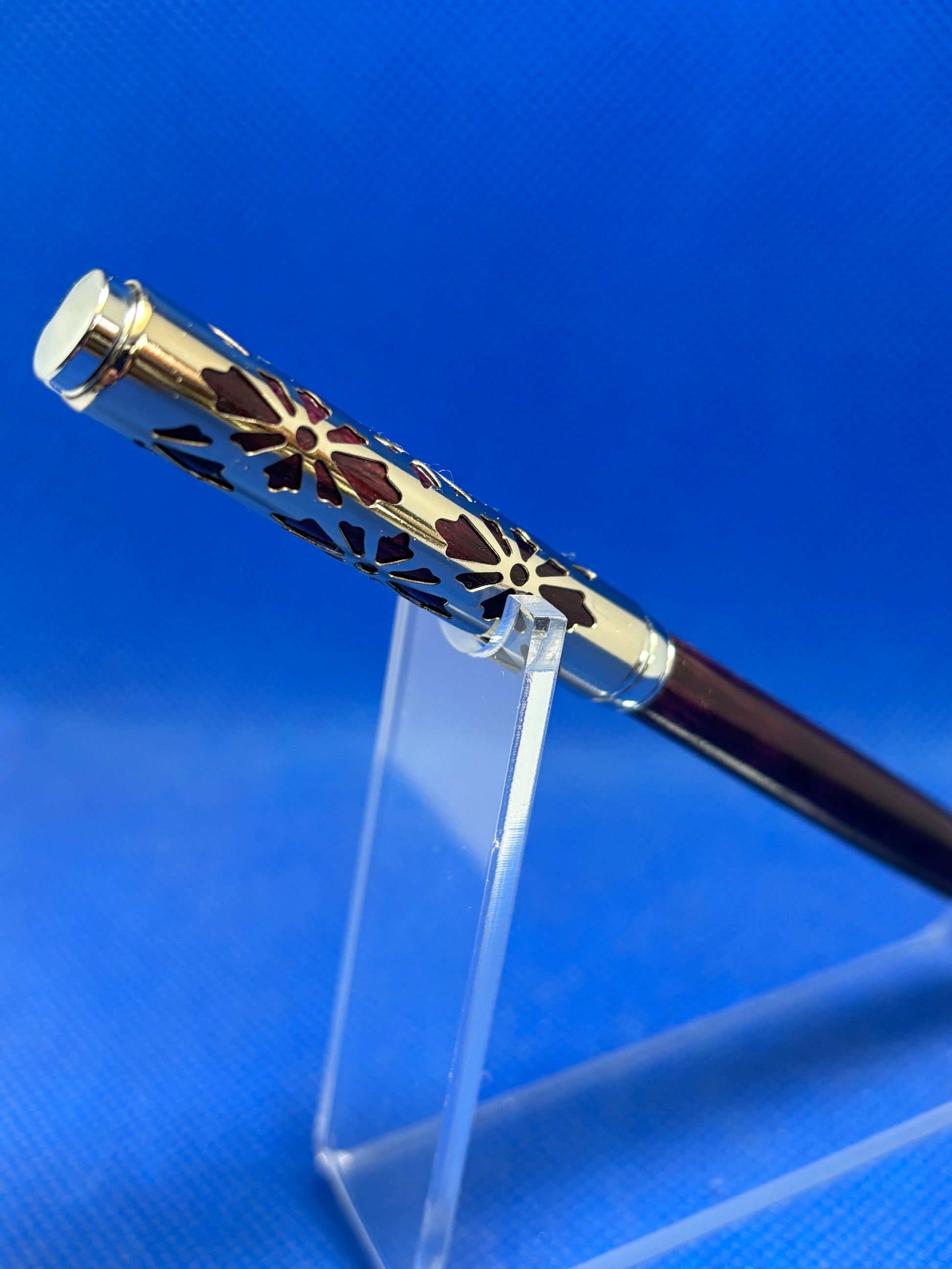This Slimline ballpoint pen features chrome trim and a Purple Heart body. The special element is the decorative pierced sleeve on the upper section that adds an elegant touch to this pen. This pen uses "Cross" style refills.
