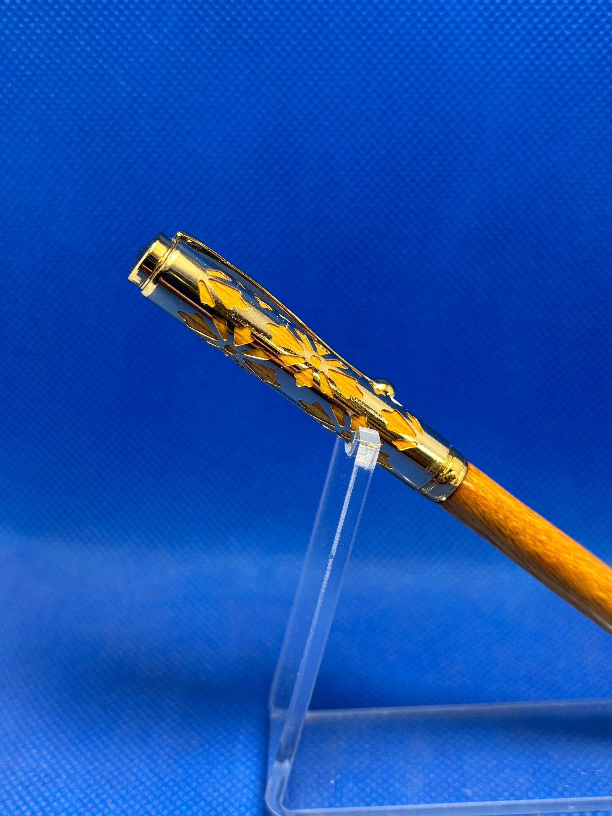 This Slimline ballpoint pen features gold trim and an Osage Orange wood body. The special element is the decorative pierced sleeve on the upper section that adds an elegant touch to this pen. This pen uses "Cross" style refills.