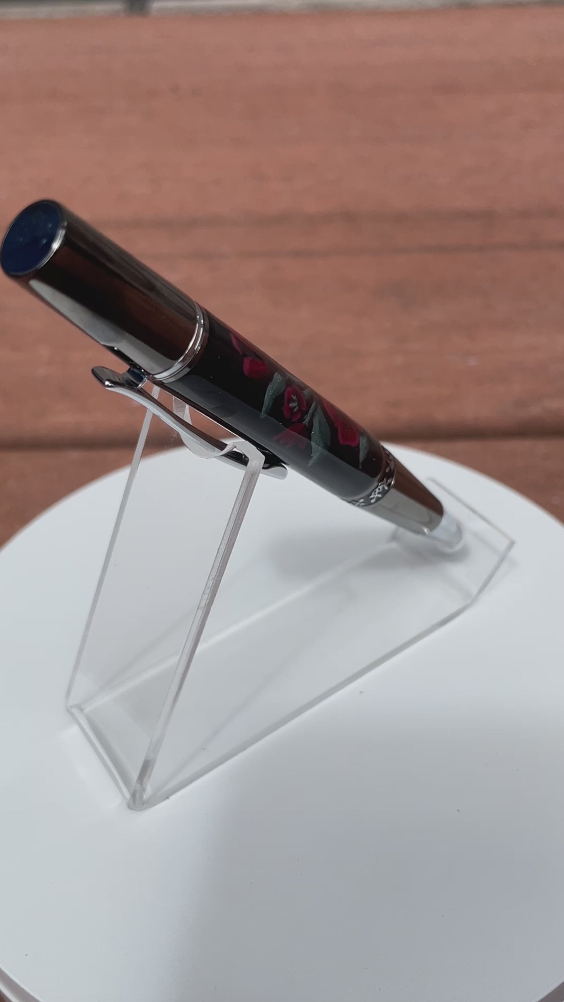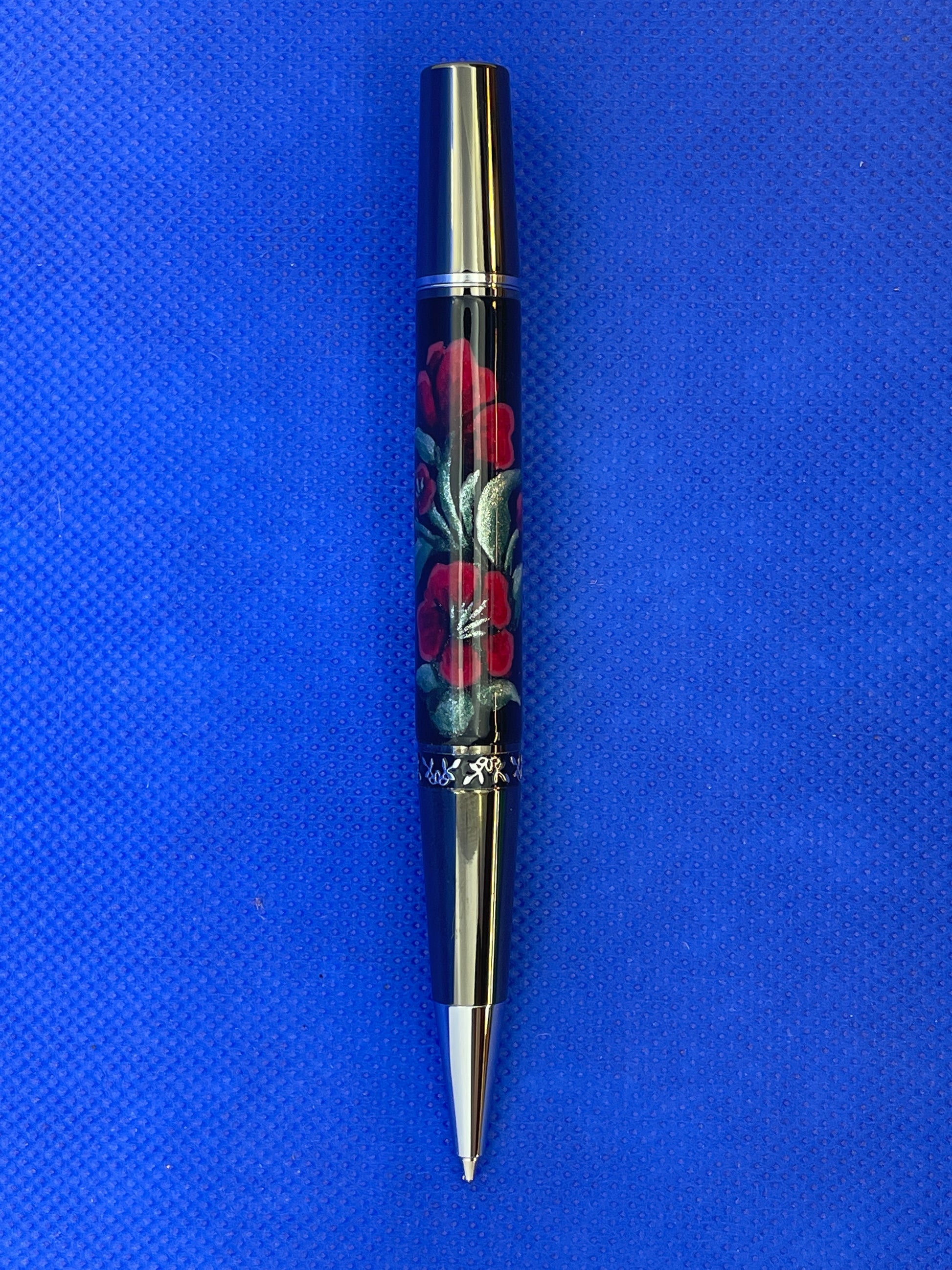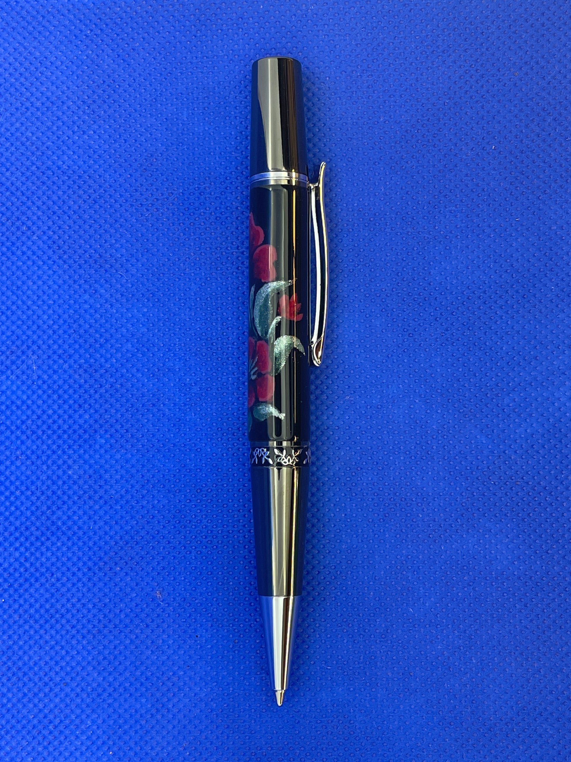 This pen makes a statement! It features stunningly beautifully hand painted flowers on a Diablo pen body. Pictures don't do it justice as natural light sparkles off of the paint. This is a true piece of art. The pen uses standard Parker style refills