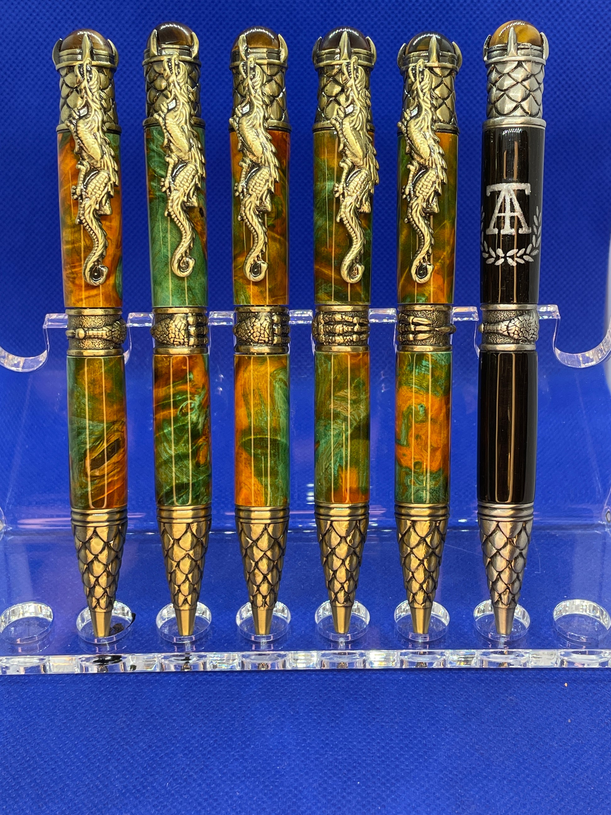 These Dragon ballpoint pens were designed for a corporate client to match their colour scheme. These pens feature Antique Brass trim and orange and teal double dyed buckeye burl bodies. The black pen features a hand painted company logo, Antique Pewter trim and a body made from 5500 year old Bog Oak.