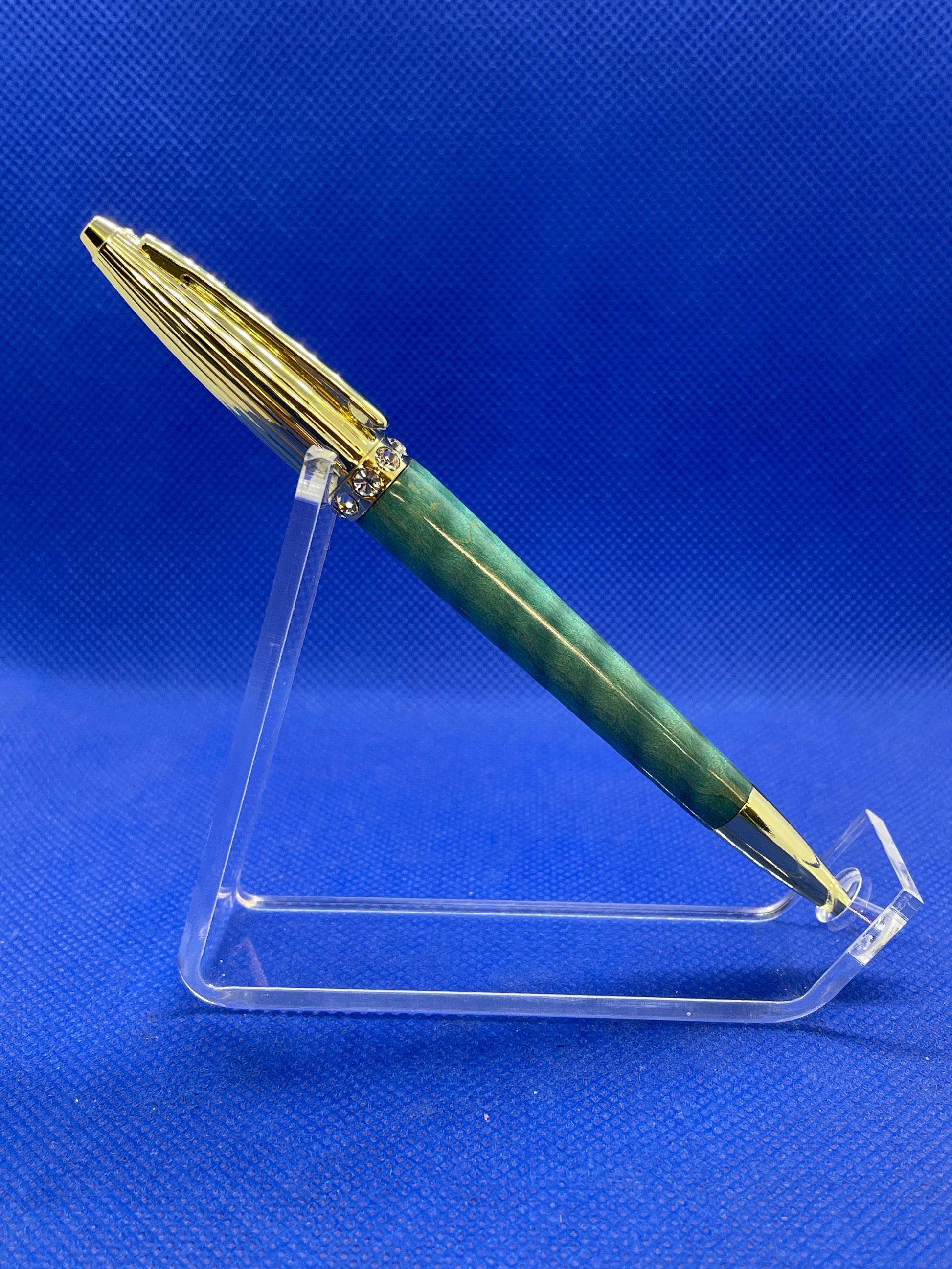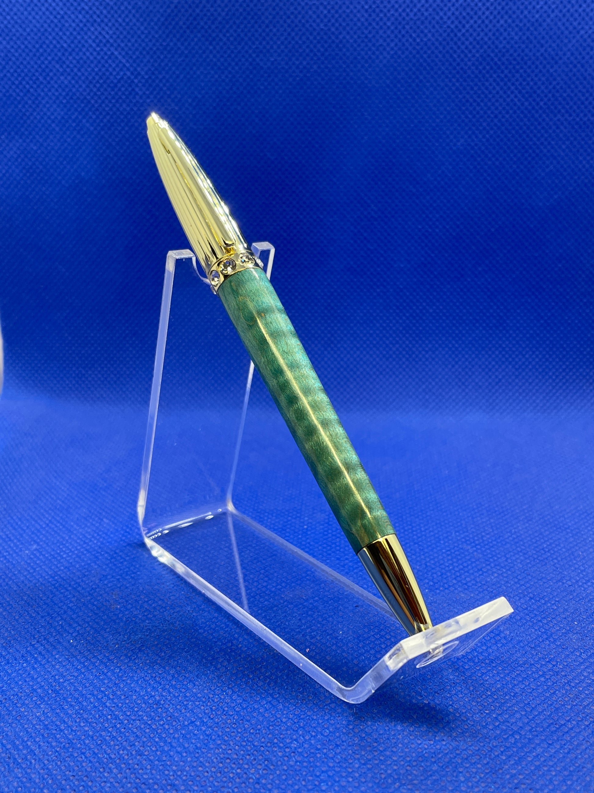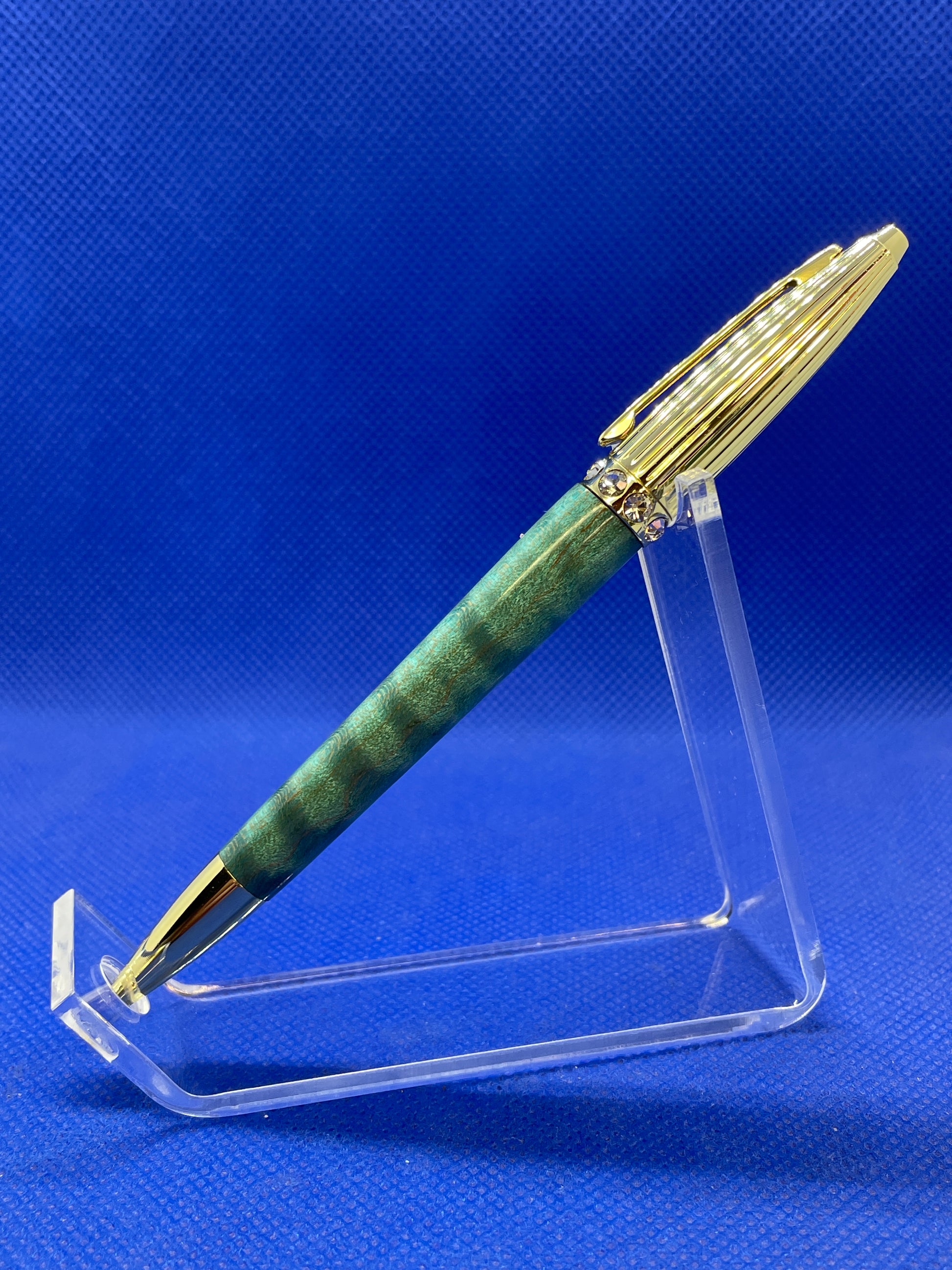 This Duchess ballpoint pen features an elegant ribbed gold top section with eight Swarovski crystals and a "Ocean Blue" curly maple body. This pen is both charming and fun! It uses standard Cross style refills.