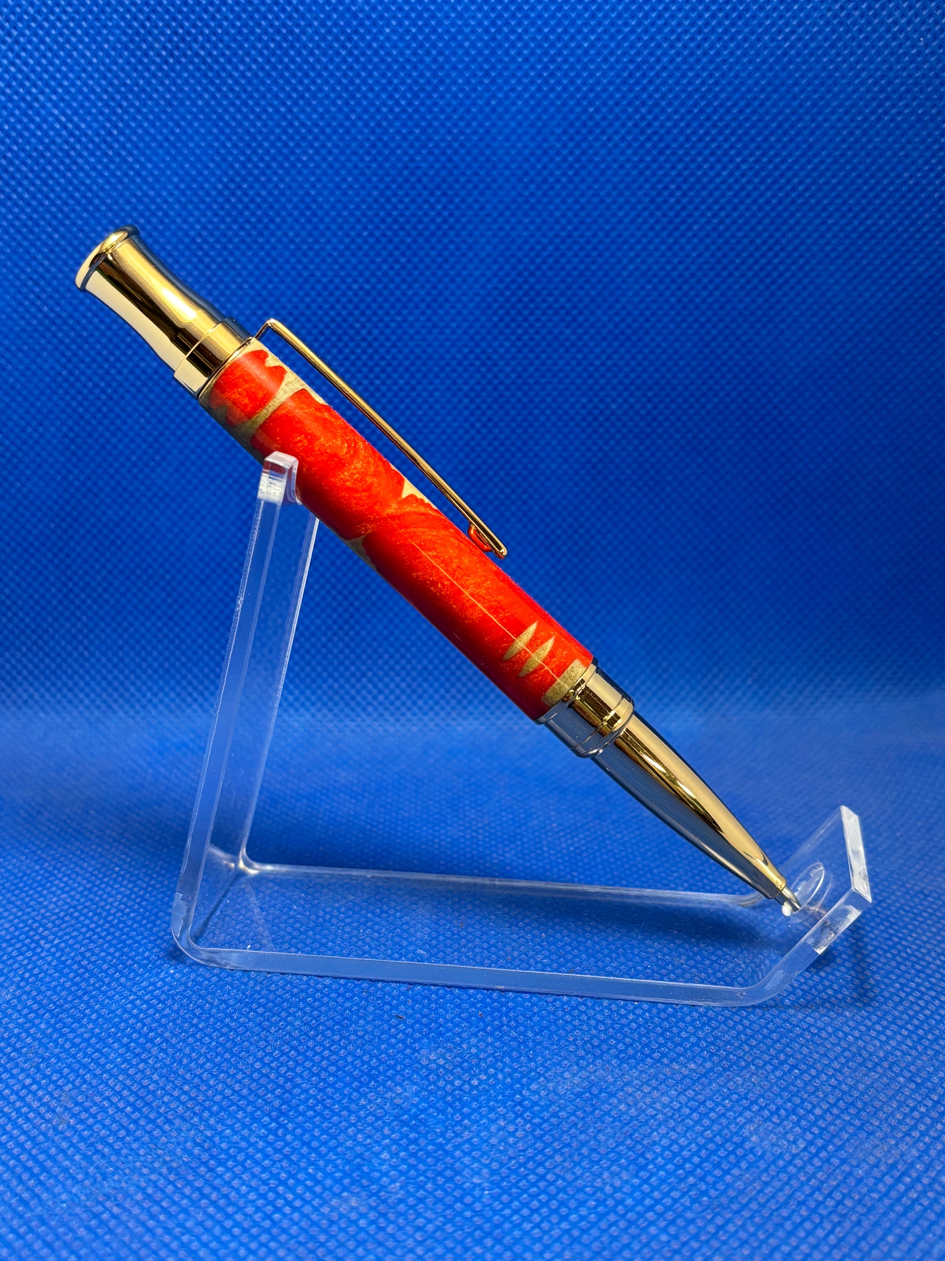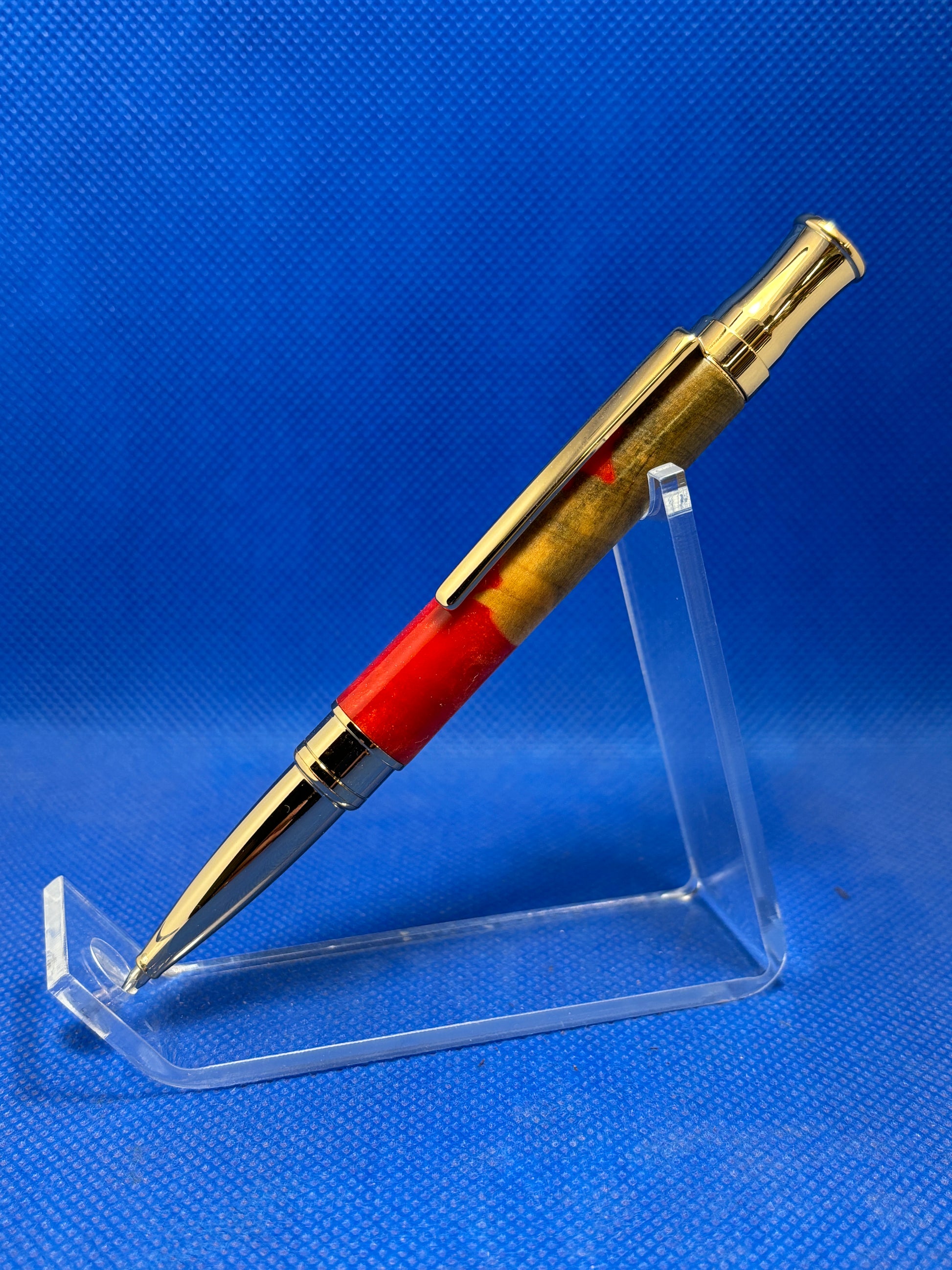 This convertible Etesia pen and pencil features gold metalwork and a "Saffron" curly maple and resin hybrid body. This pen comes with both a pencil mechanism and a ballpoint pen refill and it only takes a few seconds to switch from the pencil unit to the ballpoint refill so you can have one pen that easily accomplishes two tasks! The pen uses "Parker" style refills and the pencil uses 0.7mm leads.