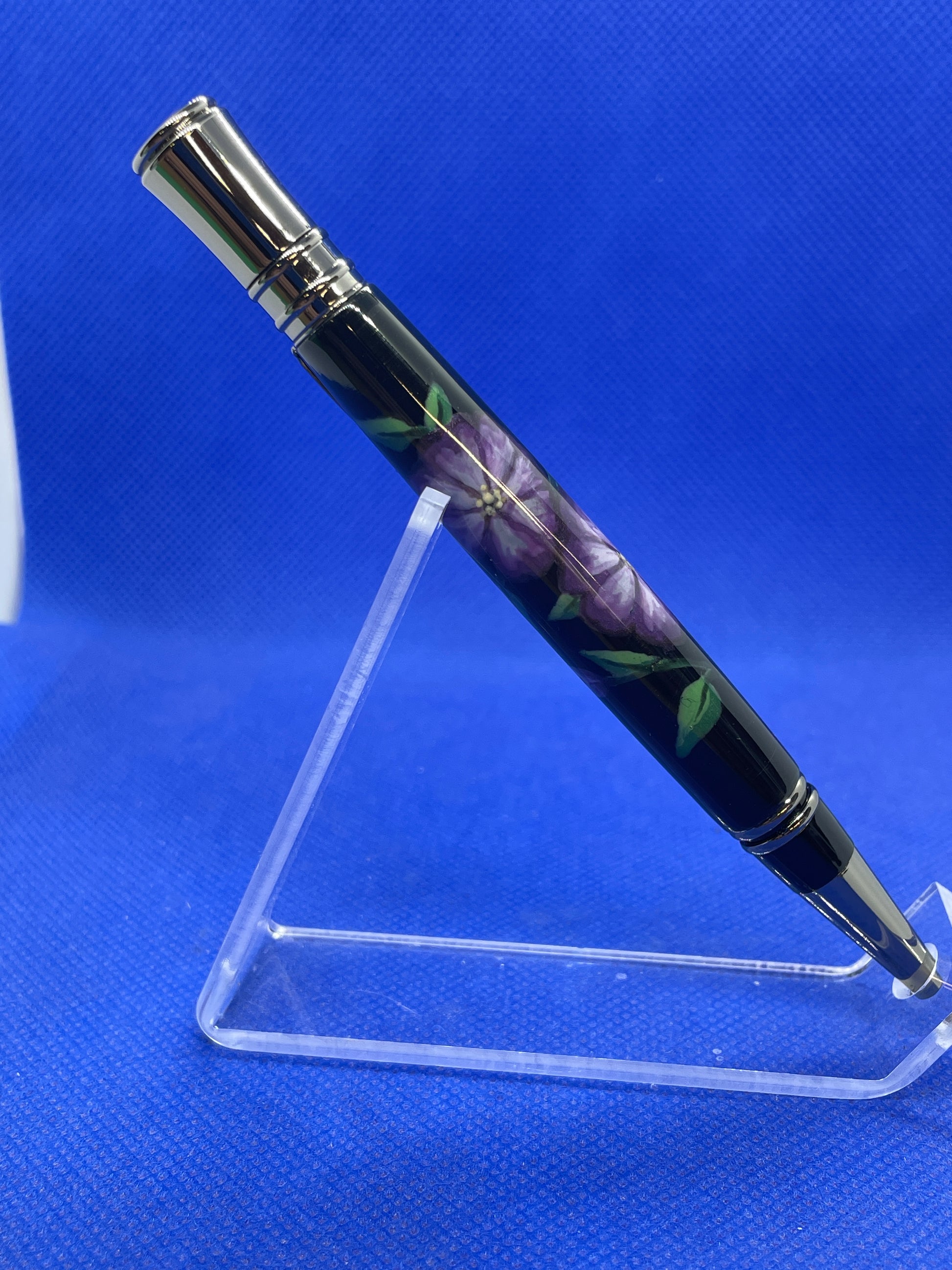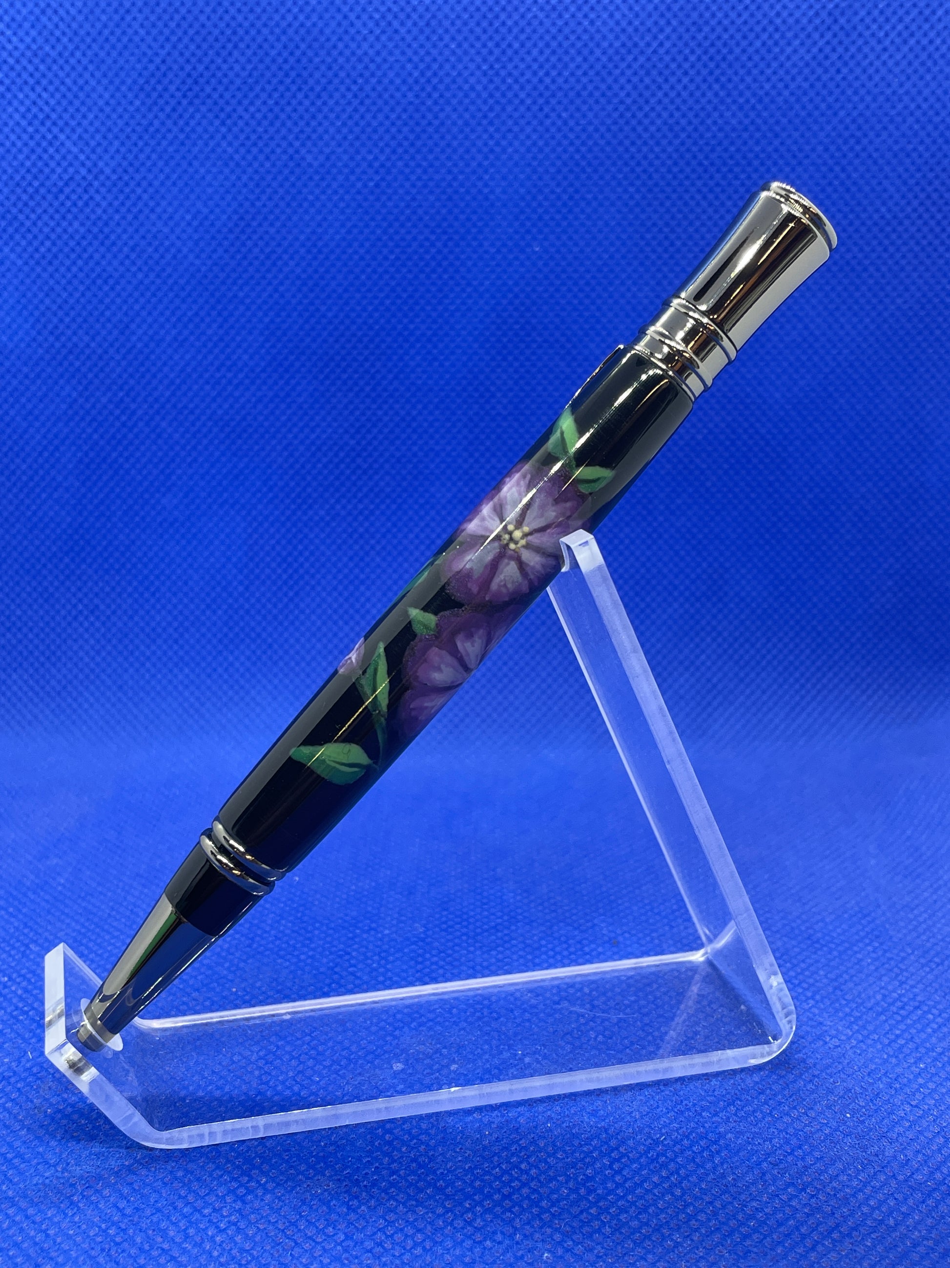 This Executive ballpoint pen features a stunning purple floral design on a black background with gunmetal trim. This hand-painted design was created by our artist Rachel. This is a one-of-a-kind piece that is a functional, stunning art piece for your desk.This pen uses "Parker" style refills.