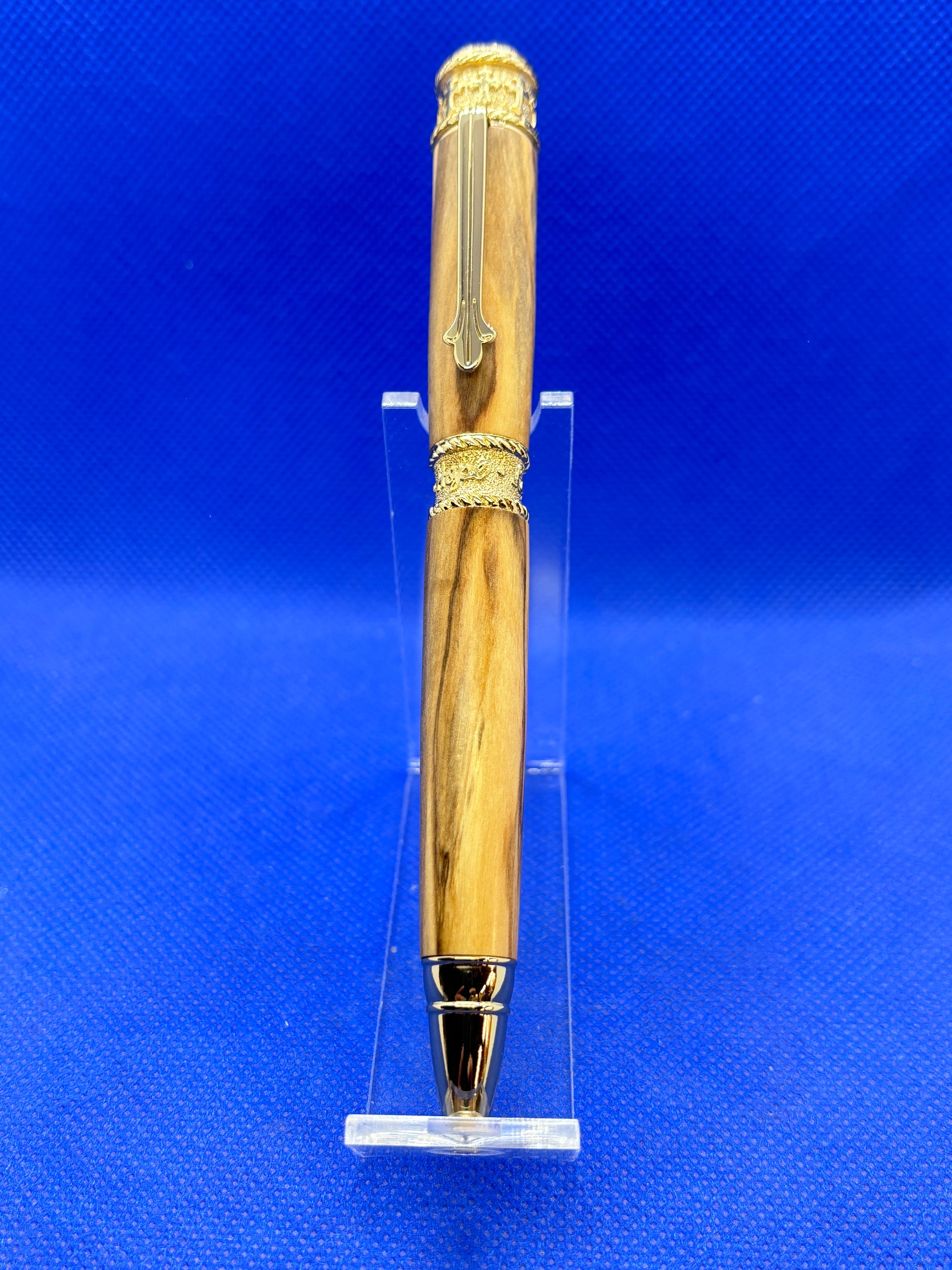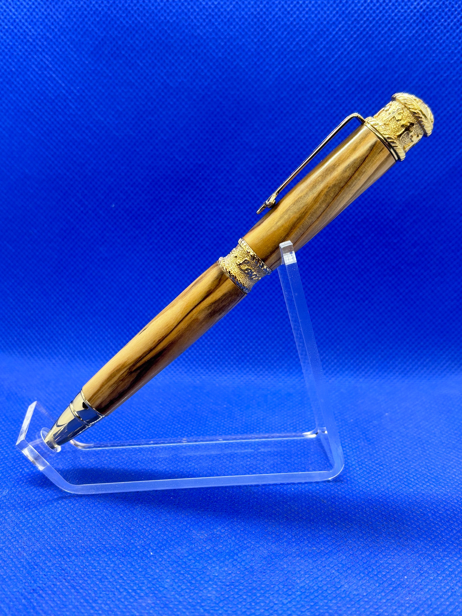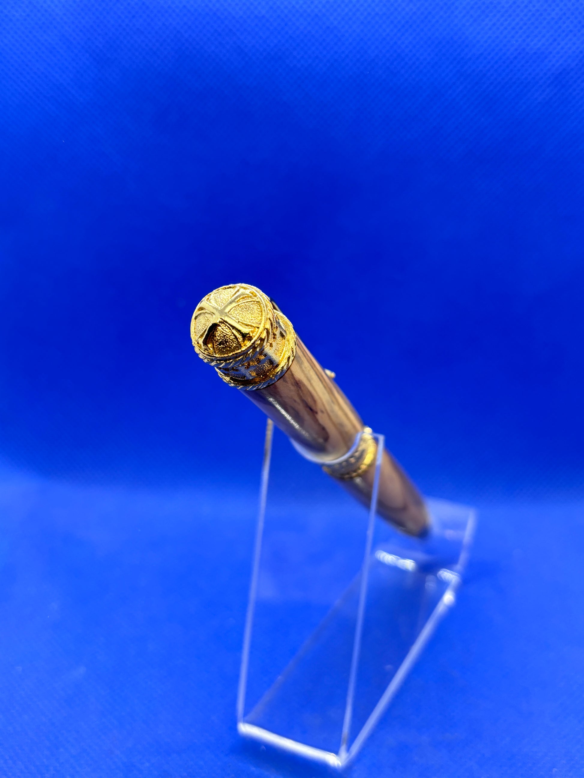 This "Faith" pen has a multifaceted design. "Faith" "Hope" and "Love" are cast into the center band, and the pen top features attractive cross designs. The Cross on the tips and clips are reference to the Fleur-de-lis. In the Middle Ages the symbols of lily and Fleur-de-lis overlapped considerably in Christian religious art. The three petals of the heraldic design reflect a widespread association with the Holy Trinity. Here we are using the three to symbolize the virtues of Faith, Hope and Love. The braided rope detail reinforces the concept of trinity, with a braided rope being made from three separate stands into something much stronger. This pen uses standard Parker style refills.