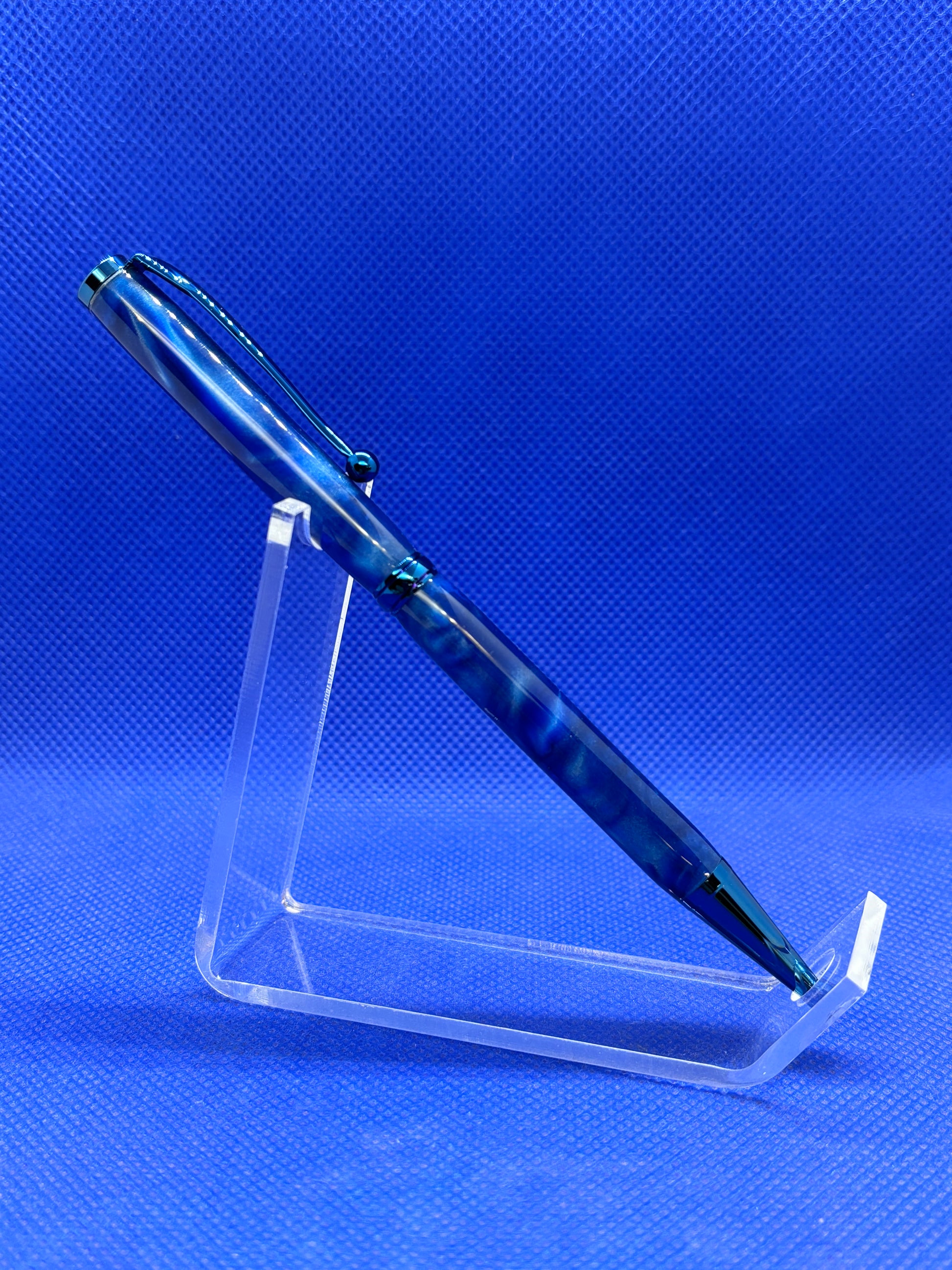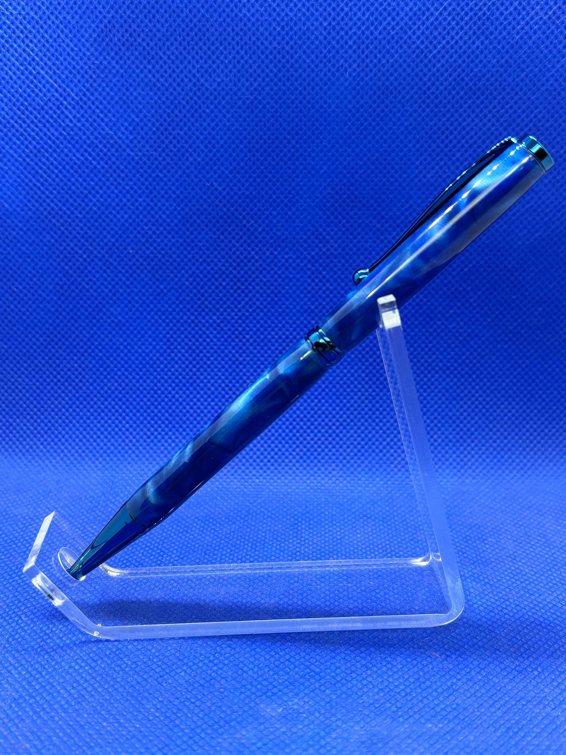 This Fancy Slimline ballpoint pen features Blue Titanium trim and a"Blue Macaw" acrylic acetate body. This pen uses "Cross" style refills.