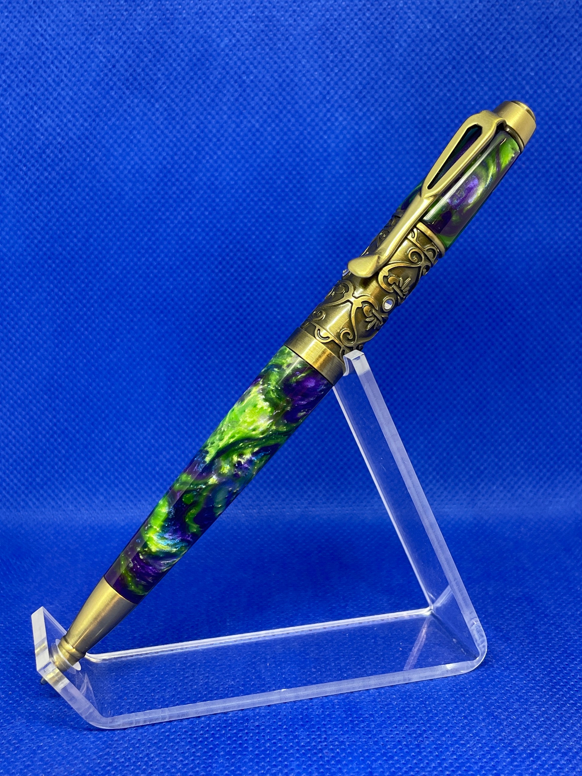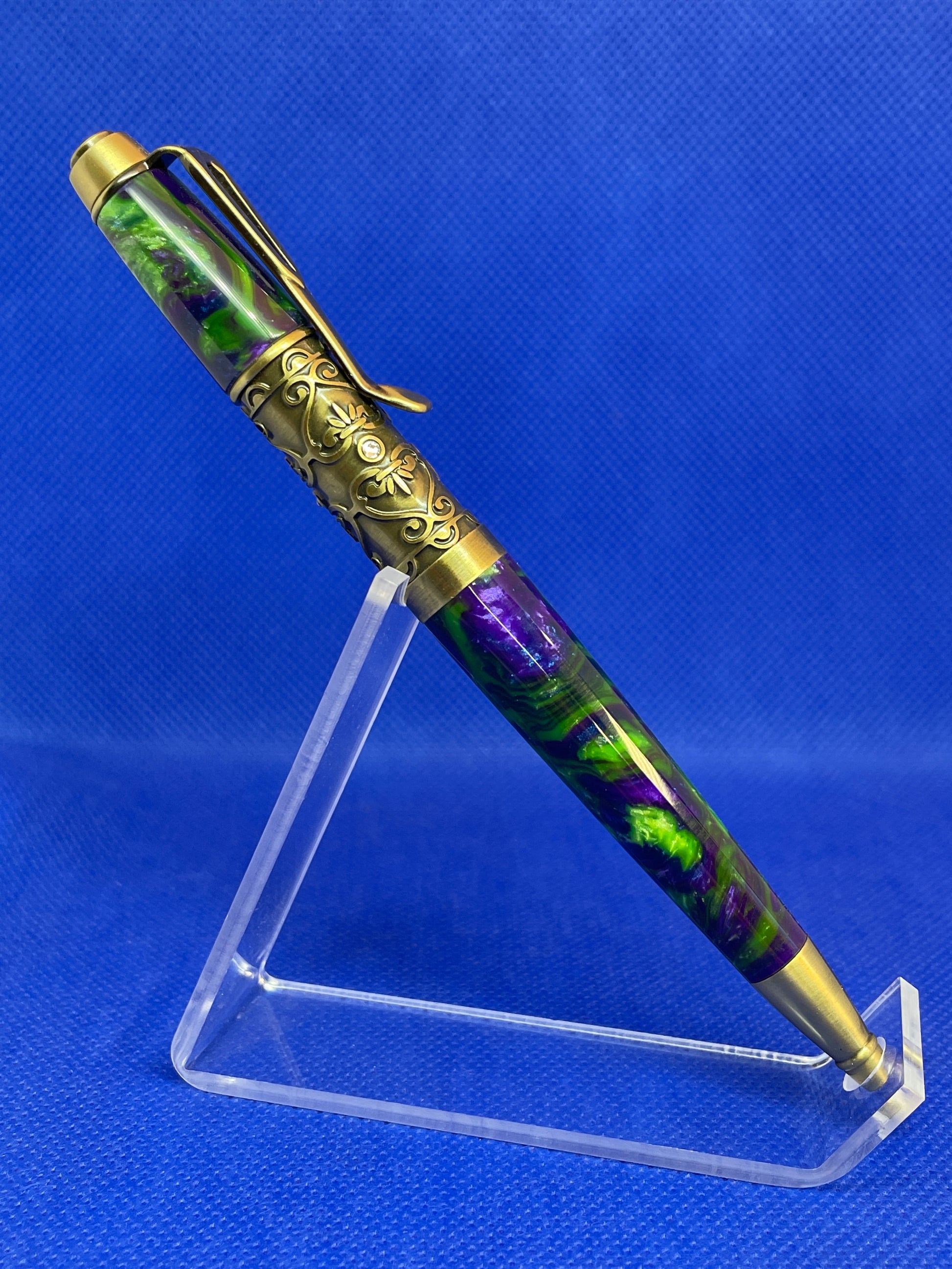 This Fillibelle ballpoint pen features a Claude Monet inspired "Water Lily" acrylic body with deep colours and an iridescent sheen. The antique brass trim is decorated with an ornate filigree design that is embellished with three inlaid Swarovski crystals. This pen is a stunning art piece that you will cherish for years. This pen comes in carbon fibre style box and uses "Cross" style refills.