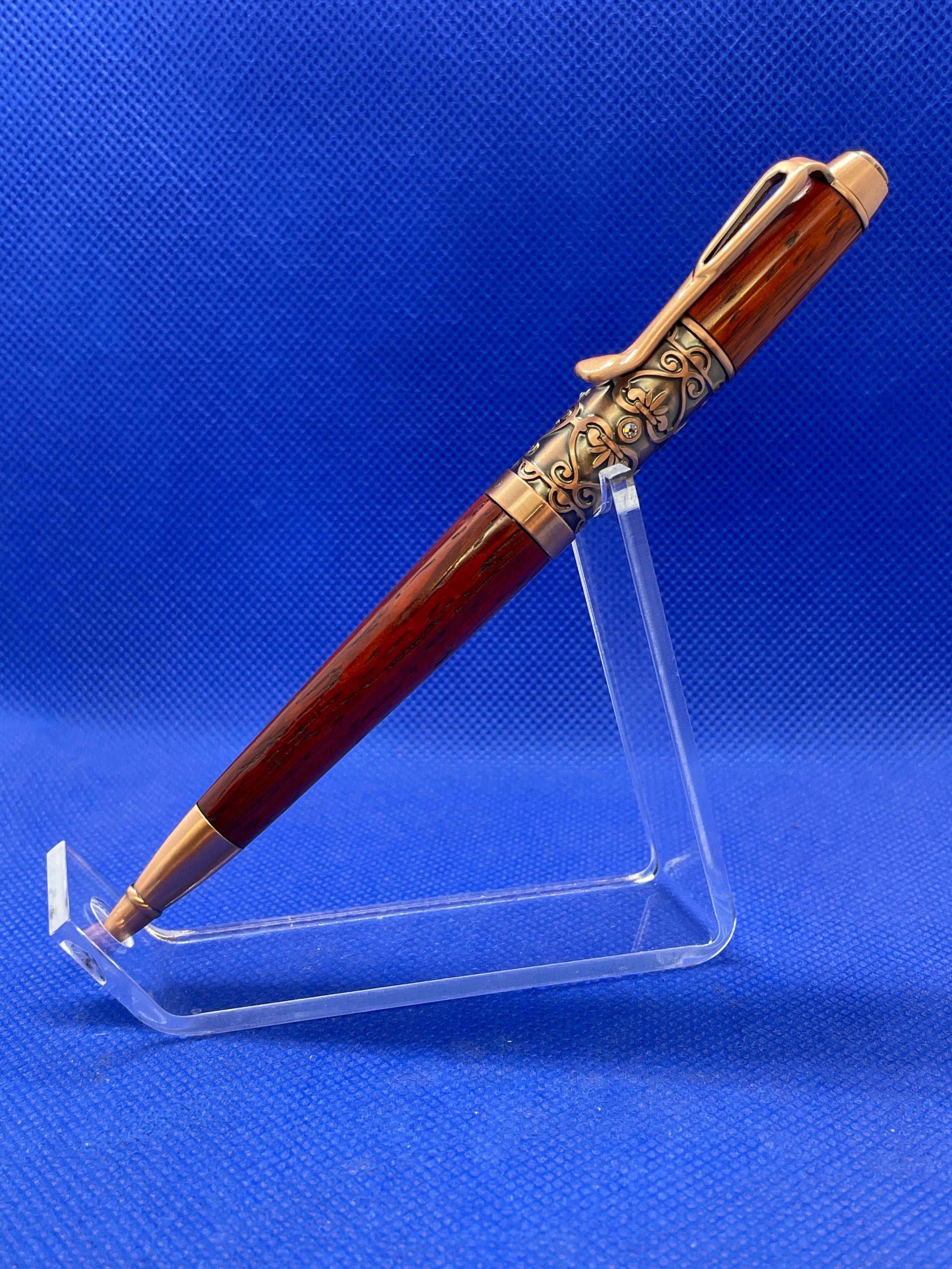 This Fillibelle ballpoint pen features a dramatic looking Padua wood body and copper metalwork. This metalwork is decorated with an ornate filigree design that is embellished with three inlaid Swarovski crystals. This pen uses "Cross" style refills.